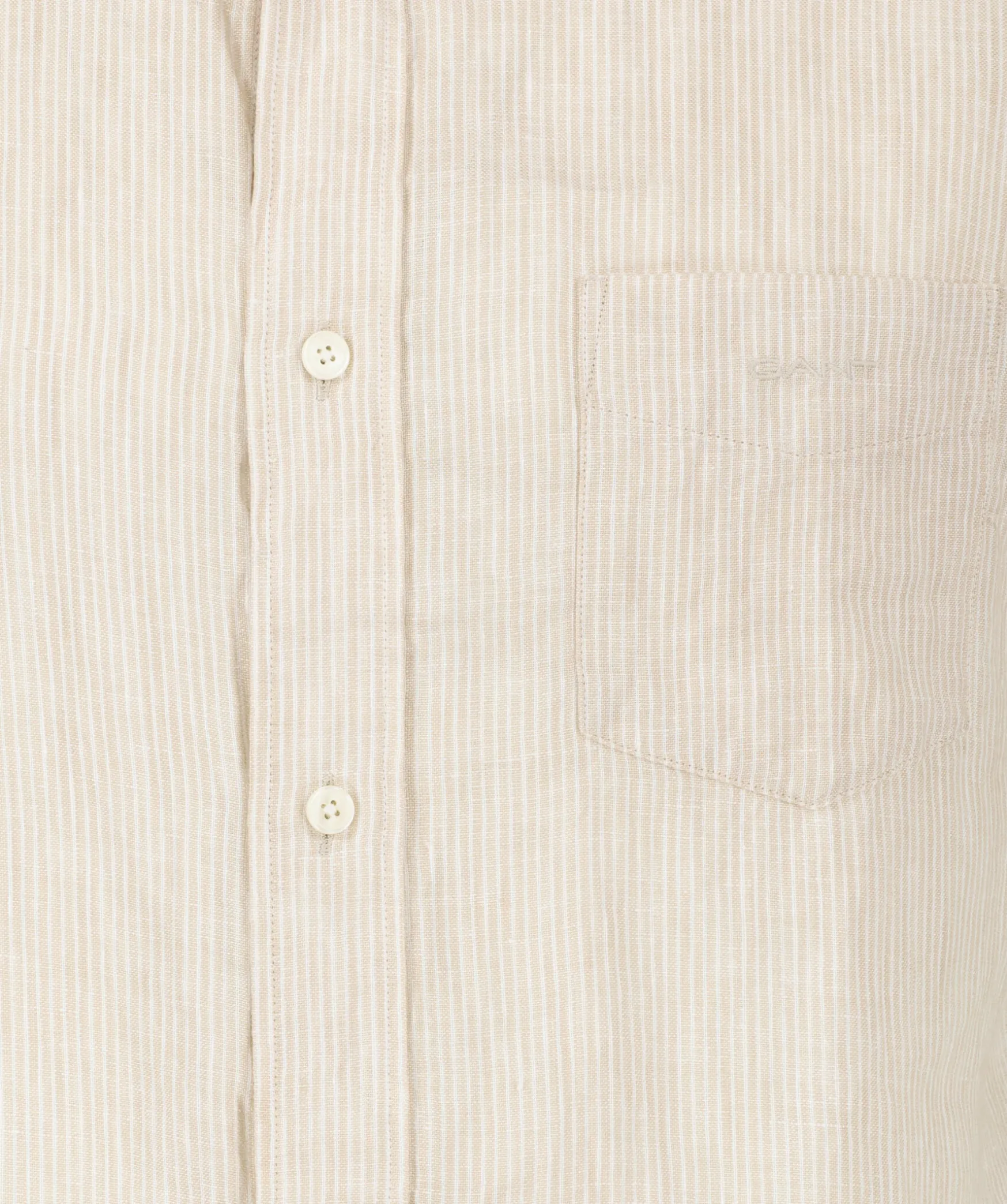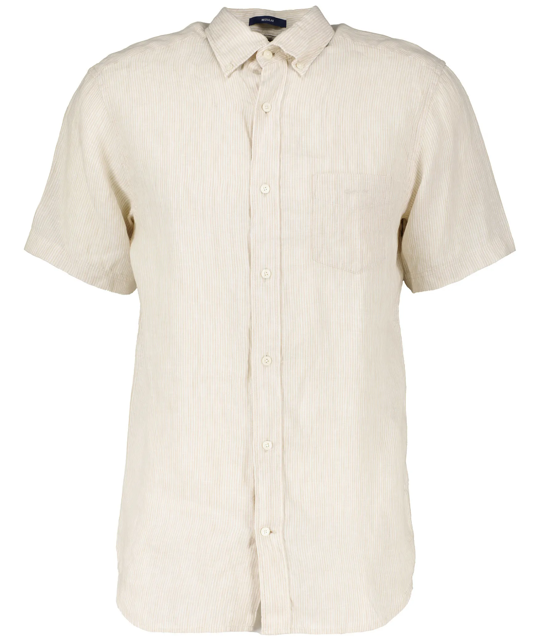 Beige Och Vit Randig, Kortarmad Skjorta I En Normal Passform Fran Gant. Tillverkad I 100% Linne. Brostficka Med Liten Logotyp. Button Down Krage.