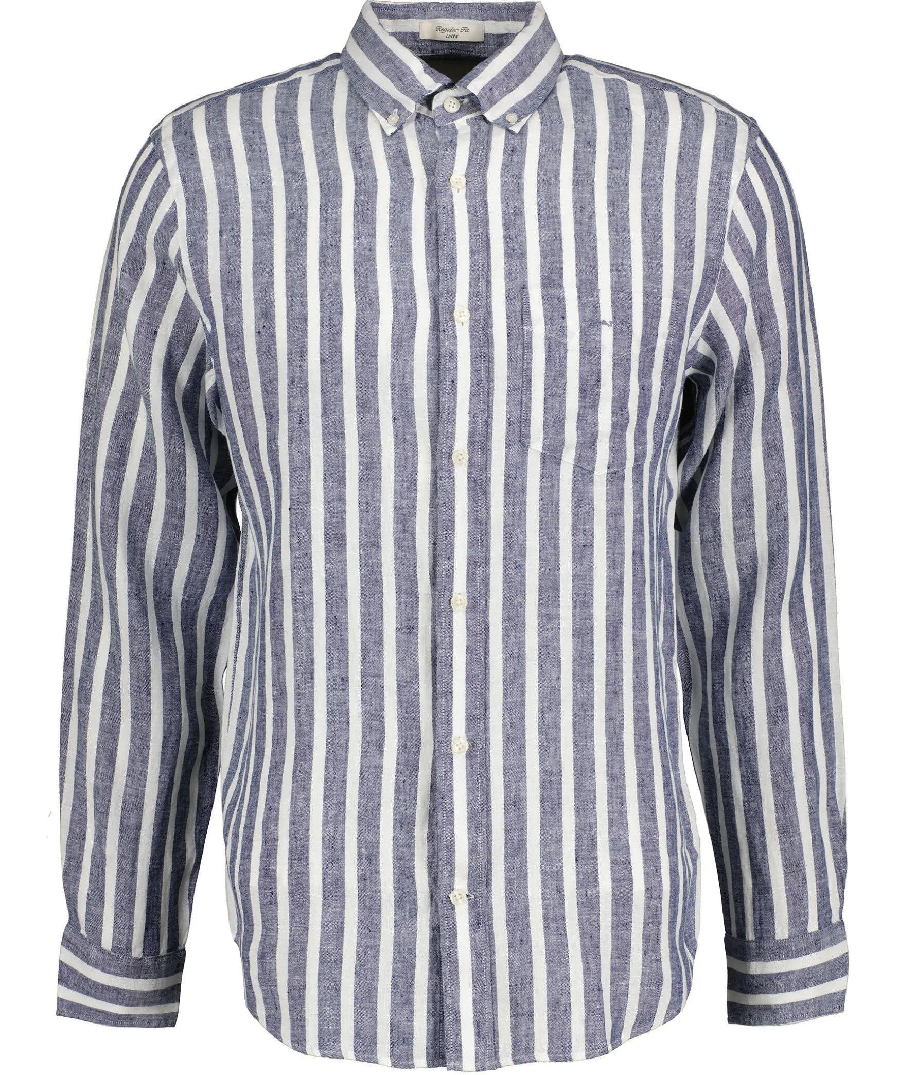 Morkbla Och Vit Randig Linneskjorta I Ett Perfekt Sommarmaterial Med Yarn-Dyed Tvatt Fran Gant. Tillverkad I 100% Lin. Broderad Gant-Logotyp Pa Brostfickan. Skjortan Har En Rundad Fall Och Normal Passform. Boxpleat Med Locker Loop I Ryggen.