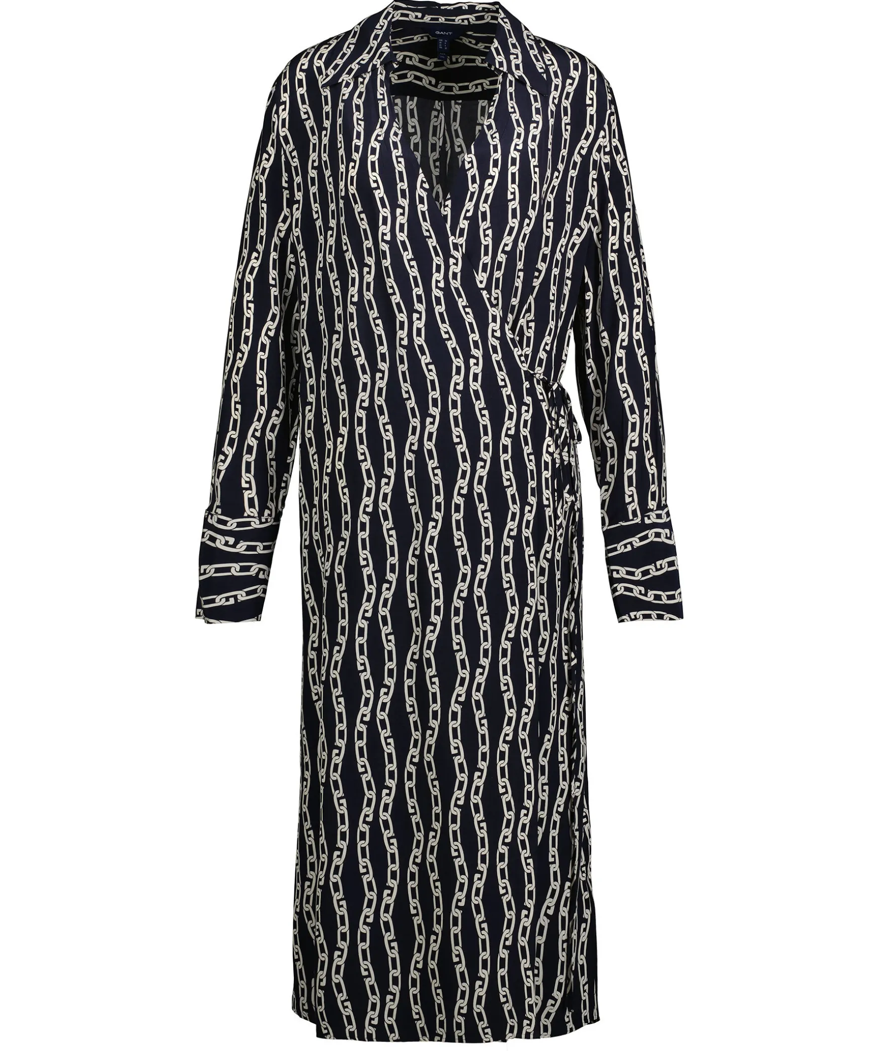 Marinbla, Langarmad Omlottklanning Med Ett Heltackande Kedjemonster I Vitt Fran Gant. En Langd Som Slutar Strax Nedanfor Knat Och Breda Manschetter Med Tva Knappar Och Knytband I Midjan. V-Ringning Fram Och En Fin, Spetsig Krage Fram.