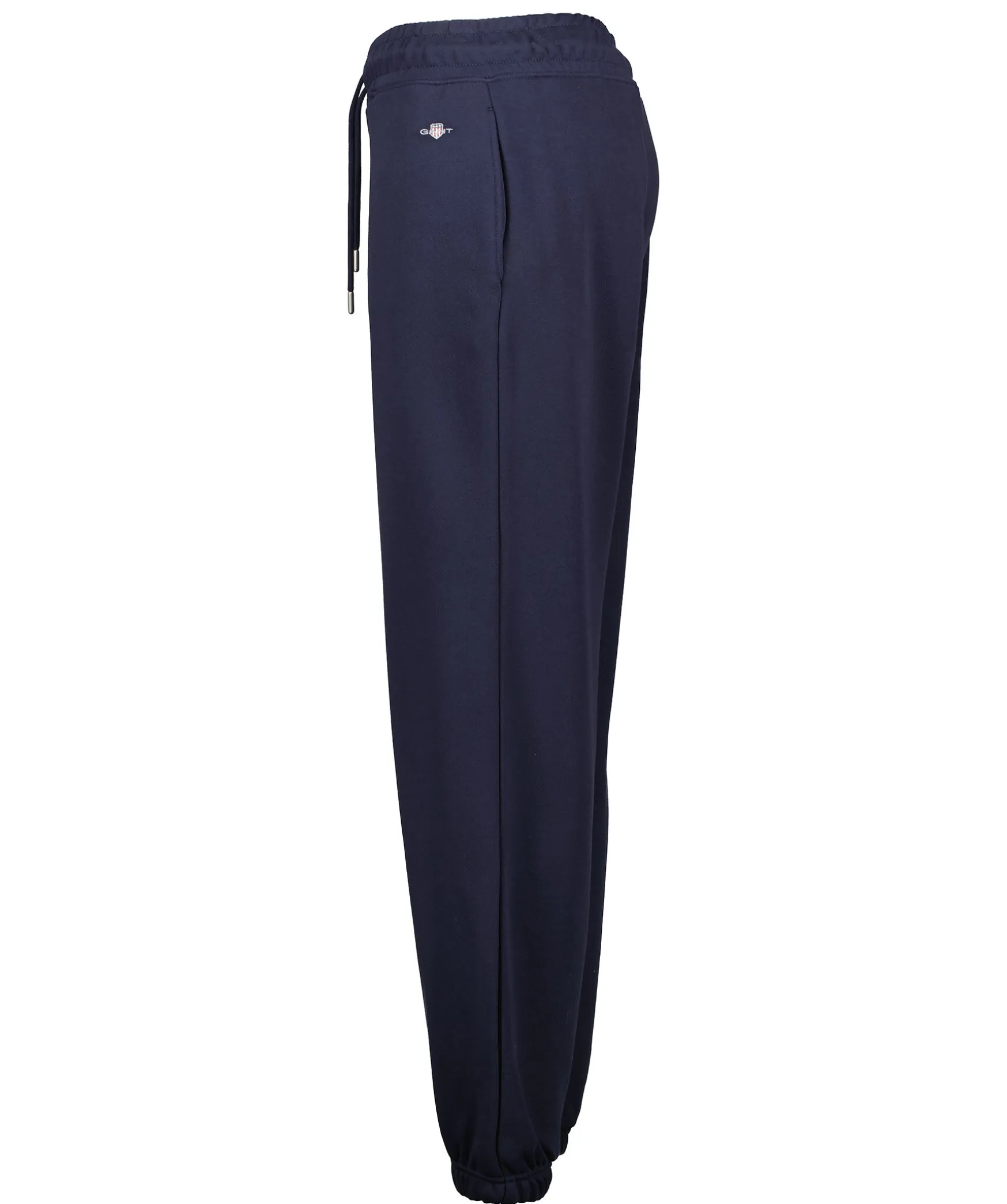 Marinblaa Sweatpants Med Liten Skoldlogotyp Broderad Pa Ena Benet Fran Gant I En Snygg Kombination Av Klassiskt Preppy Och Modernt Streetwear. Byxorna Ar Gjorda I En Mjuk Bomullsblandning Och Har En Mellanhog Midja, Relaxed Fit, Resarmuddar, Dragsko I Midjan Och Sidfickor.