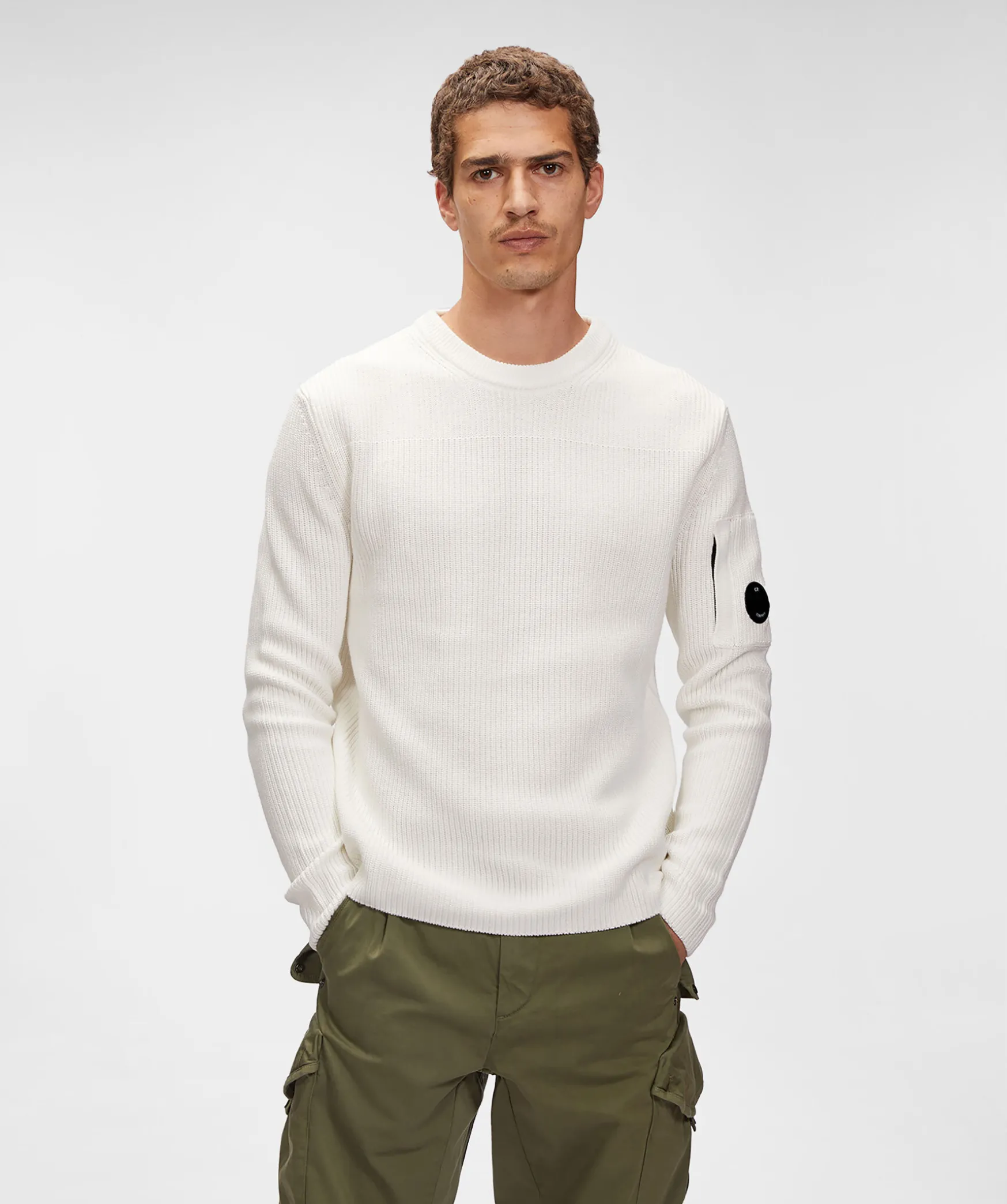 Vit Ribbstickad Troja Fran C.P Company. Tillverkad I 100% Bomull. Ficka Pa Vanster Arm Med Dold Dragkedja Och Runt Patch I Plast Med Logotyp. Rundad Halsringning.