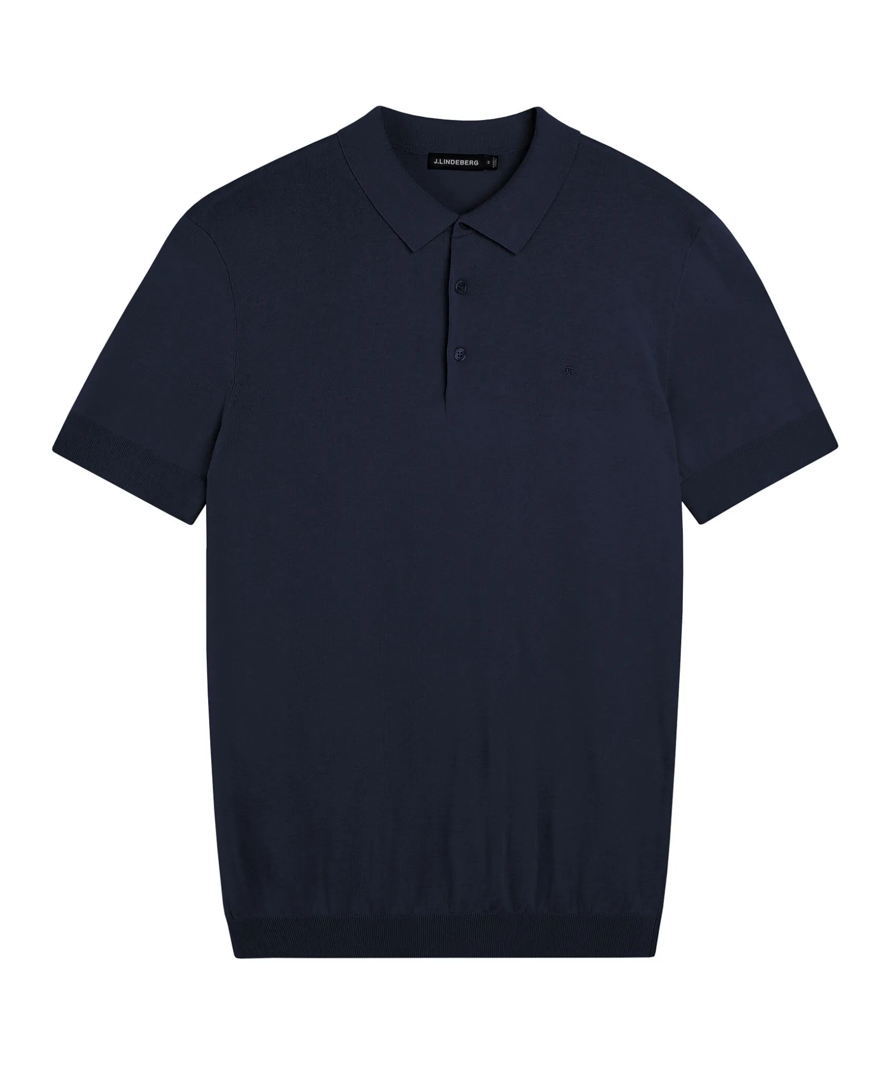 Morkbla Finstickad Pike Fran J Lindeberg. Ribbstickade Muddar Vid Arm Och Plaggslut. Platt Stickad Krage, Tre Knappar. Broderad Logotyp Pa Brostet. Smal Passform.