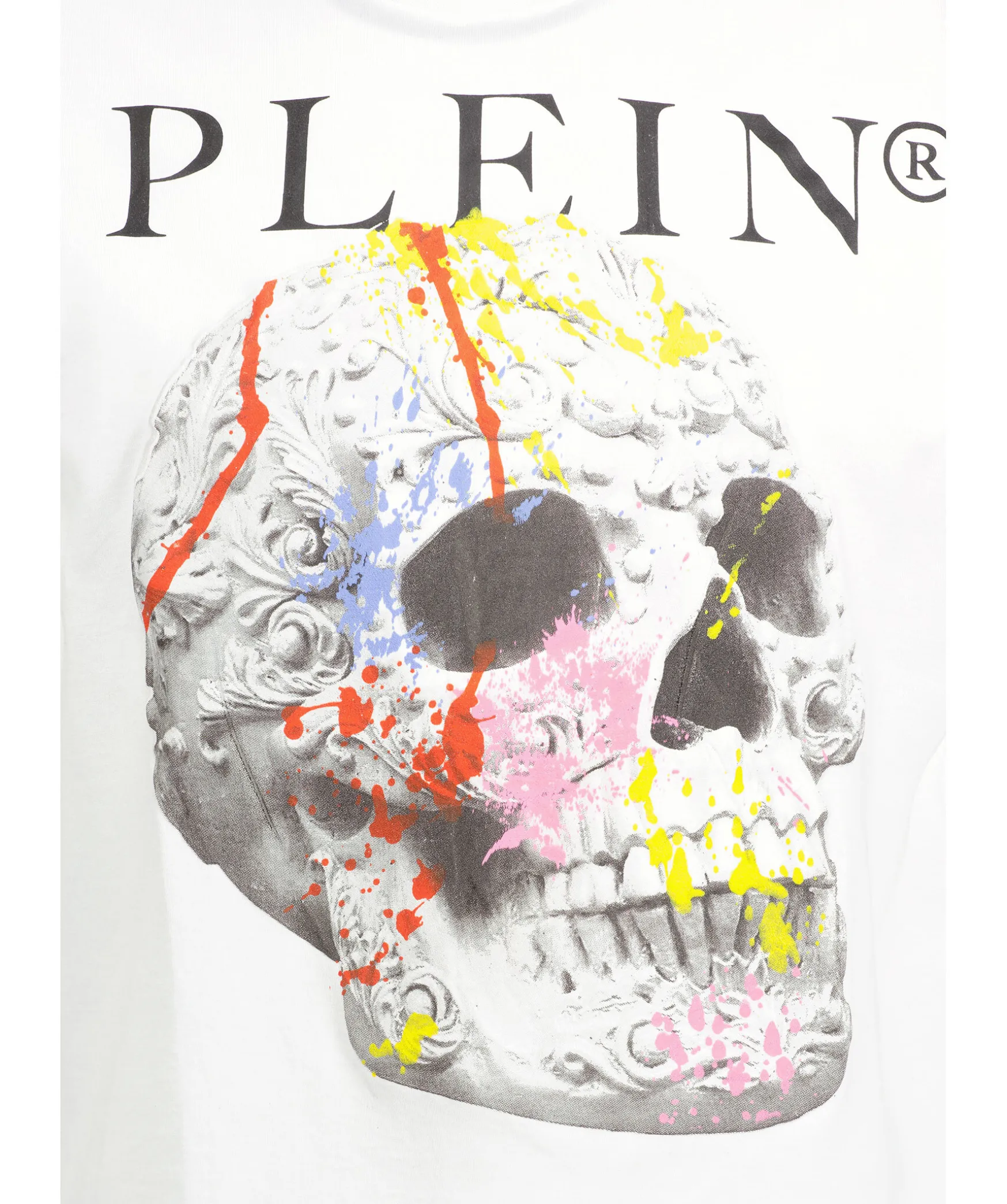 Vit T-Shirt Fran Philipp Plein Med Multifargat Tryck Pa Magen. Tillverkad I 100% Bomull. Rundad Halsringning Med Ribbstickad Mudd. Svart Patch Med Logotyp I Metall.