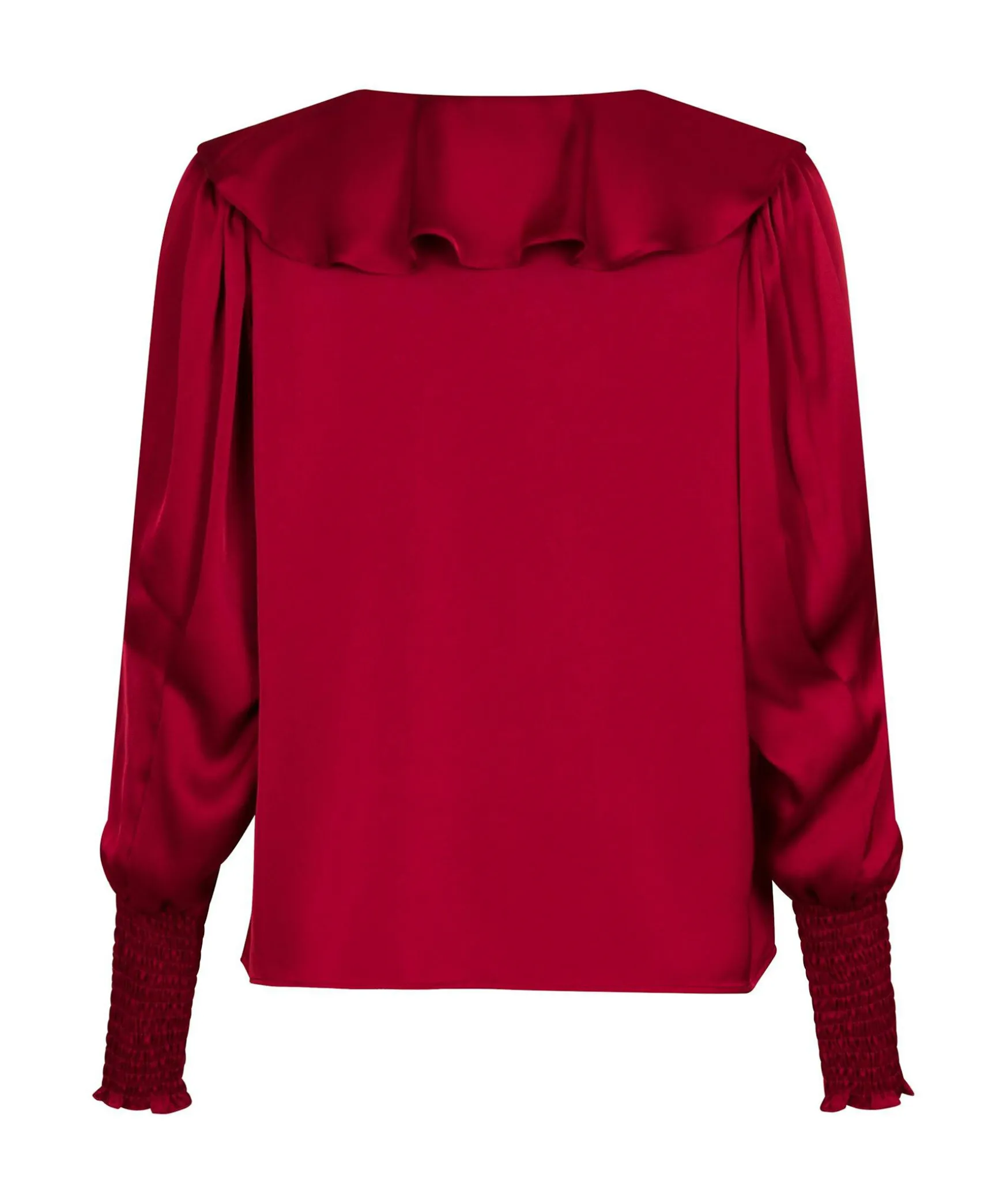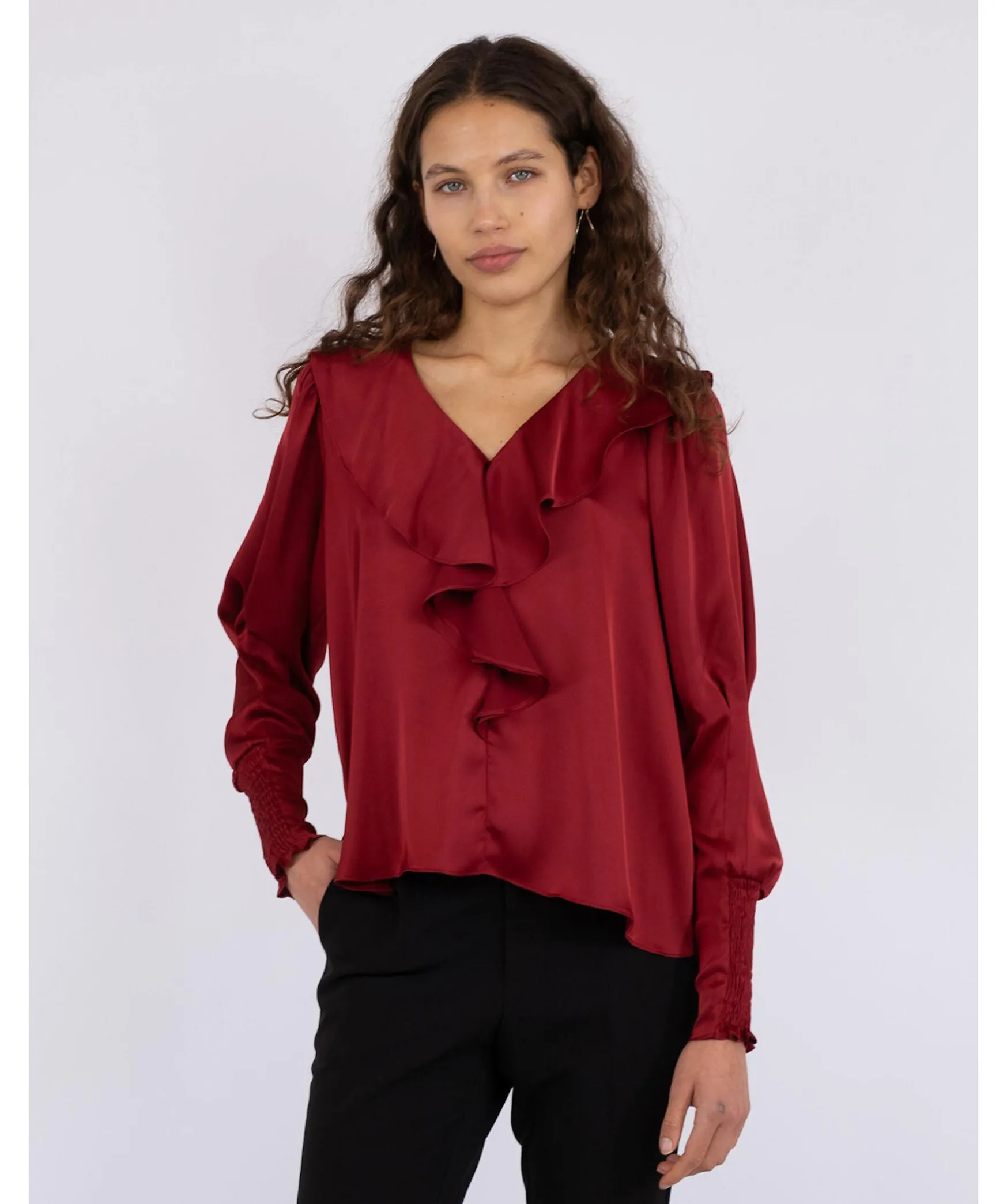 Vinrod, Feminin Blus Fran Neo Noir. Blusen Har Volangkrage Och V-Ringning Och Ar Tillverkad I Mjuk Satin. Armsluten Ar Forsedda Med En Mjuk Smock.
