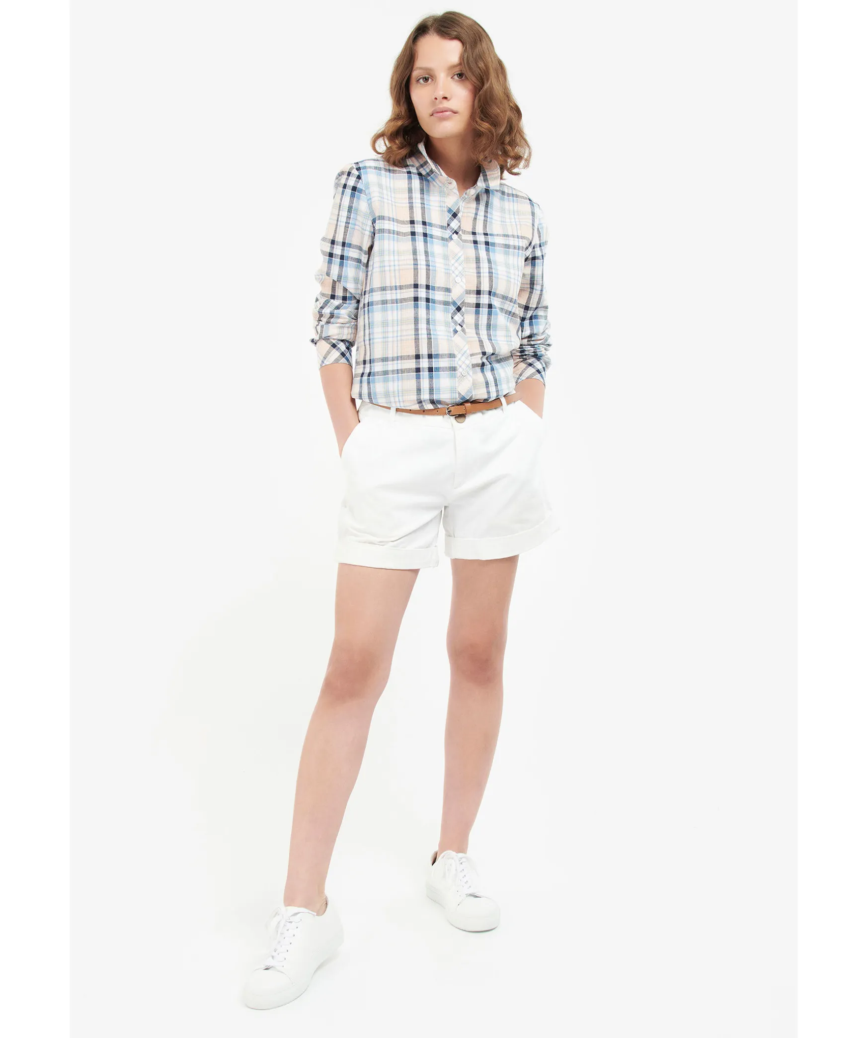 Rutig Skjorta I Beige, Blatt Och Vitt Fran Barbour I En Avslappnad Passform. Nagot Langre Baktill, En Brostficka Och Langa Armar Med Tva Knappar I Armslut. Gjord I En Luftig Blandning Av Bomull Och Lin Och Har Vita Knappar Hela Vagen Fram. Liten Bricka Fastsydd I Metall I Nacken Med Graverad Logotyp.