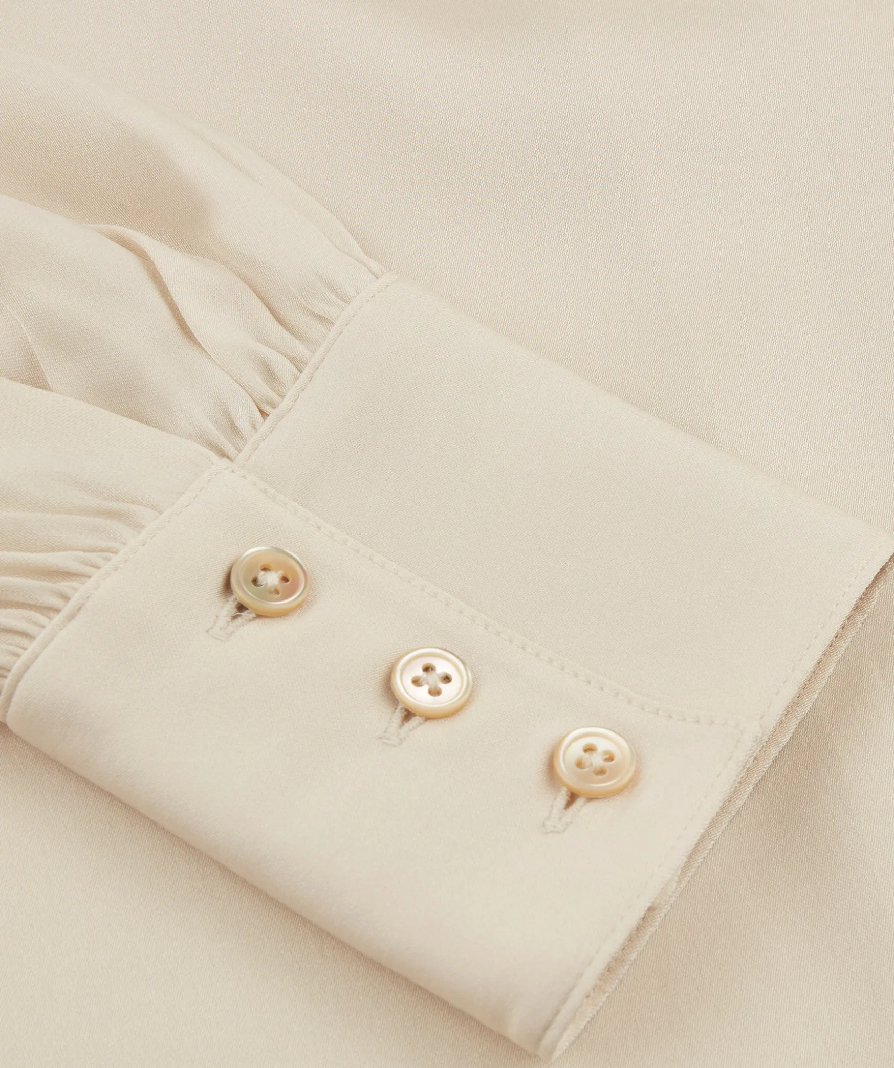 Kramvit Blus Med Rosettkrage Fran Stenstroms. Tillverkad I En Glansande Silkesstretch Och Skuren For En Feminin Siluett. Extra Stretch Sakerstaller Komfort Och En Smickrande Passform. Dold Knappning Framtill, Mudd Vid Armslut Som Ger En Puffig Effekt Samt Krage Som Man Kan Lata Hanga Eller Knyta Som En Rosett Vid Halsen.