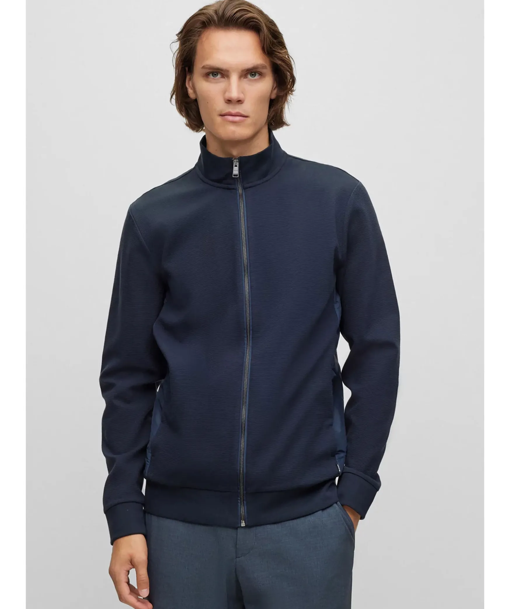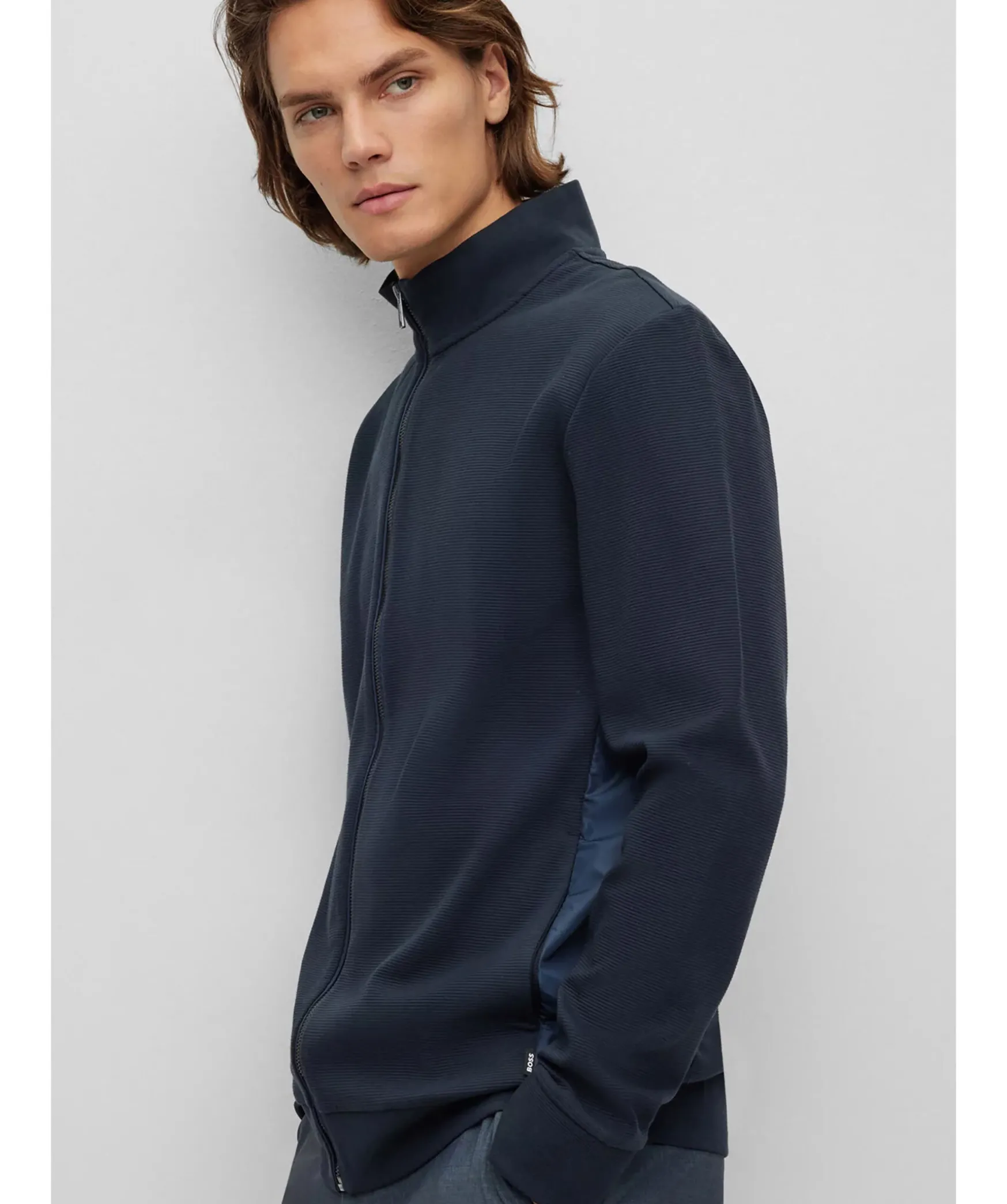Morkbla Zip-Up Troja Fran Boss Black. En Sweatshirt Med Blixtlas I Regular Fit Och Med Stakrage. Trojan Ar Designad I Ottomanstrukturerad Merceriserad Bomull Med Tonala Sidopaneler Och Dolda Fickor. Normal Passform.