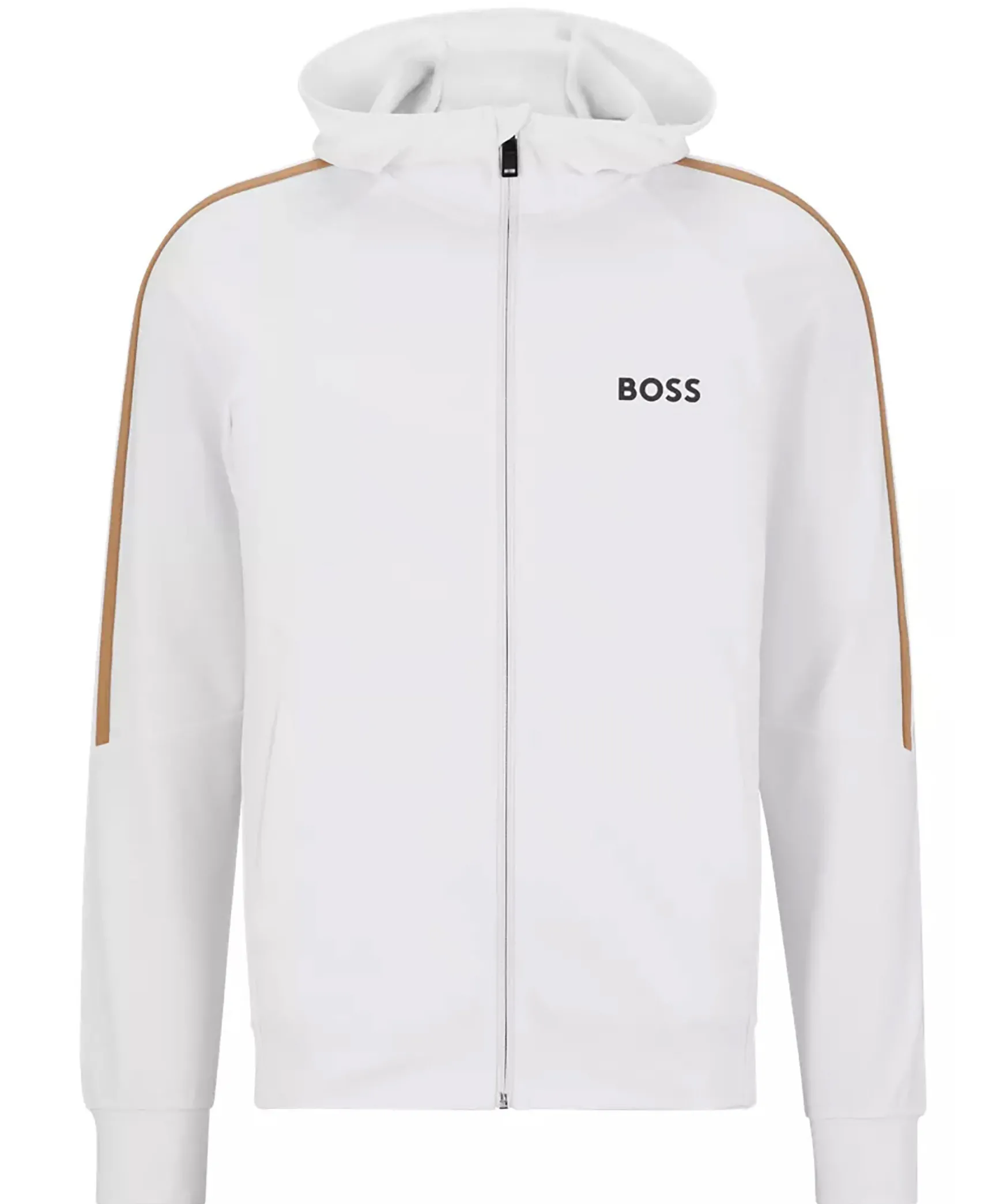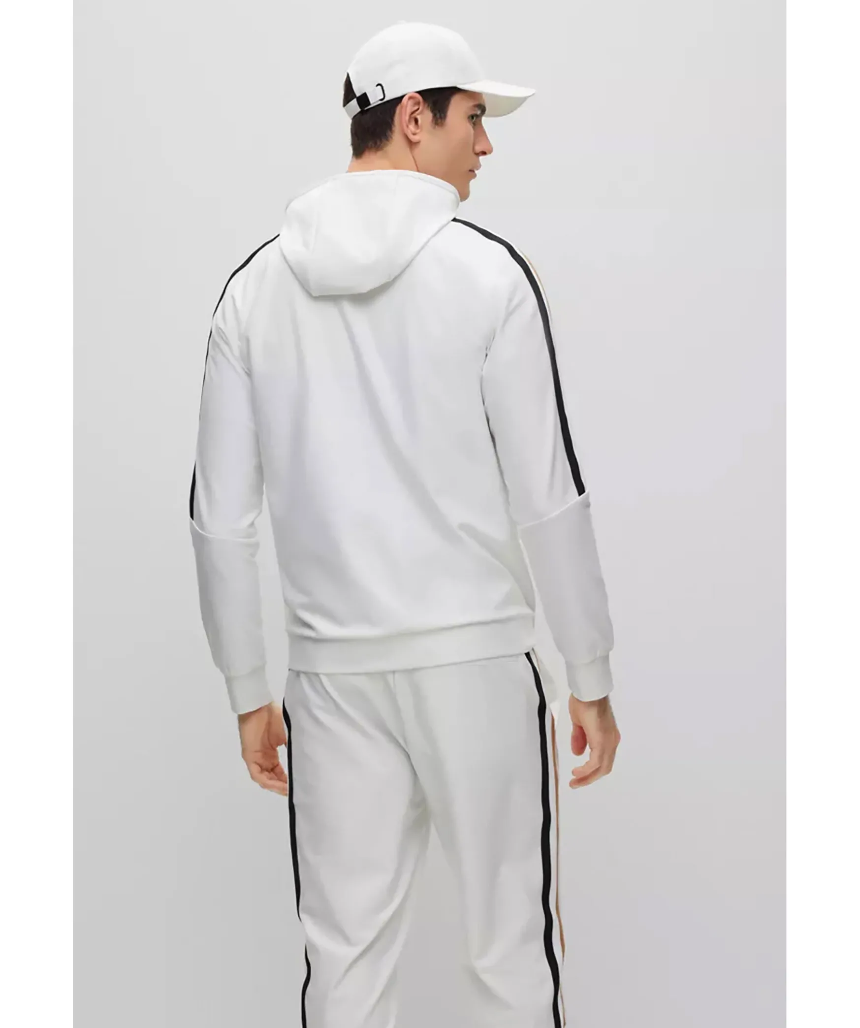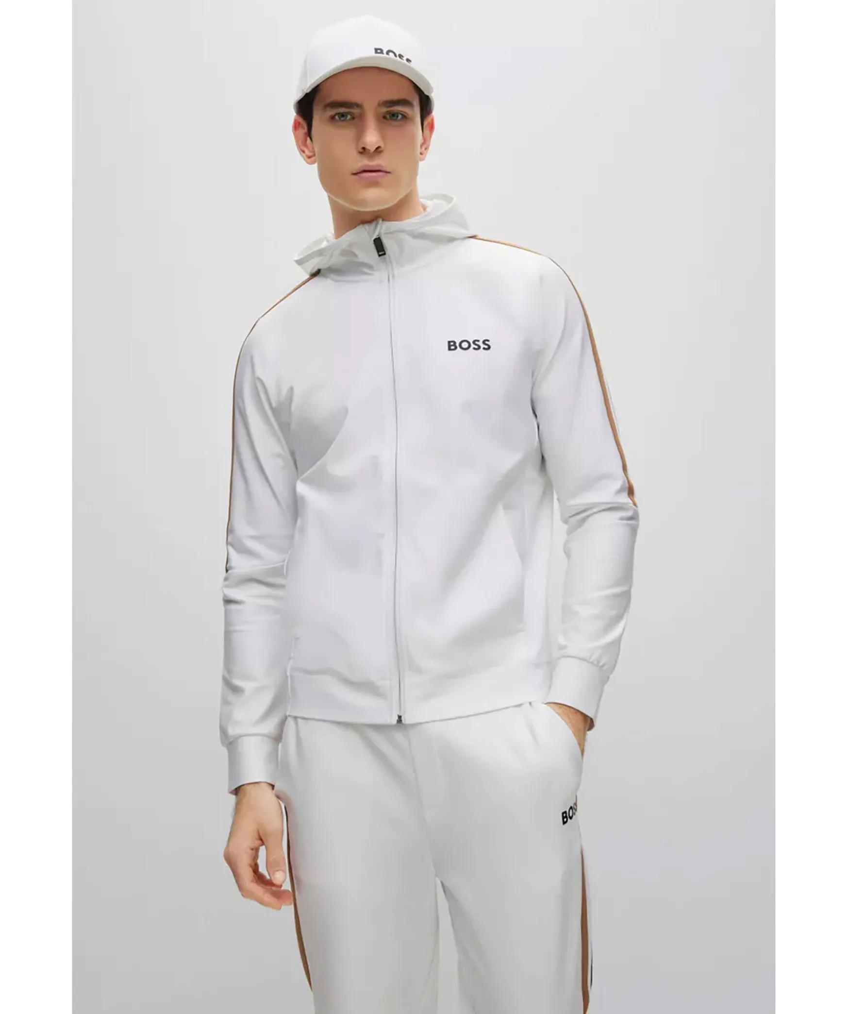 Vit Hoodie Med Dragkedja I Normal Passform I Stretchjersey Fran Boss Green. Signaturrevar Langs Axlarna Och Logotyp Pa Vanster Sida Pa Brostet. Luva Hog Krage, Sidofickor Samt Muddar I Armslut Och Plaggslut. En Del Av Den Dynamiska Kapselkollektionen Boss X Matteo Berrettini, Skapad Av Den Italienska Professionella Tennisspelaren.