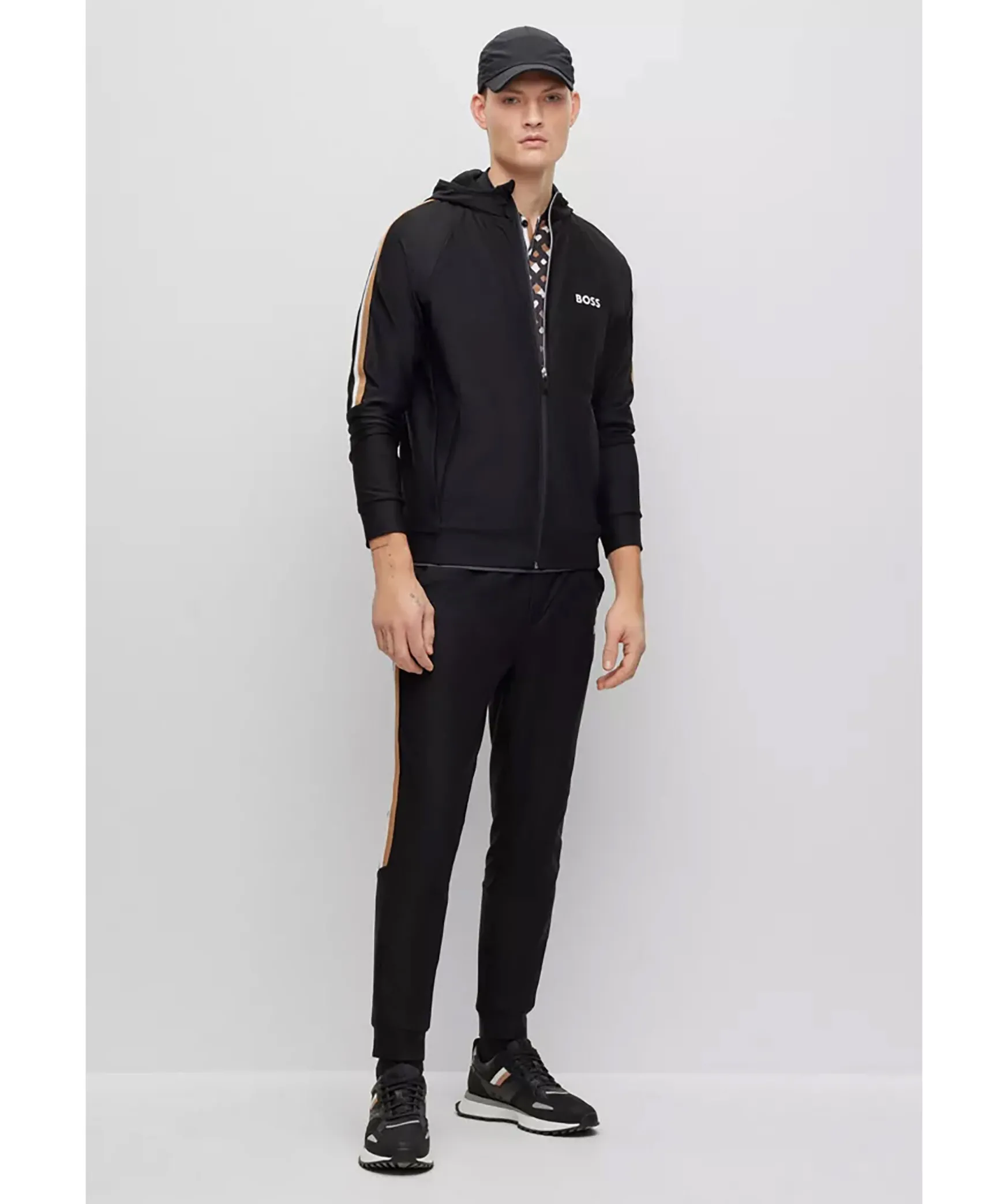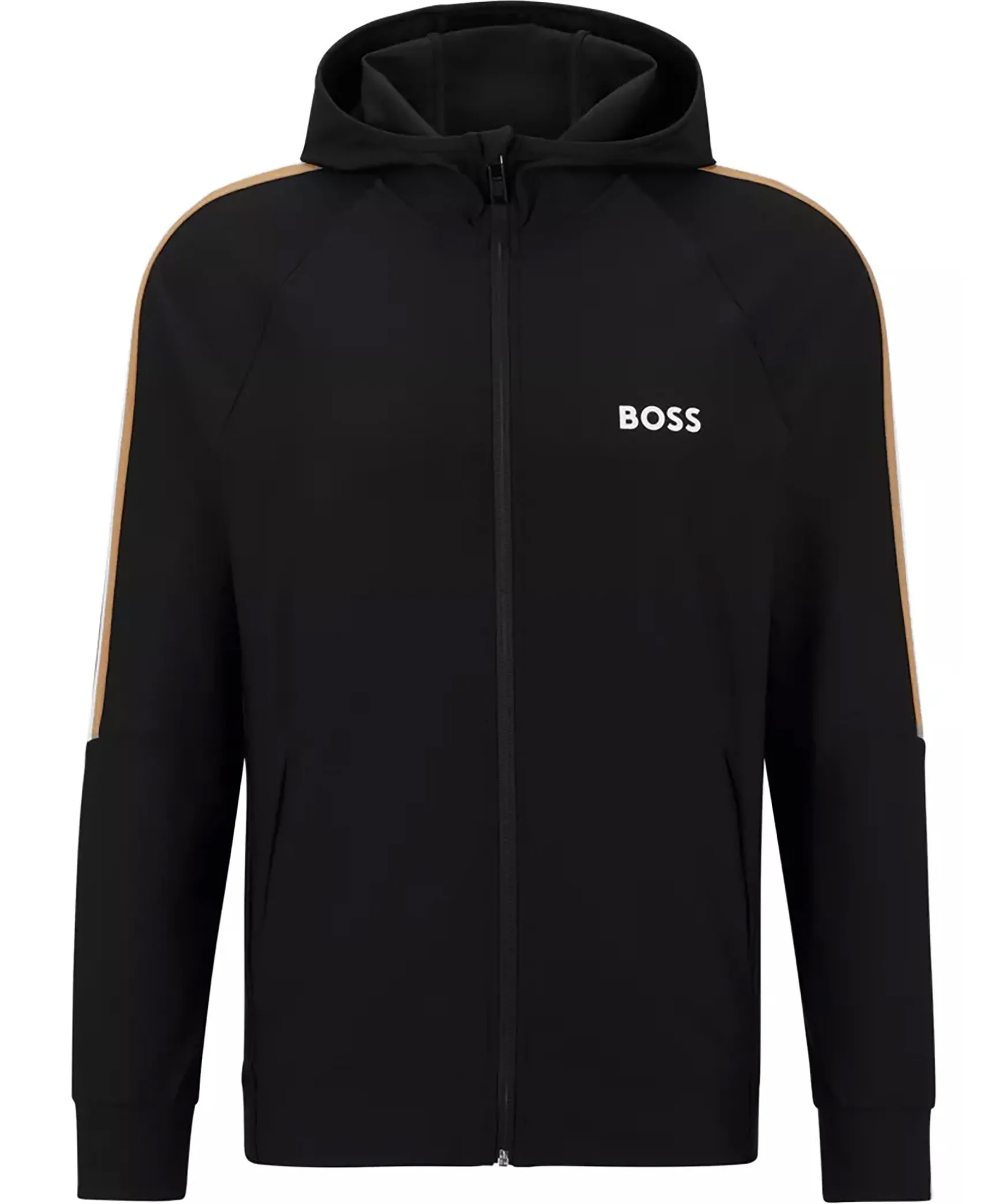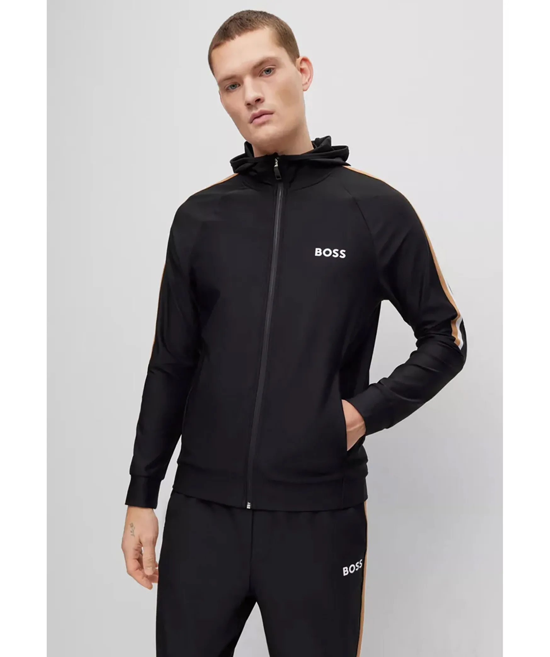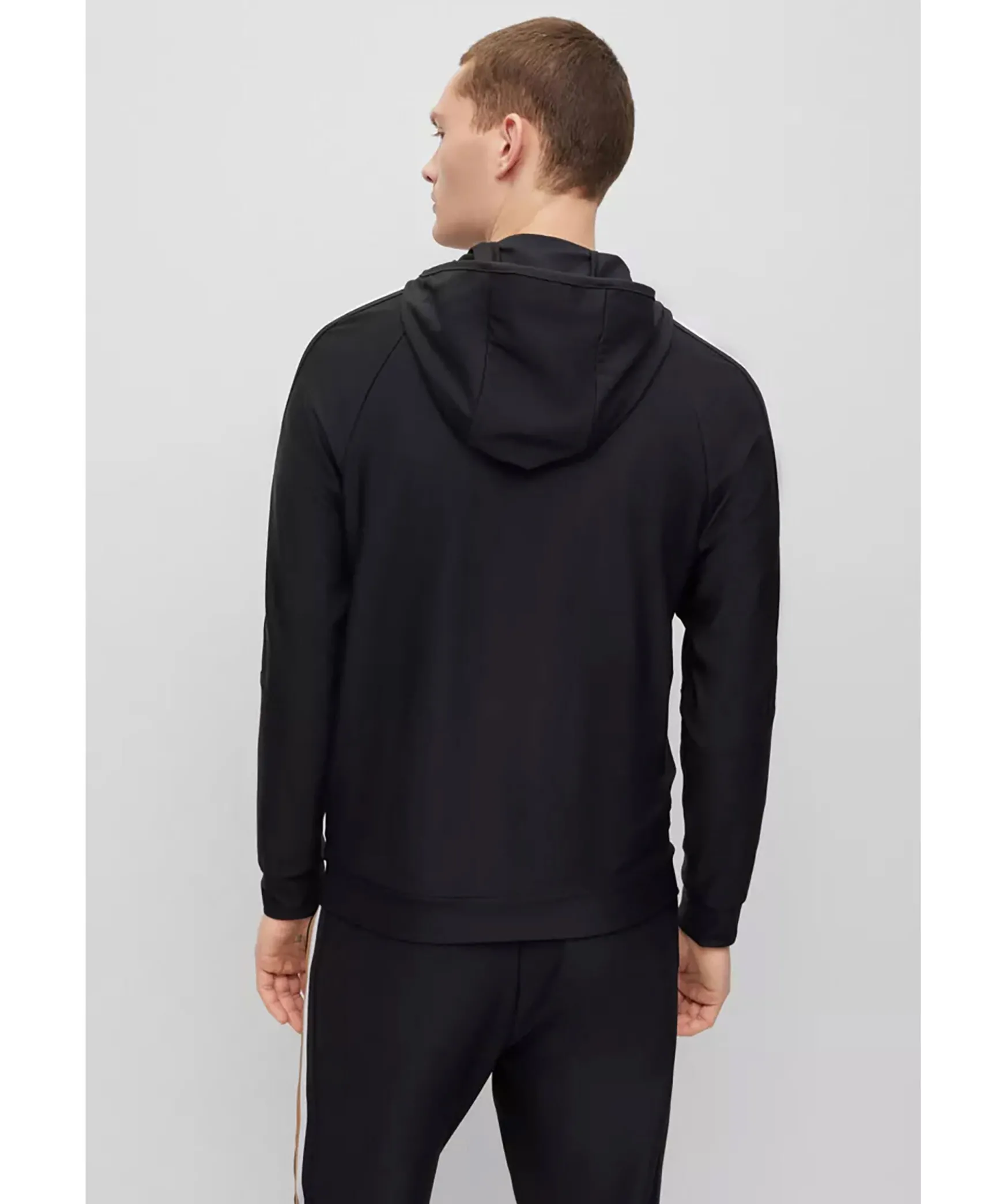 Svart Hoodie Med Dragkedja I Normal Passform I Stretchjersey Fran Boss Green. Signaturrevar Langs Axlarna Och Logotyp Pa Vanster Sida Pa Brostet. Luva Hog Krage, Sidofickor Samt Muddar I Armslut Och Plaggslut. En Del Av Den Dynamiska Kapselkollektionen Boss X Matteo Berrettini, Skapad Av Den Italienska Professionella Tennisspelaren.