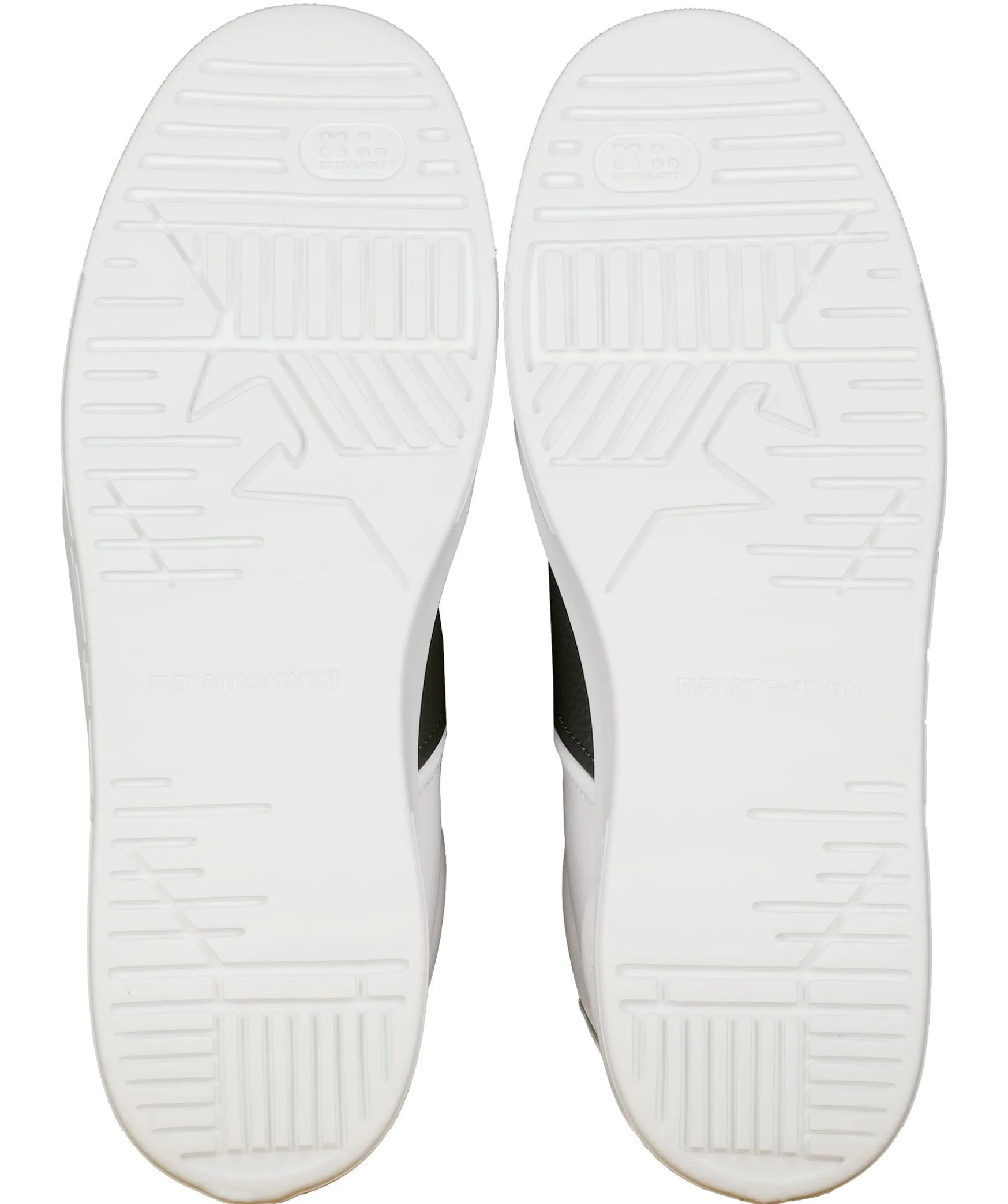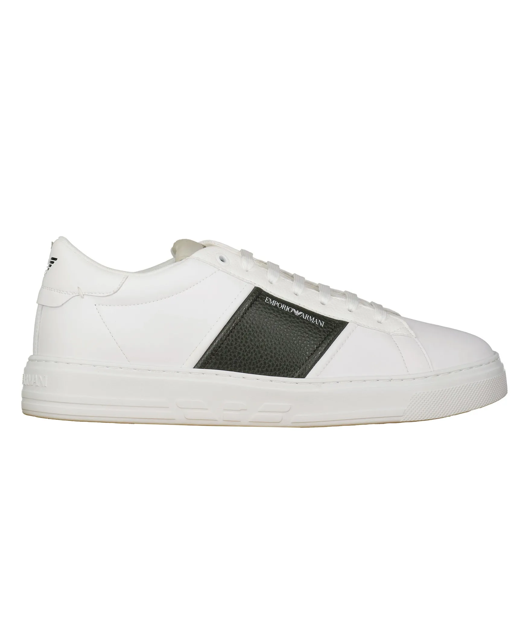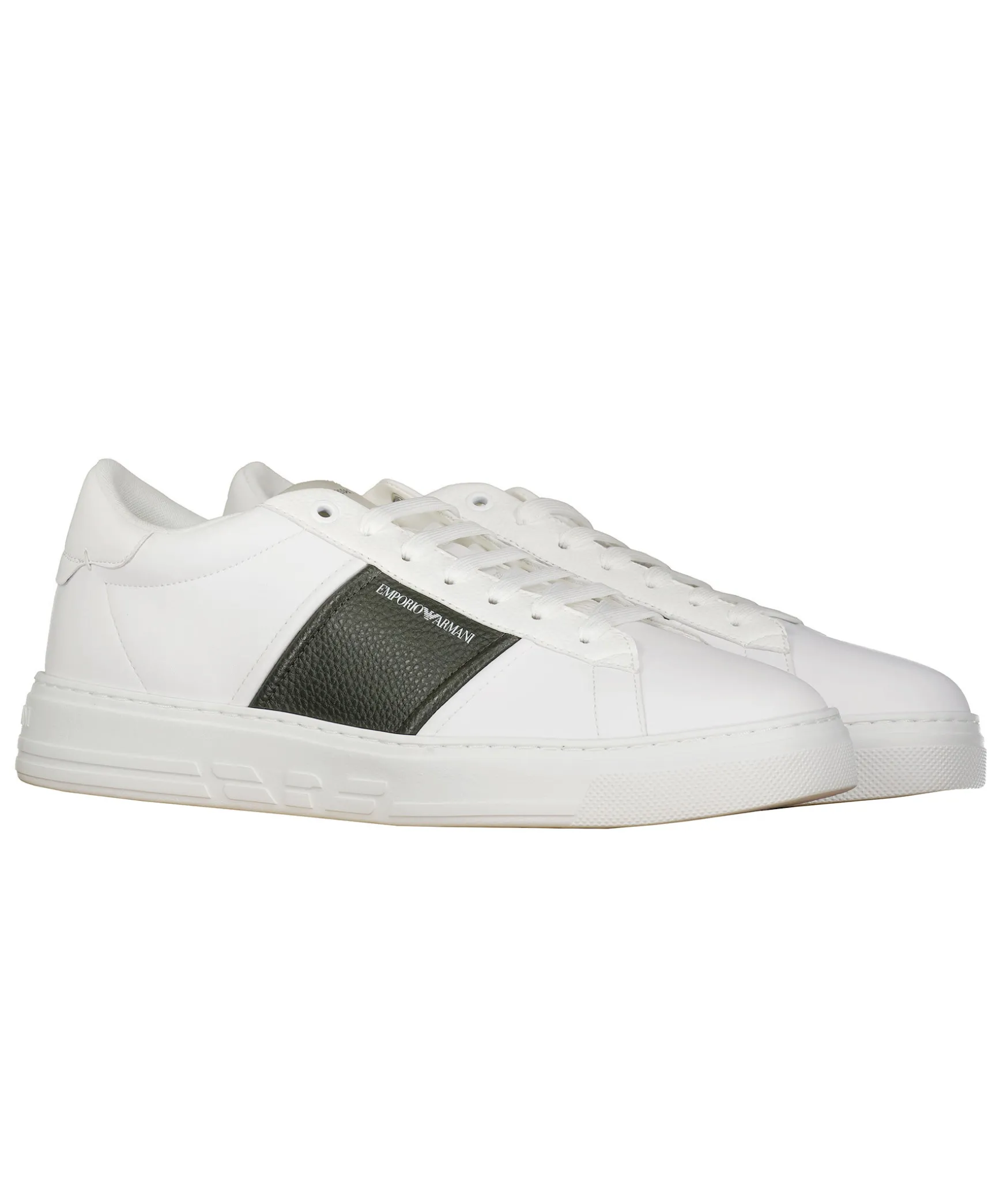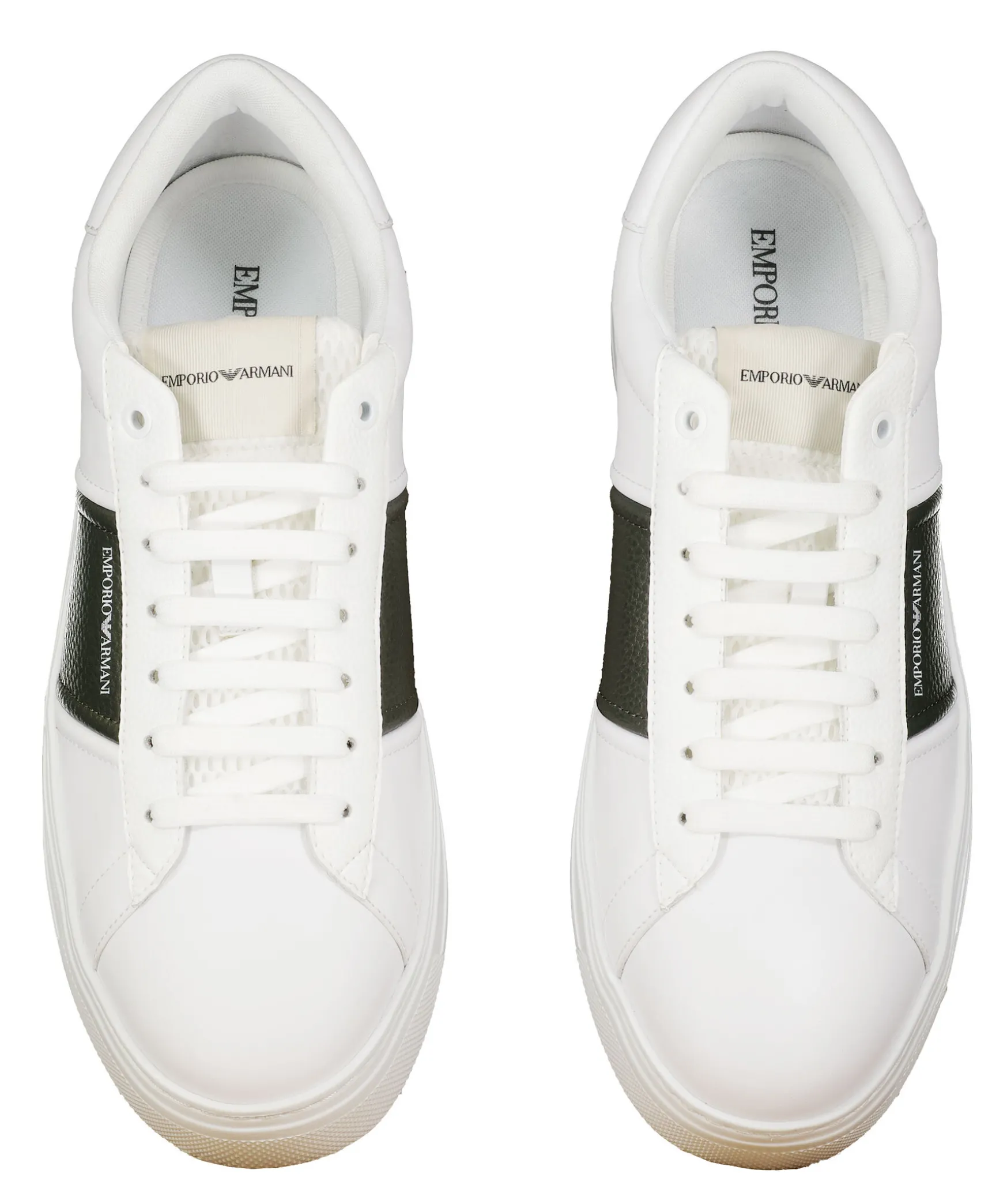 Vita Sneakers I Lader Fran Emporio Armani. Hog Sula I Gummi. Morkgron Detalj. Tryckt Logotyp I Vitt Pa Skons Yttersida. Platta Skosnoren. Plos I Mesh-Material. Patch Med Broderad Logotyp. Svart Logotyp Pa Halen. Embossad Logotyp.