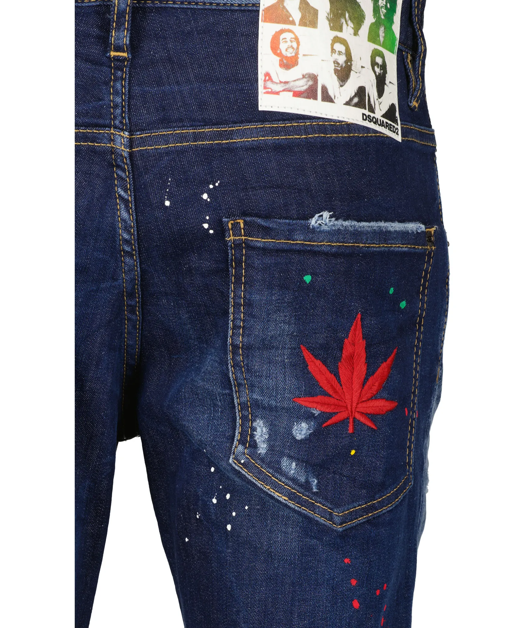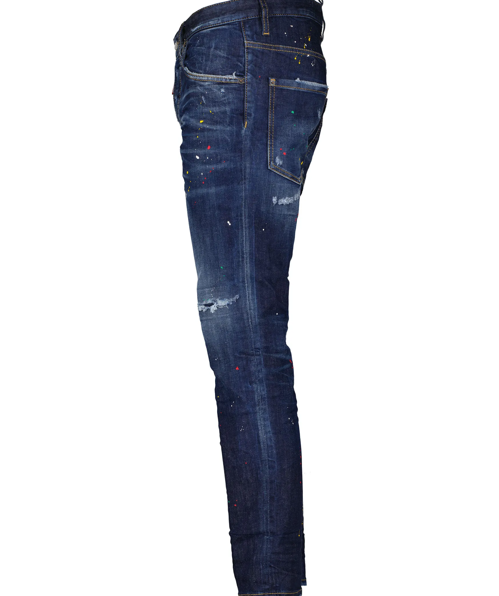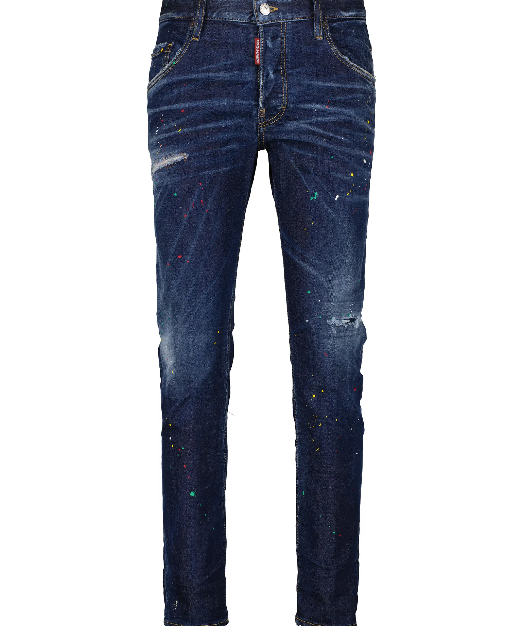Morkbla Jeans Fran Dsquared2. Medvetet Slitna Detaljer Och Fargstank. Tillverkade I Bomull Med Stretch. Stangs Med Knappar I Gylfen. Mellanhog Midja Med Lang Gren Och Smala Ben. Klassisk Femficksmodell. Lader Patch Med Praglad Logotyp Baktill.