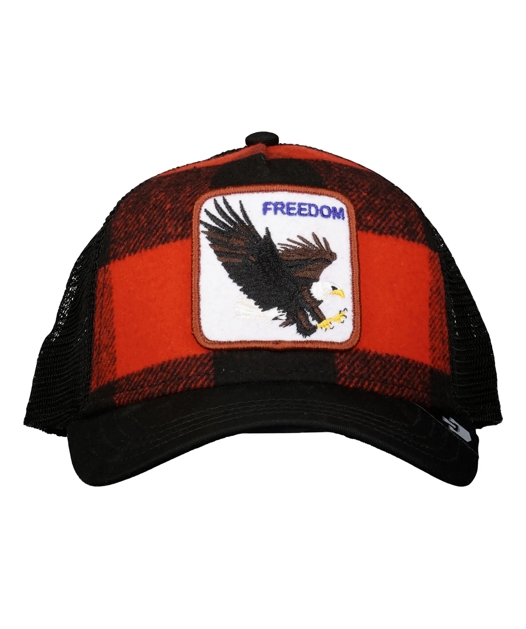 Svart Och Rodrutig Keps Med Svart Meshtyg I Trucker-Basebollmodell Fran Goorin Bros. Fyrkantig Patch Med En Orn. Onesize Modell Med Ett Justerbart 4-Snap-In-Rem.