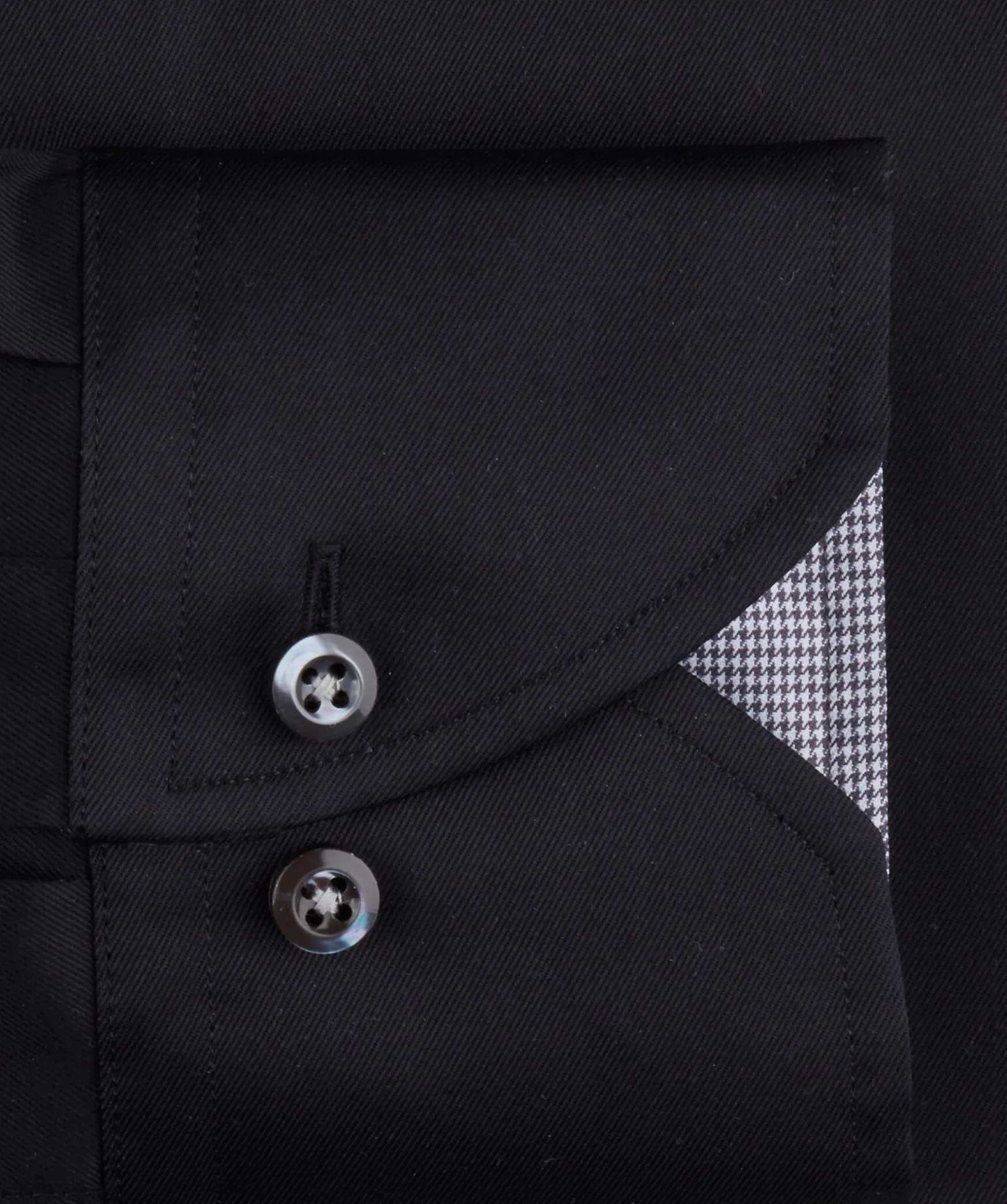 Denna Svarta Slimline Skjorta Ar Gjord Av Twofold Bomull I En Smal Modell. Skjortan Har Kontrastkrage Och Manschetter I Svart Och Vitt Hundtandsmonster, Enkla Manschetter, Svarta Knappar Och En Cut Away Krage. Passar Lika Bra Till Jeans Som Kostymbyxor.