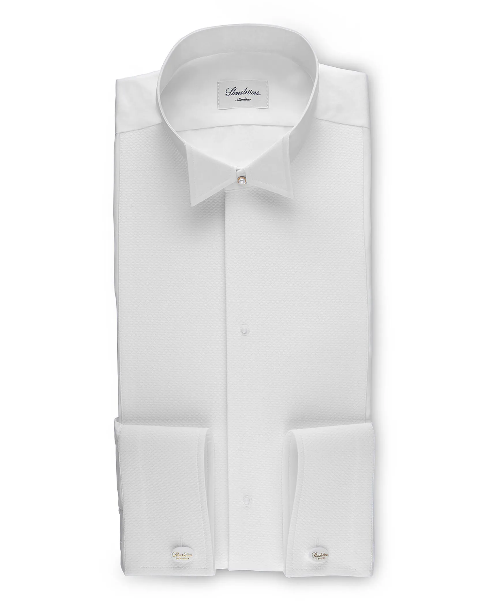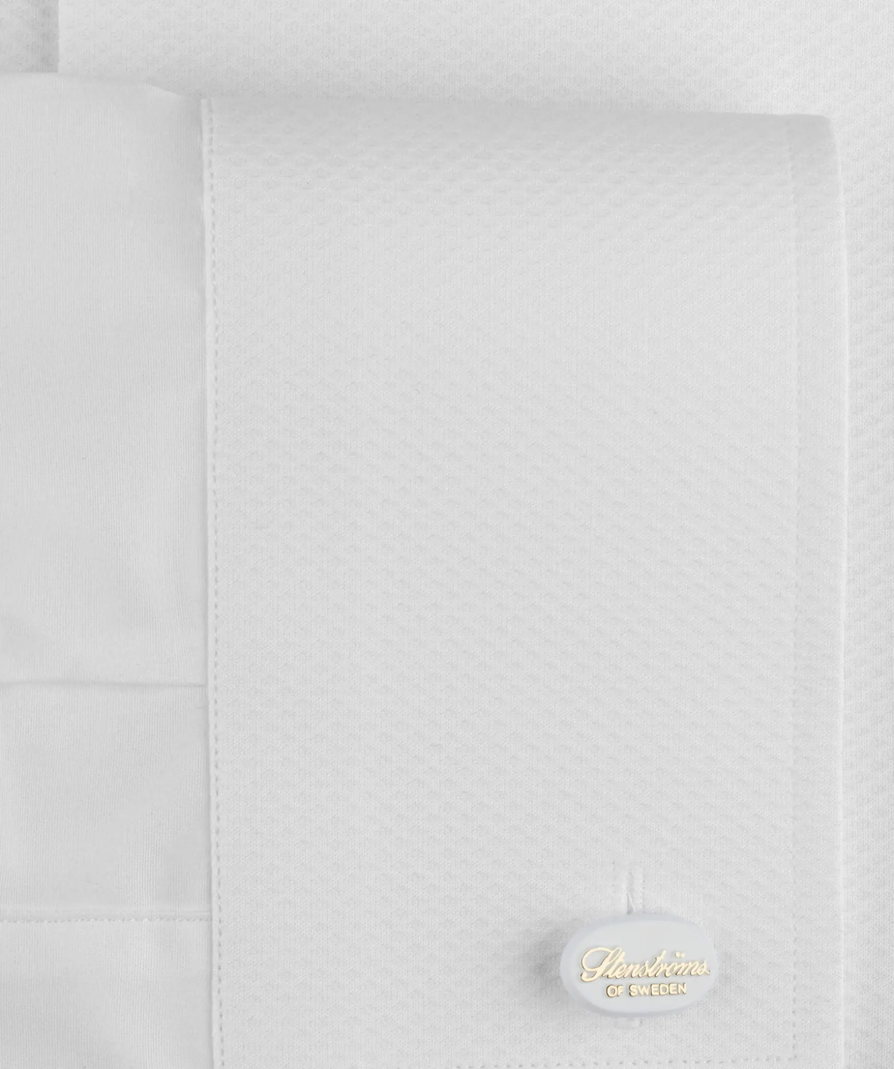 Vit Frackskjorta Fran Stenstroms I Modell Slimline Som Har En Smal Passform Och Ar Gjord Av Bomull Twill Med En Lyxig Bib I Pique Framtill. Detaljerad Med Parl- Och Guldknappar, Med Fyra Hal For Studs, Dubbla Manschetter Och En Snibbkrage Som Passar Till Fluga.
