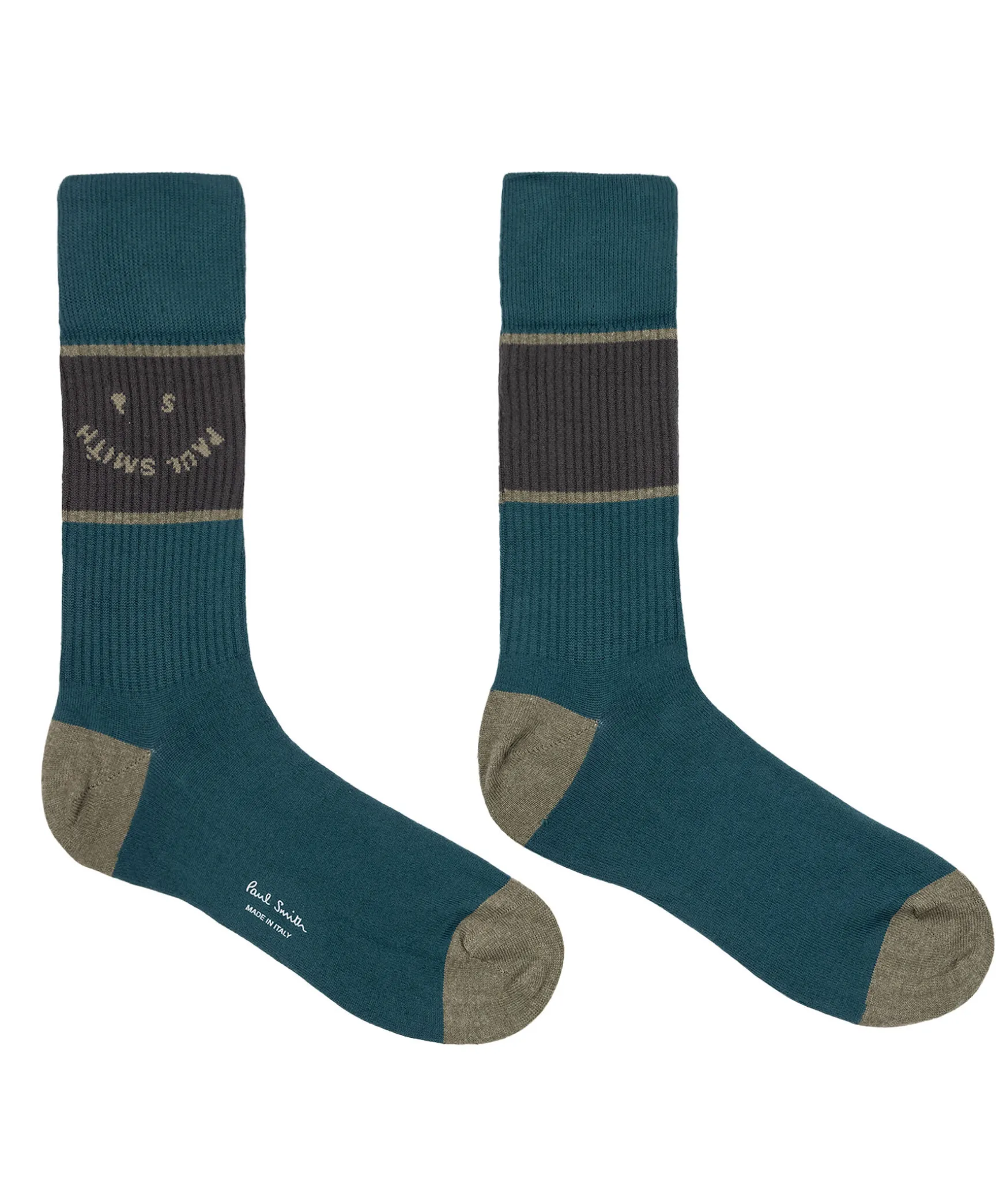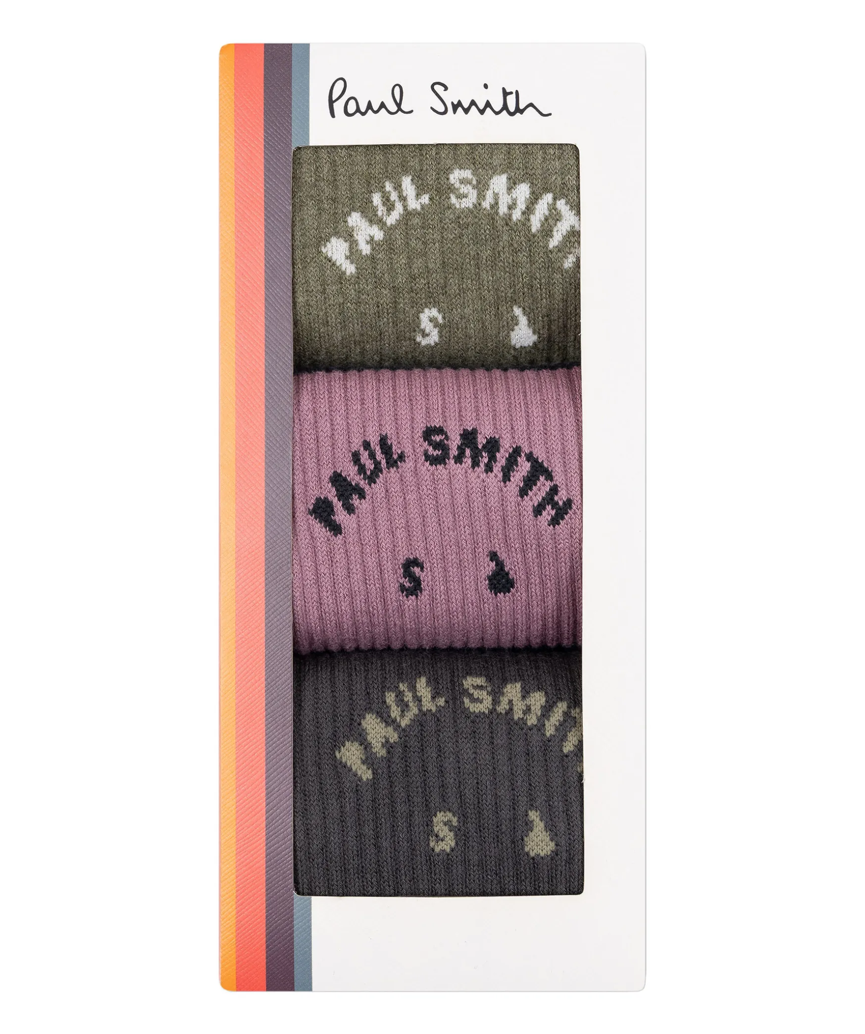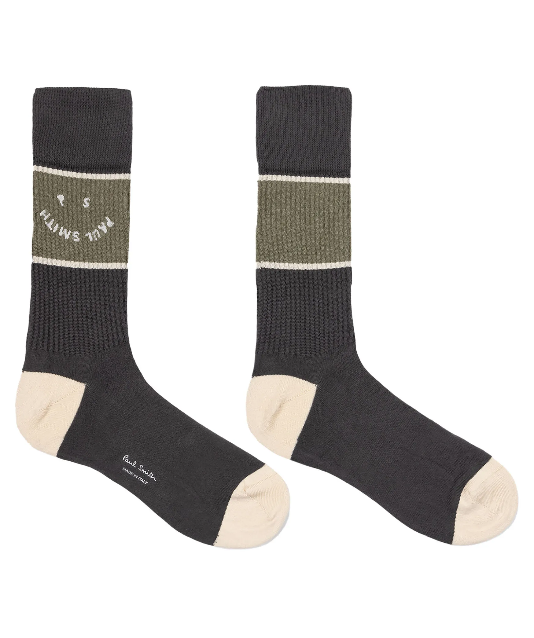 Strumpor I 3-Pack Fran Ps Paul Smith. Tillverkat I Italien Av En Mjuk Bomullsblandning, Detta Tre-Pack Hogstrumpor Har En Neutraltonad, ”Ps Happy” Smiley, Varje Par Har Olika Farger. Dessa Strumpor Har En Ribbad Ankel For Komfort.