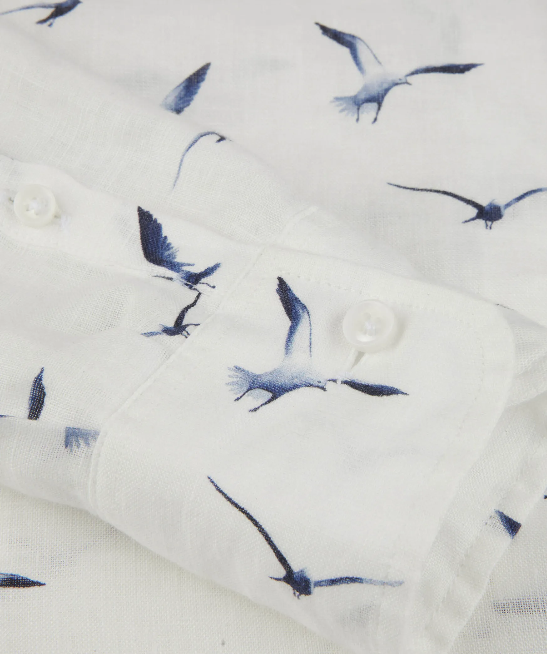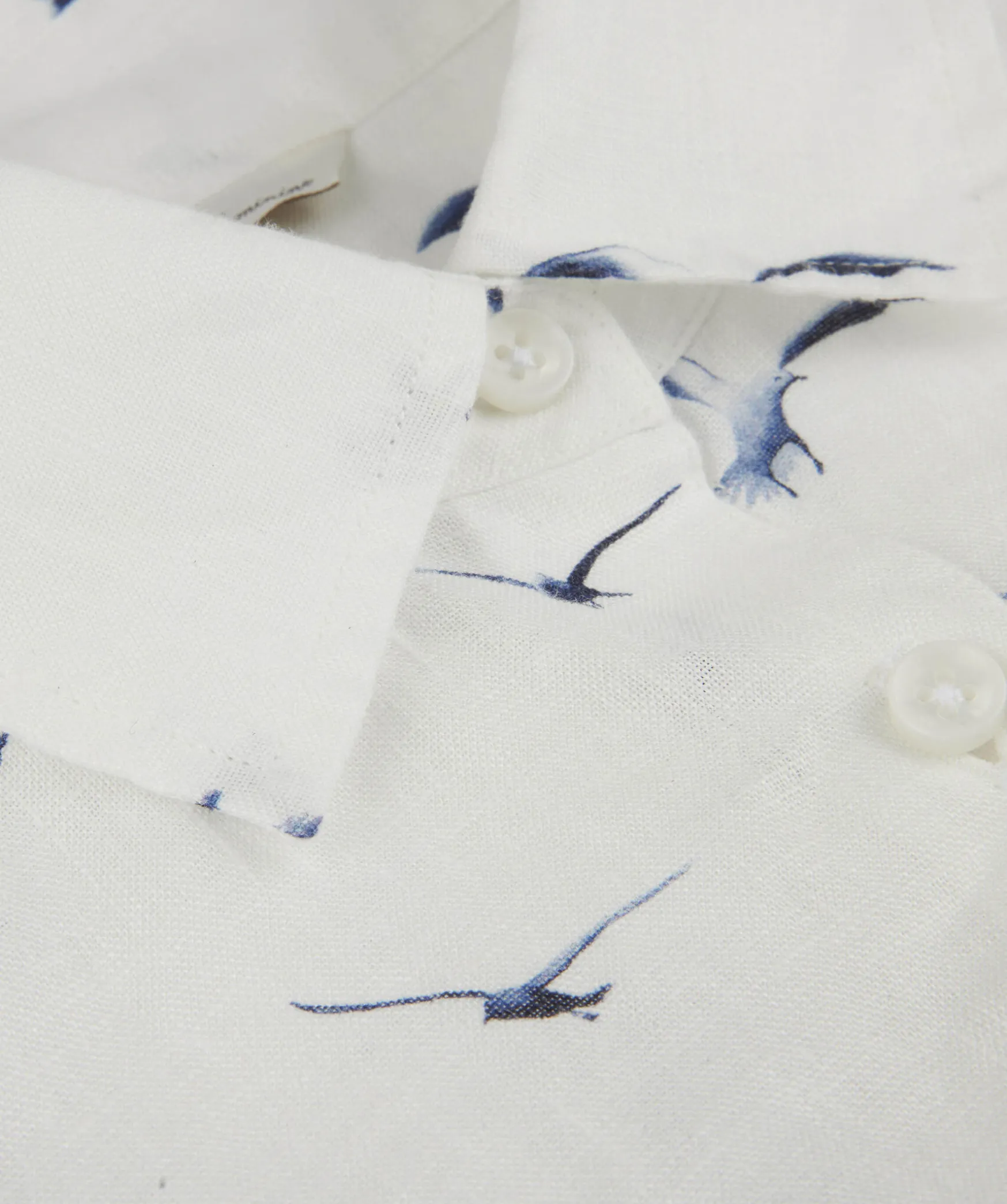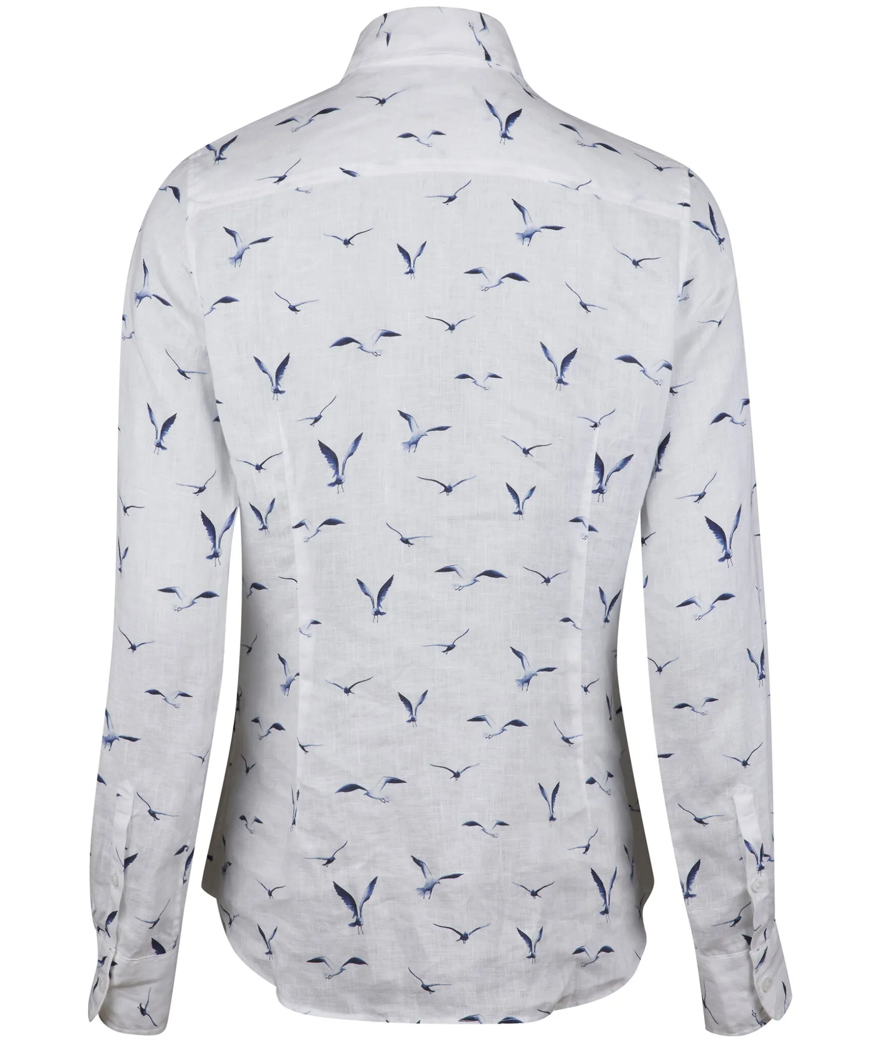Vit Skjorta, Med En Feminin Passform, Tillverkad Av Linne. Designad Med Ett Monster Och Detaljerad Med Parlemorknappar, En Slat Knappsla Och En Klassisk Krage.