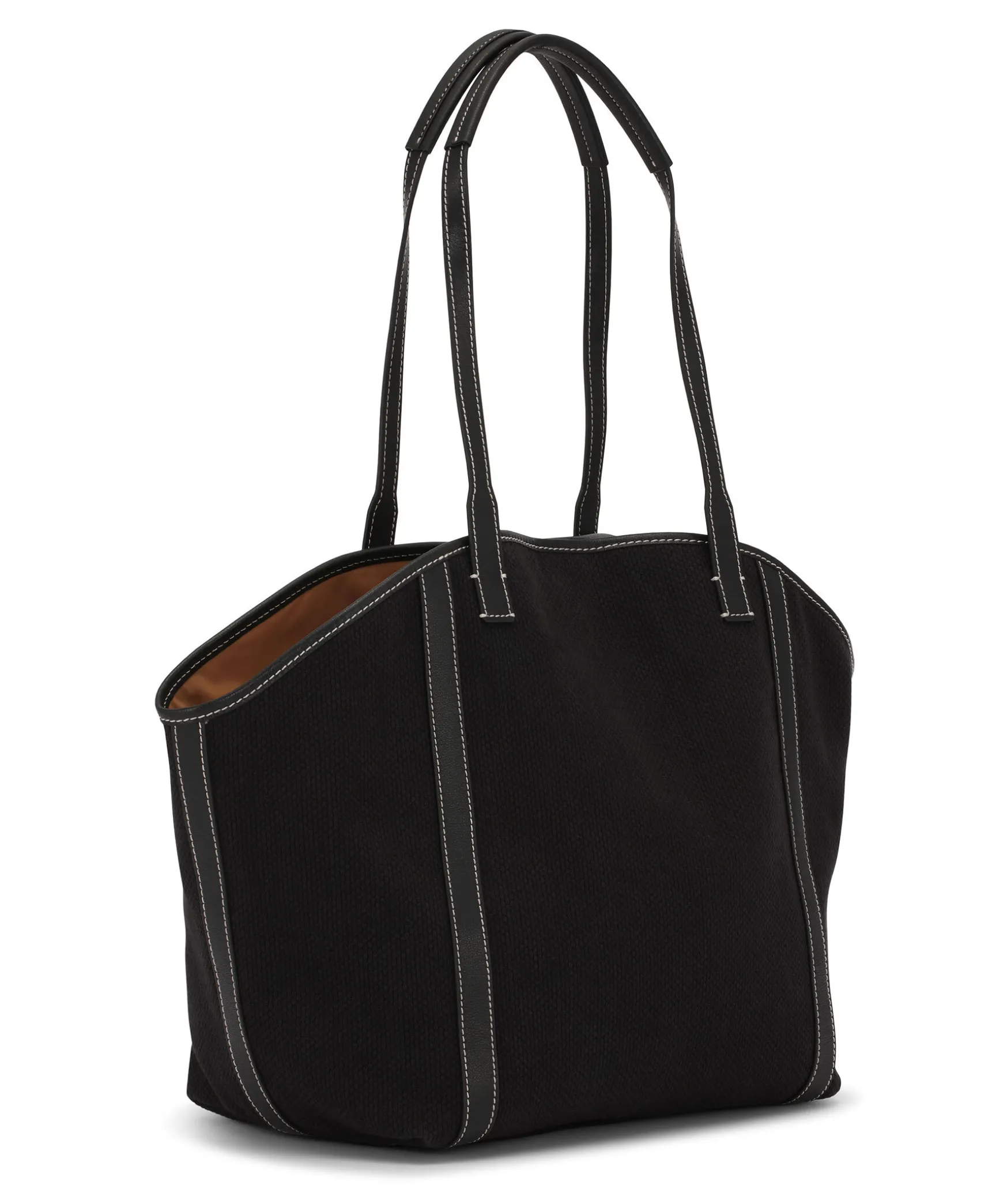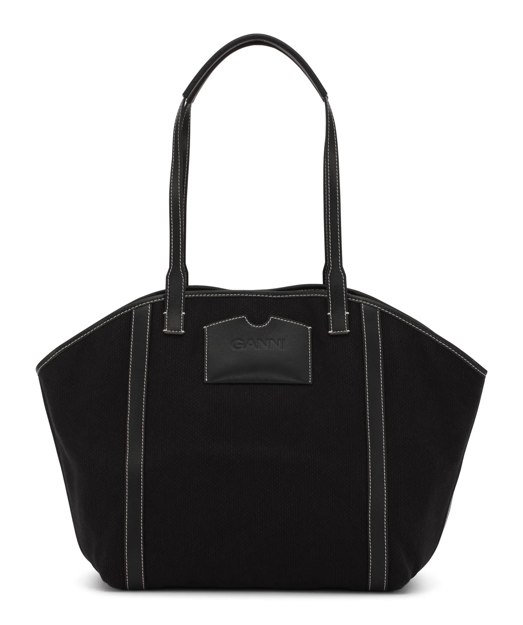Svart Totebag Med Detaljer I Lader Fran Ganni. Praglad Logotyp Framtill, Kontrast Sommar I Vitt Och Bars Med Axelremmar. Axelremmens Langd: 25 Cmhojd: 33 Cmdjup: Ca 24 Cm