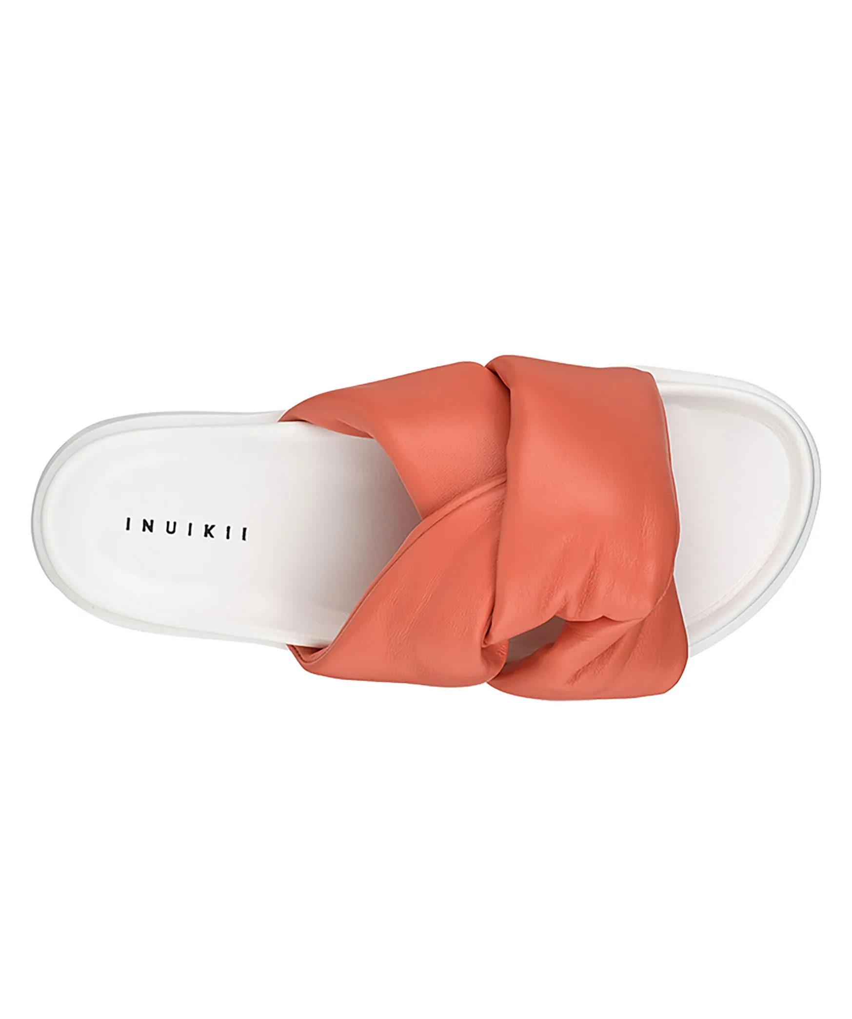 Vit Slip-On Sandal Fran Inuikii. Ladermaterial Som Knyts Ihop Till En Sot Accessoar Pa Ovansidan I En Korallfarg. Sandalen Ar Tillverkad I Lader. Tjock Yttersula.