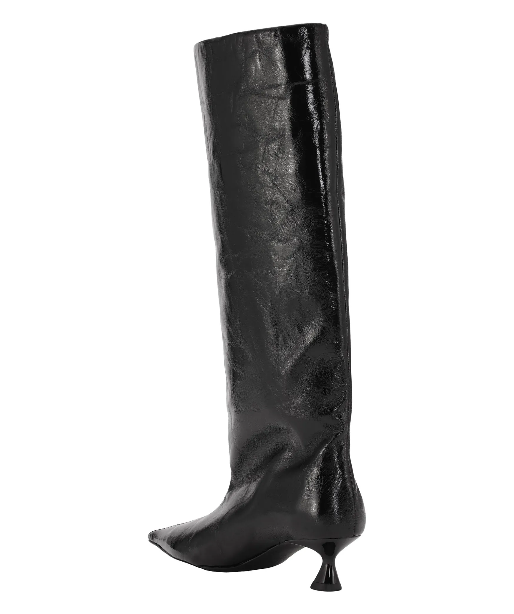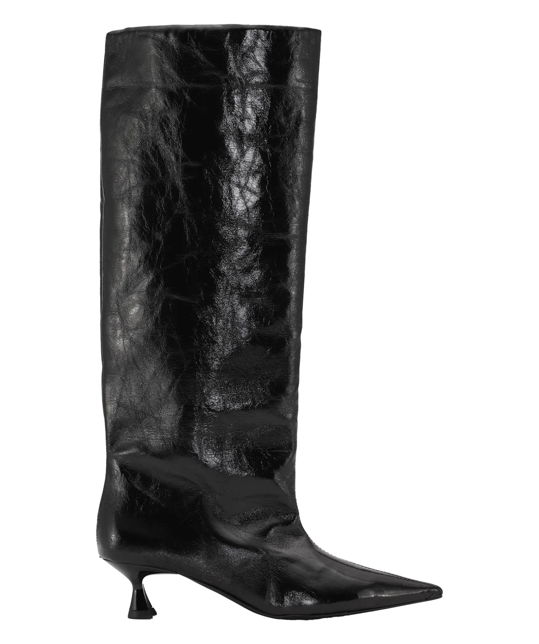 Svarta Hoga Boots Fran Ganni. Stoveln Har Vida Skaft Och En Spetsig Ta. Tillverkade I Laderimitation Med En Glansig Finish. Klackens Hojd Ar 5 Cm.