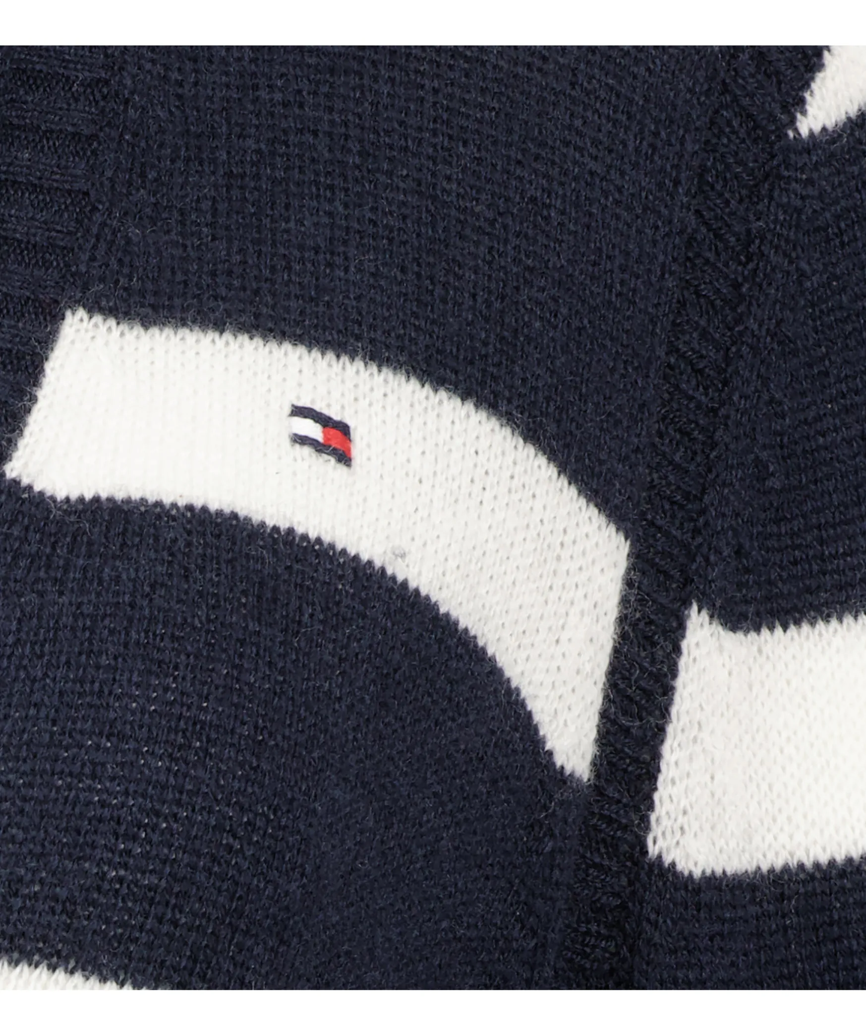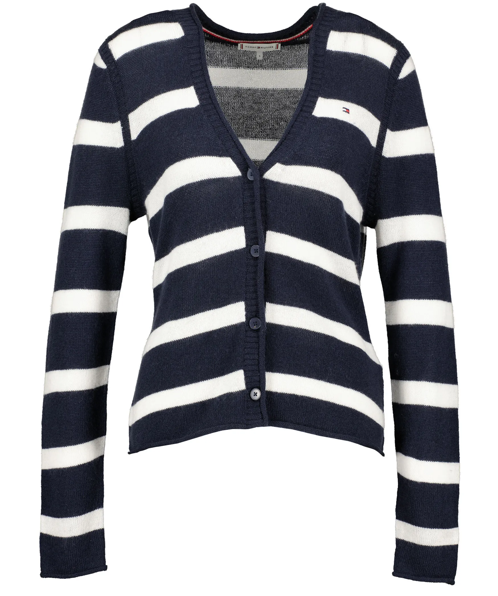 Morkbla Och Vit Randig Kofta Fran Tommy Hilfiger. Tillverkad I 100% Ull. Med Sin Stil Som Passar Till Vad Som Helst, Gor Denna V-Ringad Ullkofta Ett Enkelt Extra Lager Till Manga Smarta Eller Avslappnade Outfits. Knappstangning Framtill Samt En Liten Broderad Tommy Hilfiger Flagga. Normal Passform.