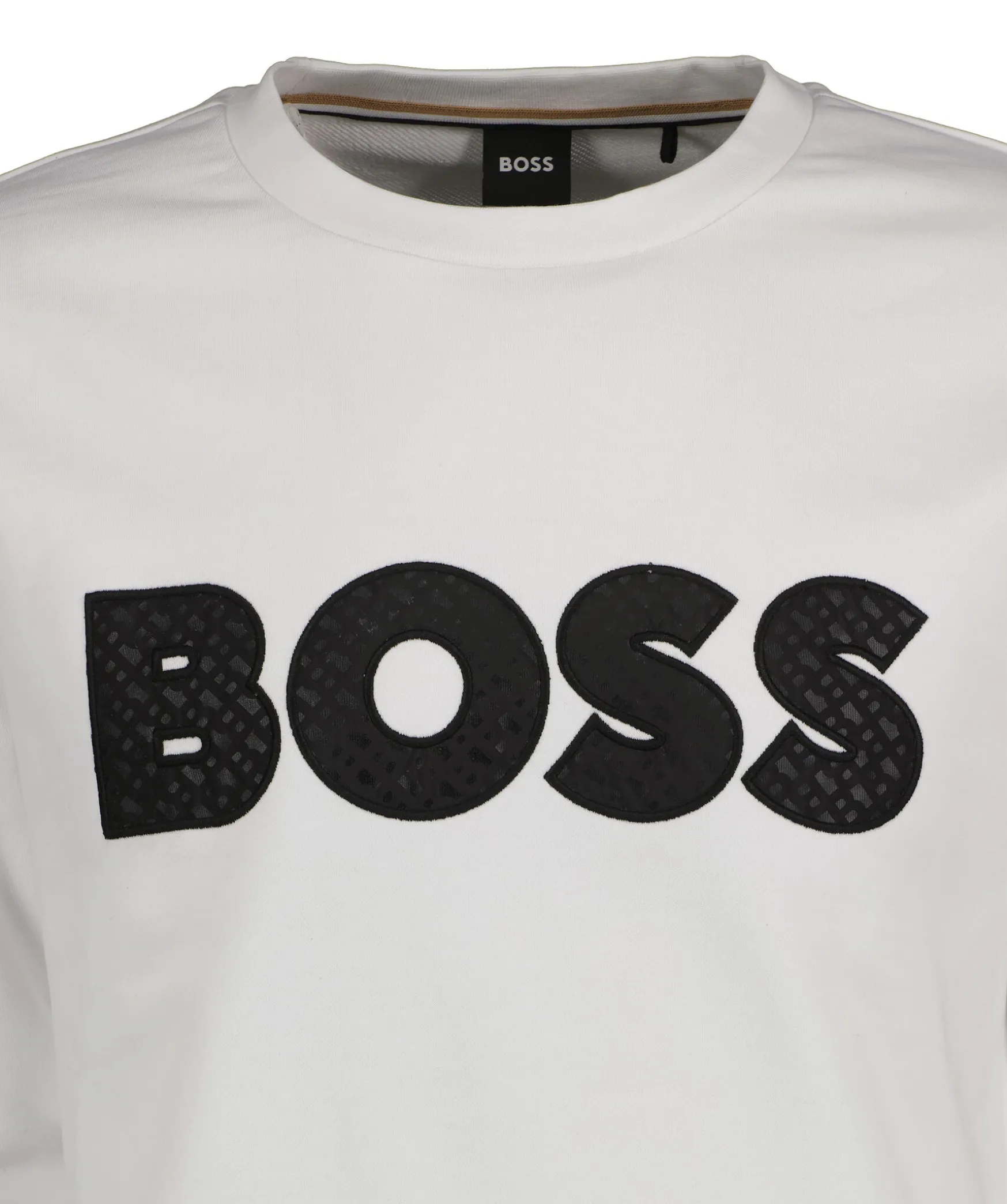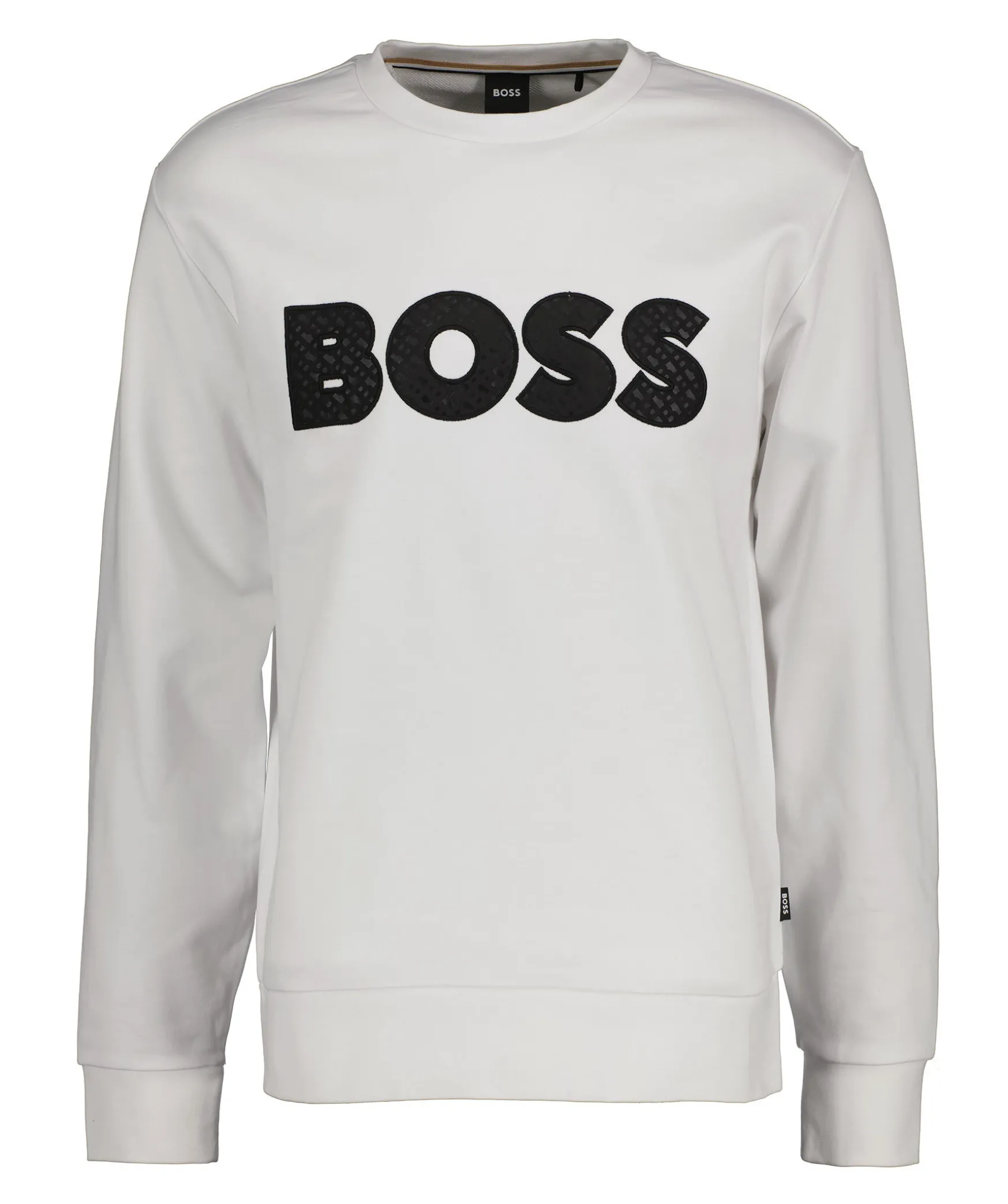 Vit Sweatshirt Fran Boss Black. Tillverkad I 100% Bomull. Svart, Stor Broderad Logotyp Med Monogrammonster Pa Framsidan. Ribbstickad Halsringning, Muddar Samt Plaggslut.