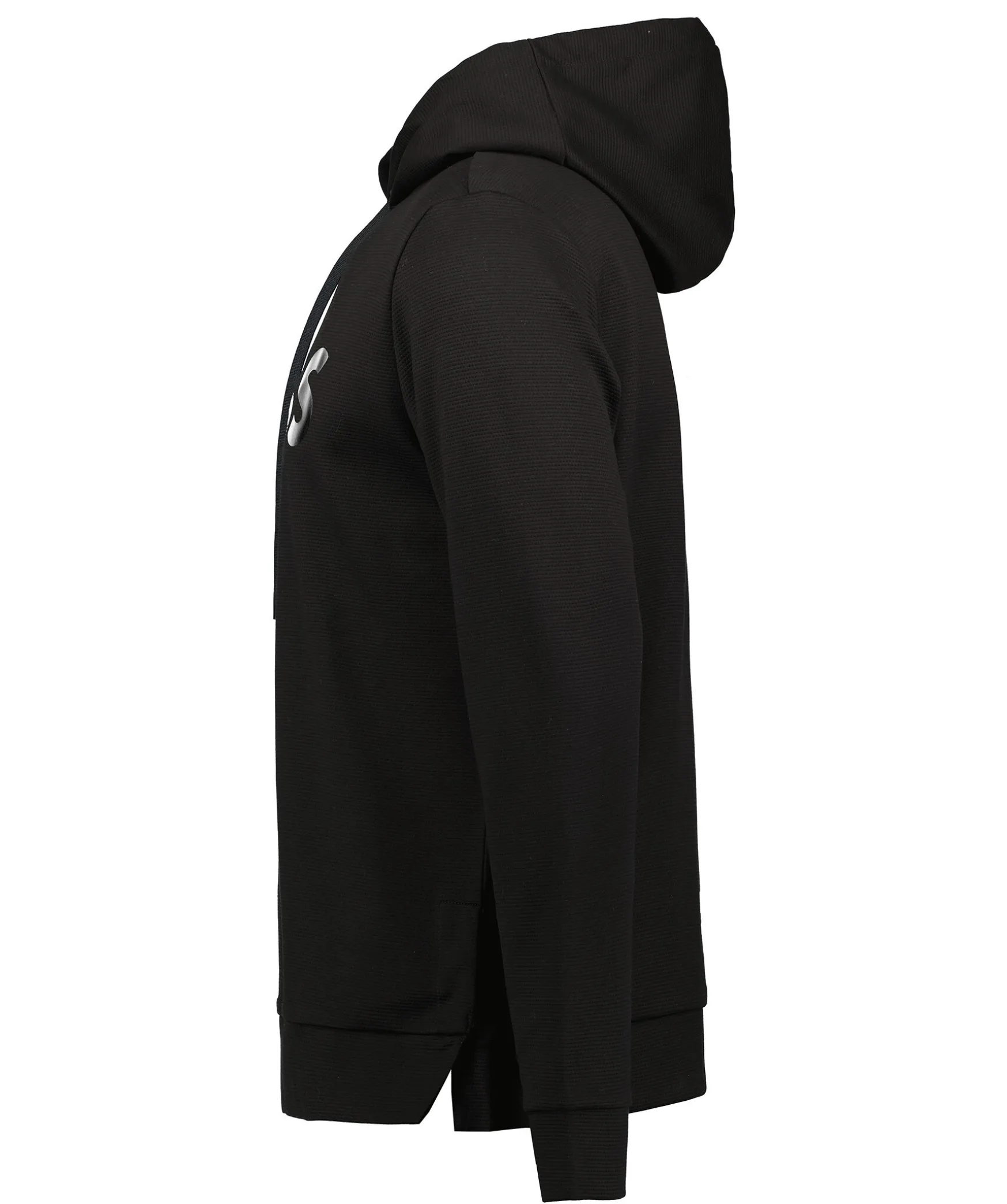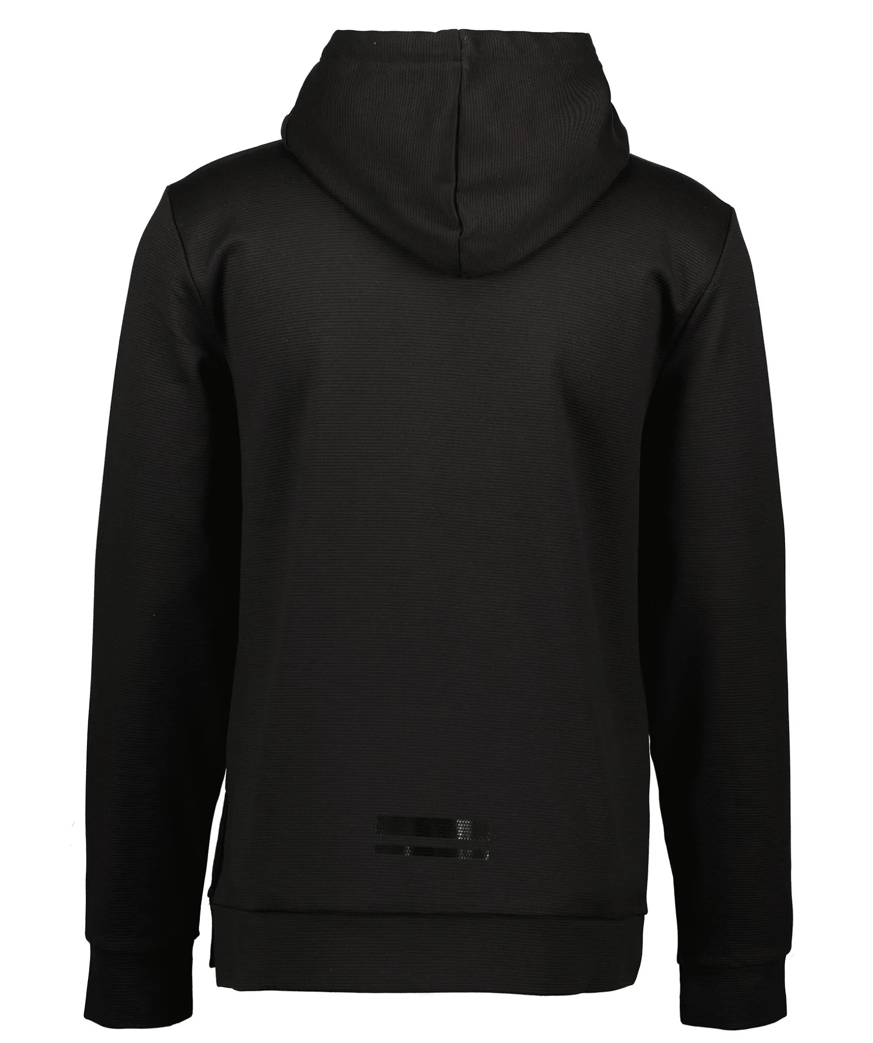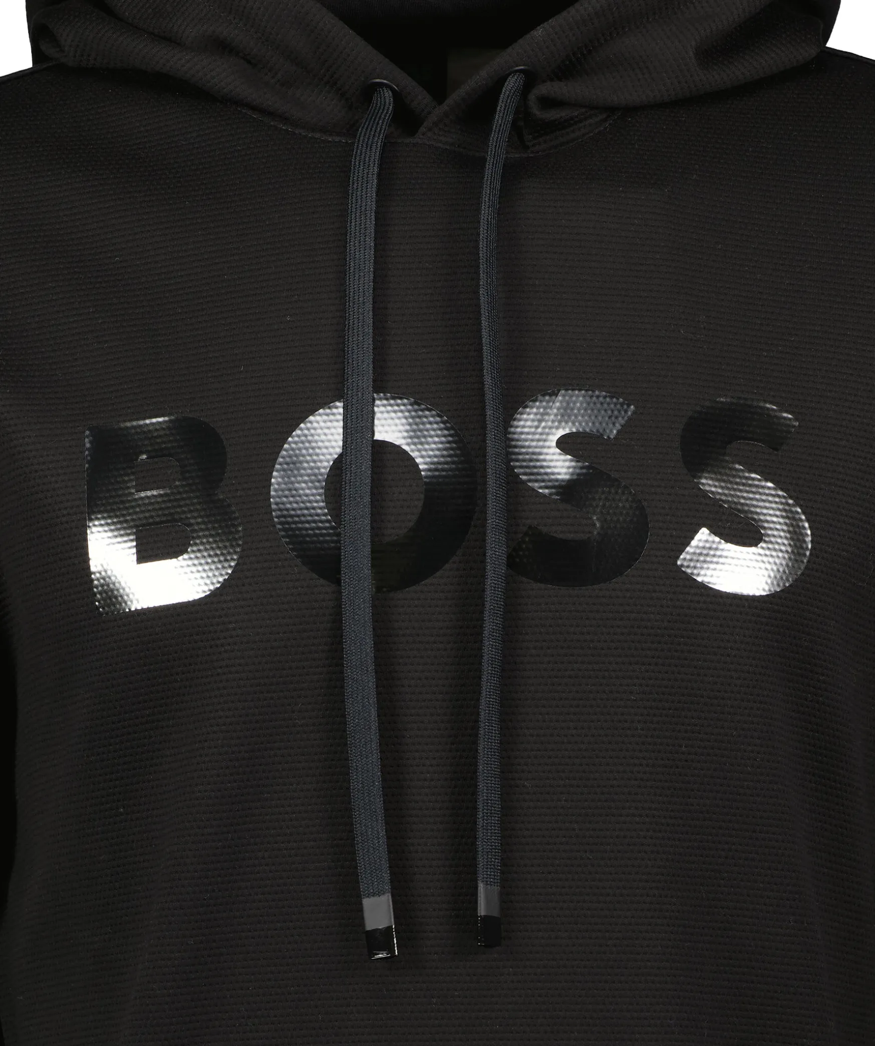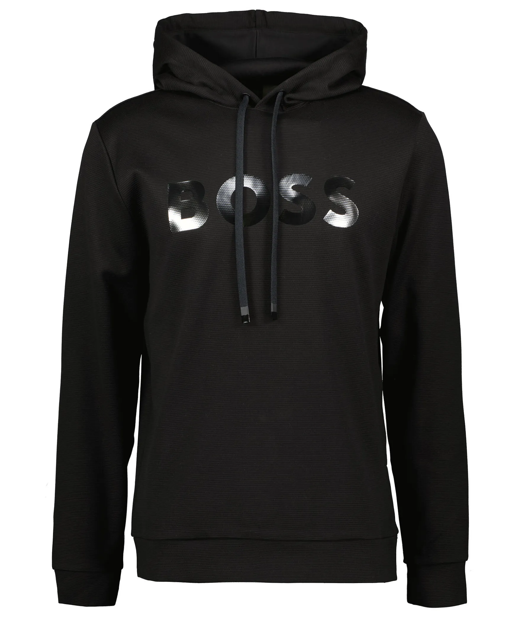 Svart Hoodie Med Huva Fran Boss Green. Tillverkad I 100% Bomull. Kort Slits Pa Vanster Sida Vid Plaggslut Som Gar Att Oppna Upp Mer Med Knapp. Hoodien Ar Prydd Med En Glansig Boss-Logotyp Pa Framsidan Och Tva Glansiga, Horisontala Streck Pa Baksidan Vid Plaggslut.