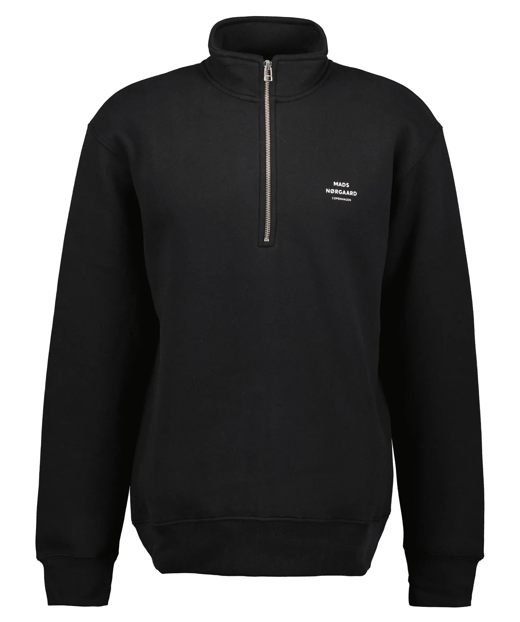 Svart Sweatshirt Med Half Zip Fran Mads Norgaard. Tillverkad Av En Bomullsblandning Och Har En Liten Vit Logotyp Pa Vanster Sida Pa Brostet. Den Har Ribbade Kanter Och Den Hoga Halsen Har En Dragkedja.