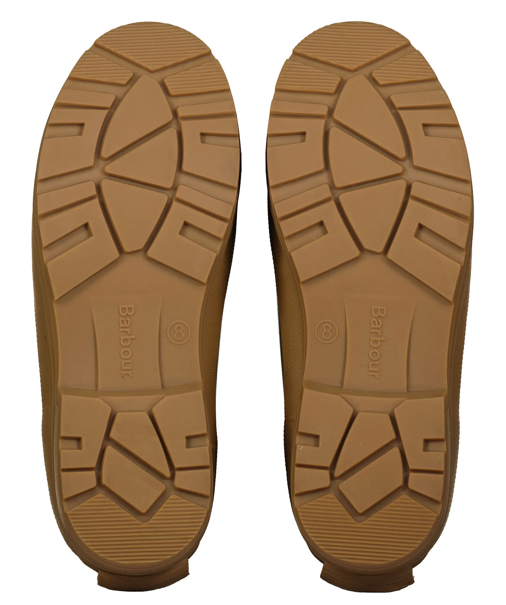 Militargrona, Laga Gummistovlar Fran Barbour. Med Elastiska Sidopaneler Och Dragflikar Ar De Latta Att Ta Av Och Pa Nar Du Ar Pa Sprang. Stovlarna Har En Beige Sula Och Logotyp Pa Dragflikarna.