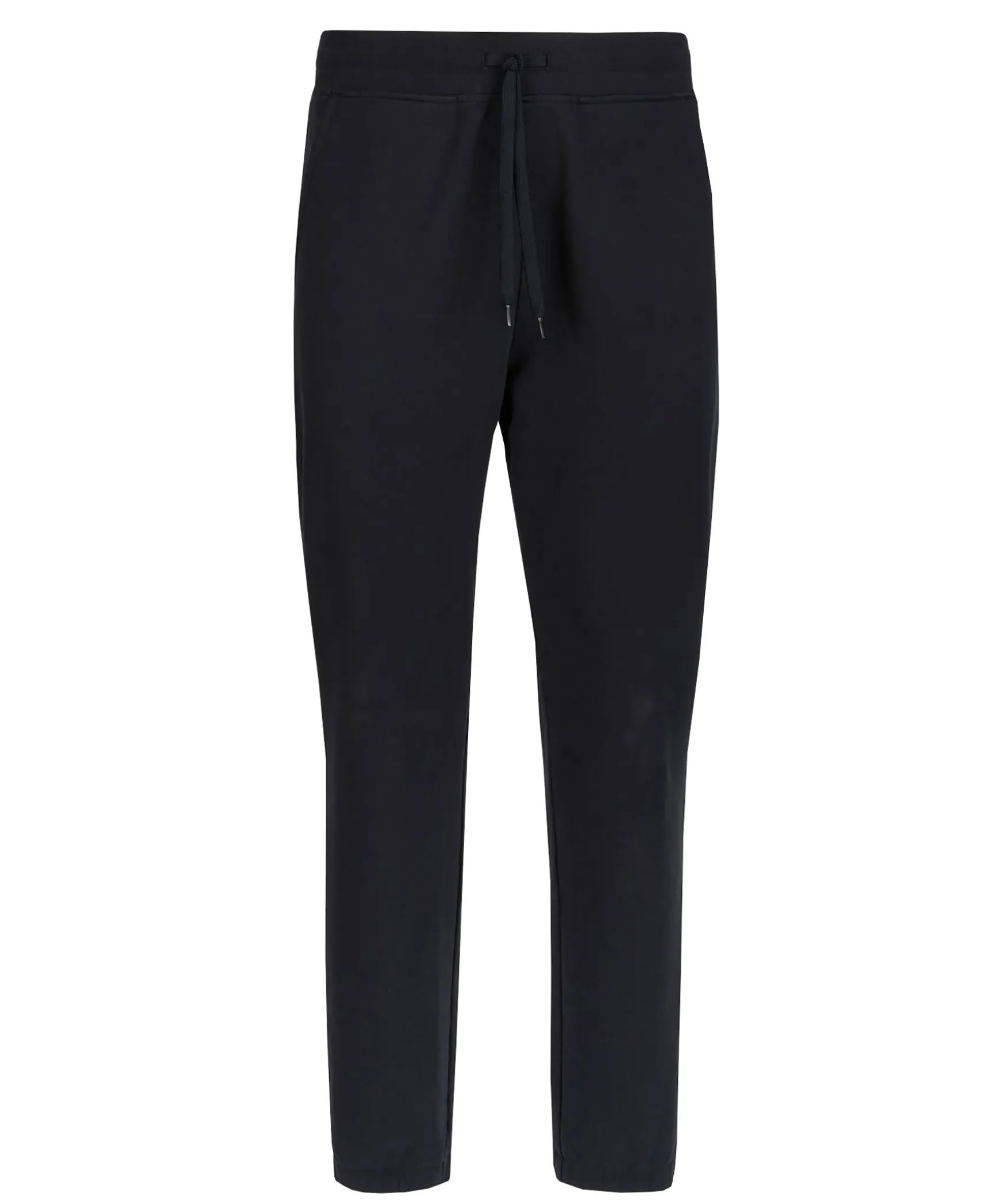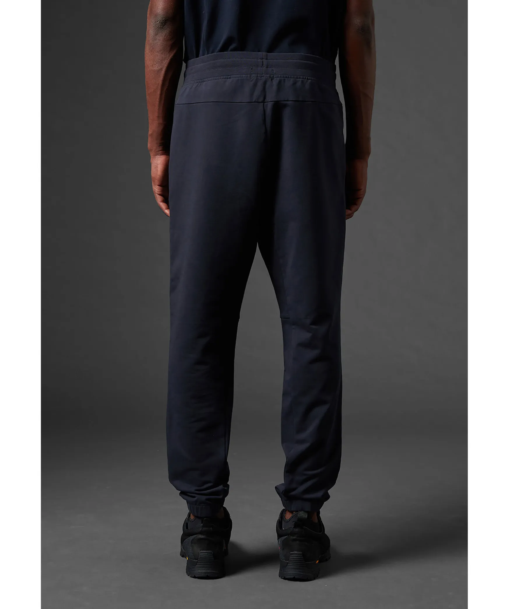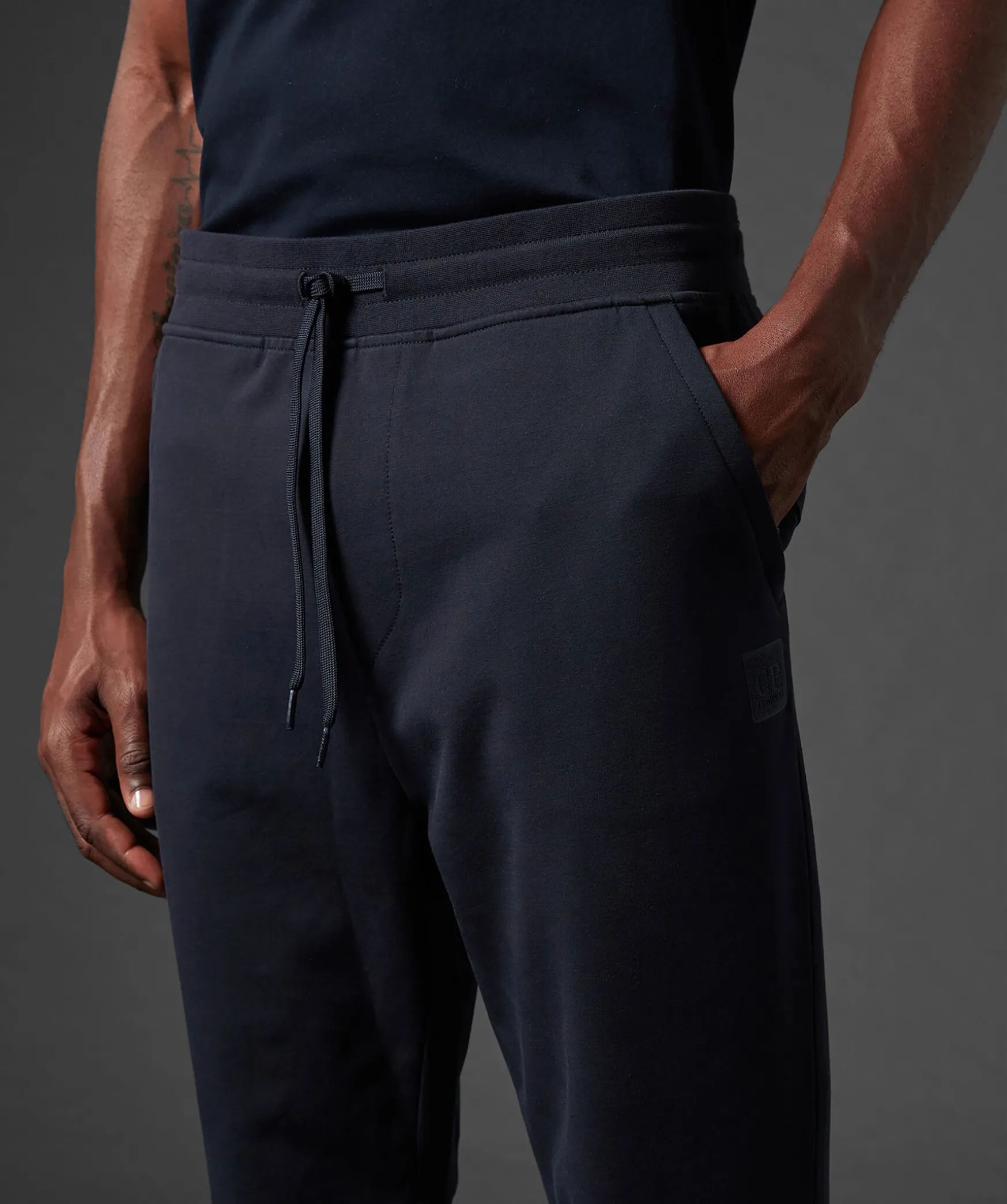 Marinblaa, Tunna Mjukisbyxor Fran C.P Company. Mudd Och Snorning I Midjan Och Smala Muddar I Benslut. Tva Framfickor Med Dold Dragkedja Och En Ton I Ton Logga Tryckt Pa De Vanstra Benet Under Framfickan.