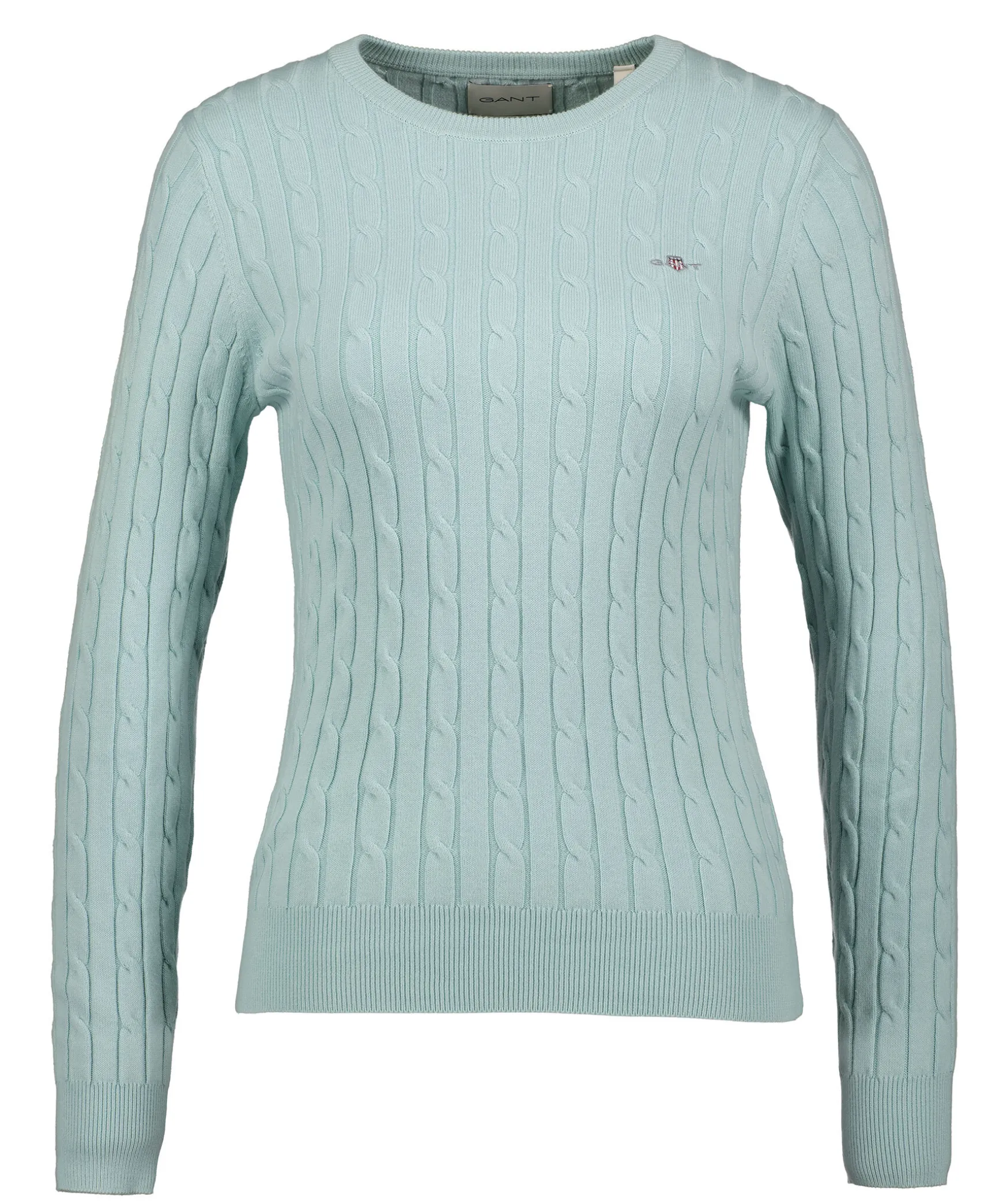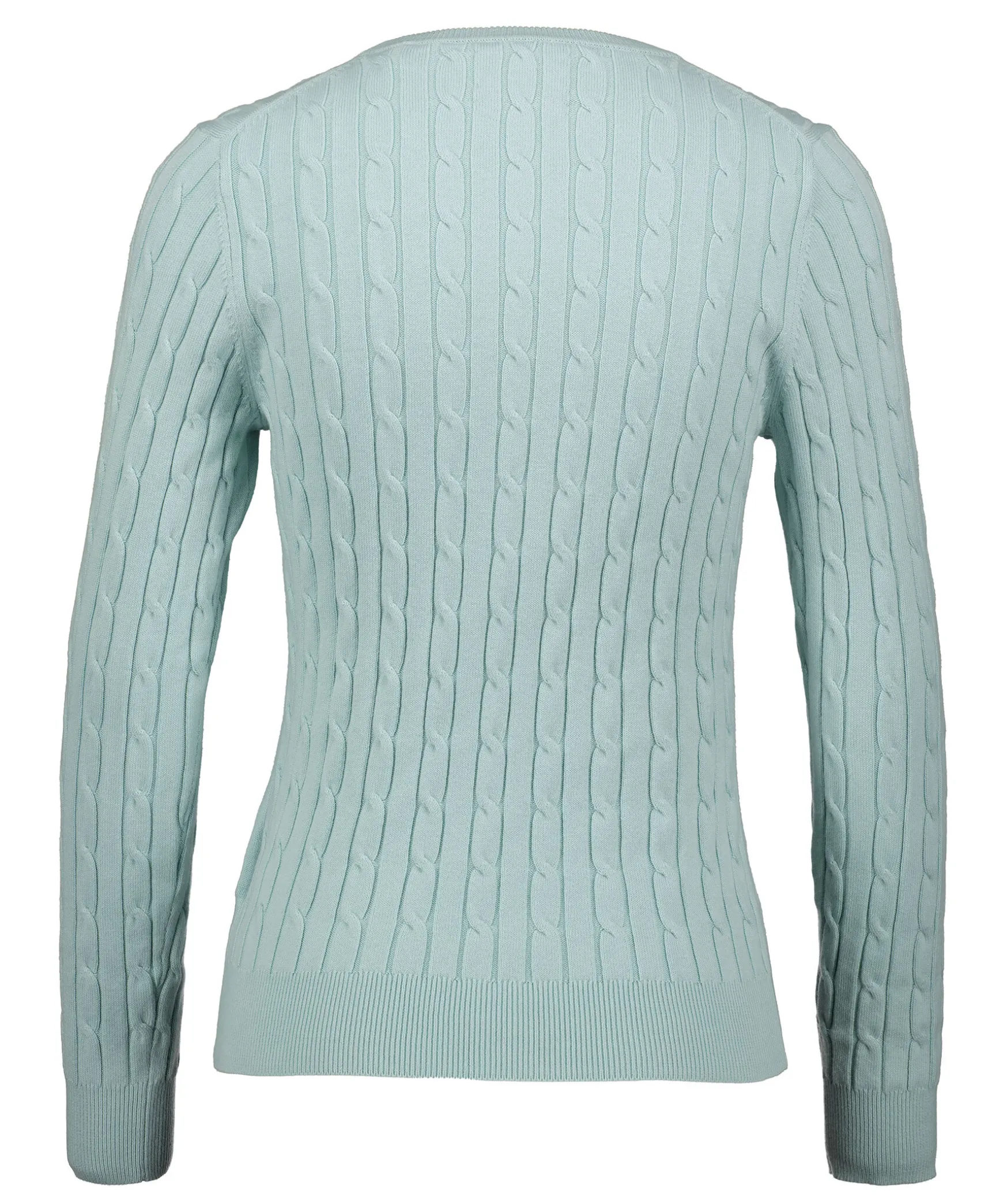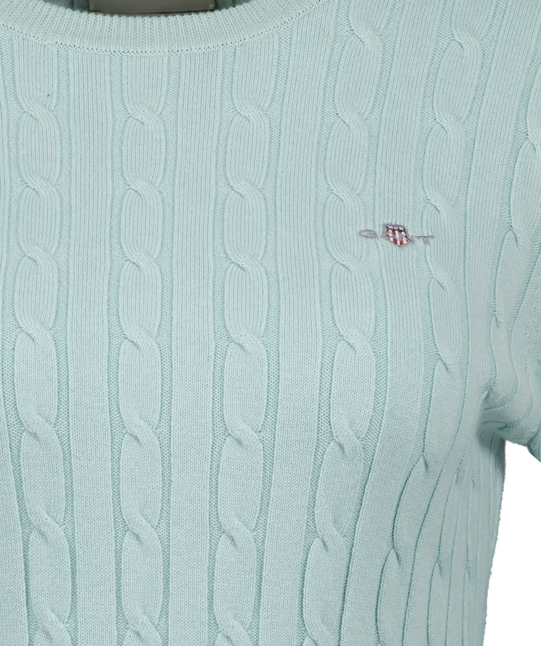 Mintgron Klassisk Kabelstickad Troja Fran Gant. Tillverkad I En Mjuk Bomulls- Och Elastanblandning, Har En Smal Och Stretchig Passform, Klassisk Rund Halsringning, Ribbstickade Detaljer Och Deras Klassiska Skold Broderad Pa Brostet.
