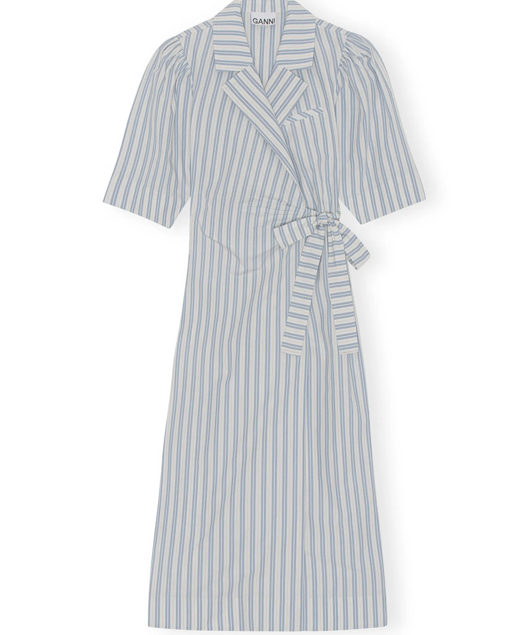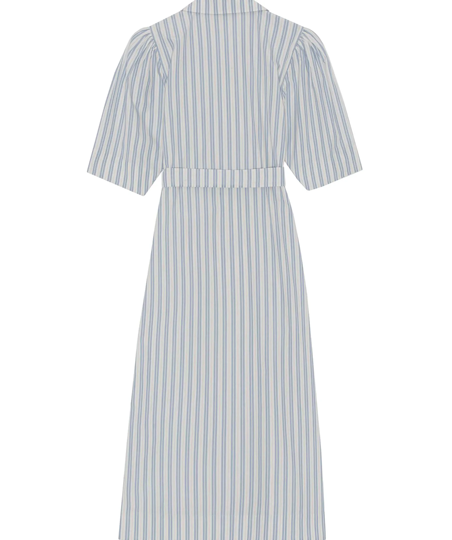 Randig Midiklanning I Skjortmodell Fran Ganni. Tillverkad I Bomull Och Har Ett Monster Av Vita Och Ljusbla Rander Samt Tunna Roda Strack. Revolverkrage, Midjeband Med Knytning For En Justerbar Passform, Brostficka, Samlade Axlar Och Breda Avsmalnande Armbagslanga Armar. Skuren For En Omlottsilhuett Med Anpassad Passform I Axel Och Byst Med En Nagot Avsmalnande Kjol.