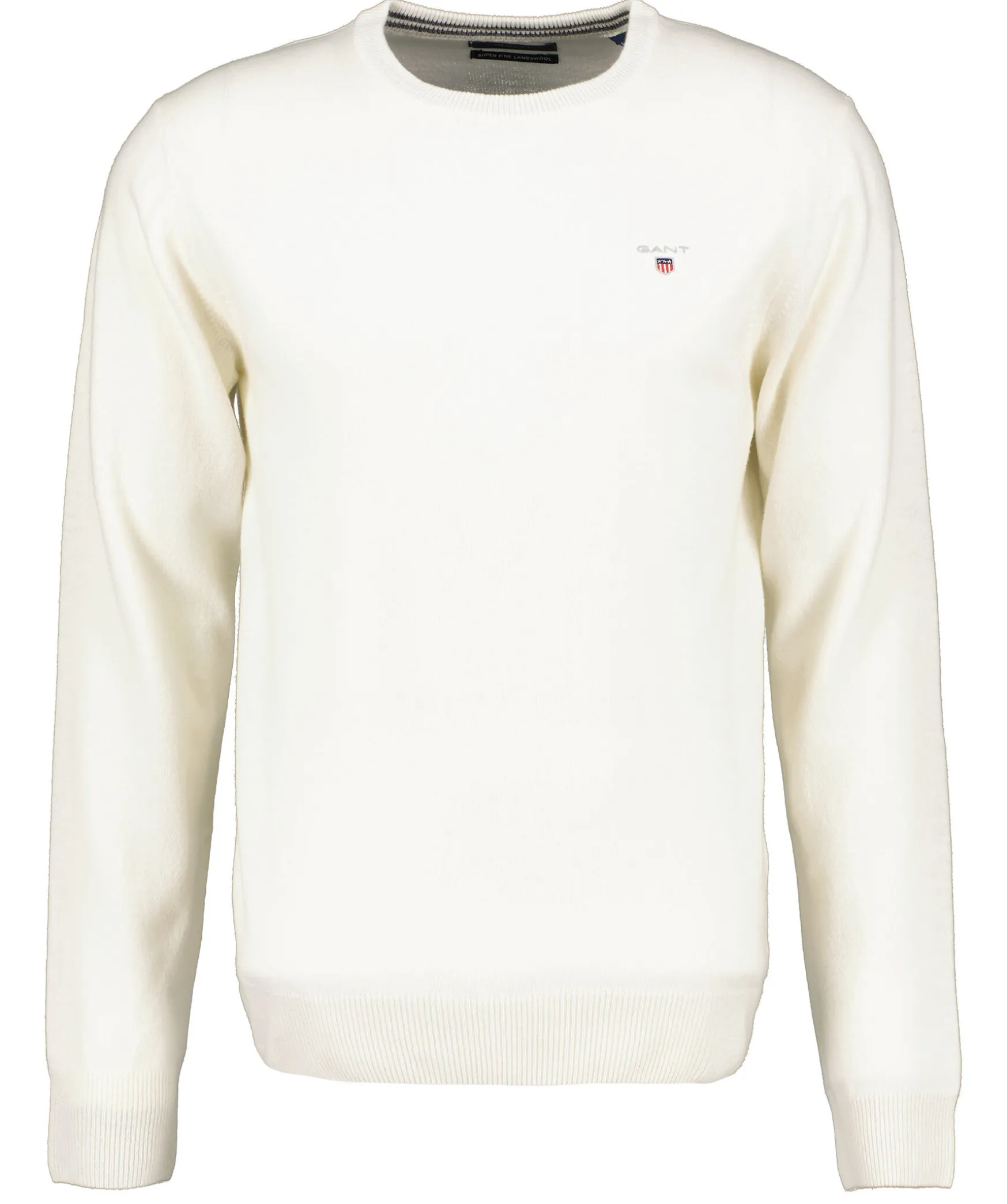 Vit Finstickad Ulltroja Fran Gant. Trojan Ar Gjord I Fint Lammull. Broderad Logotyp Med Skold Pa Brostet. Ribbstickade Muddar.