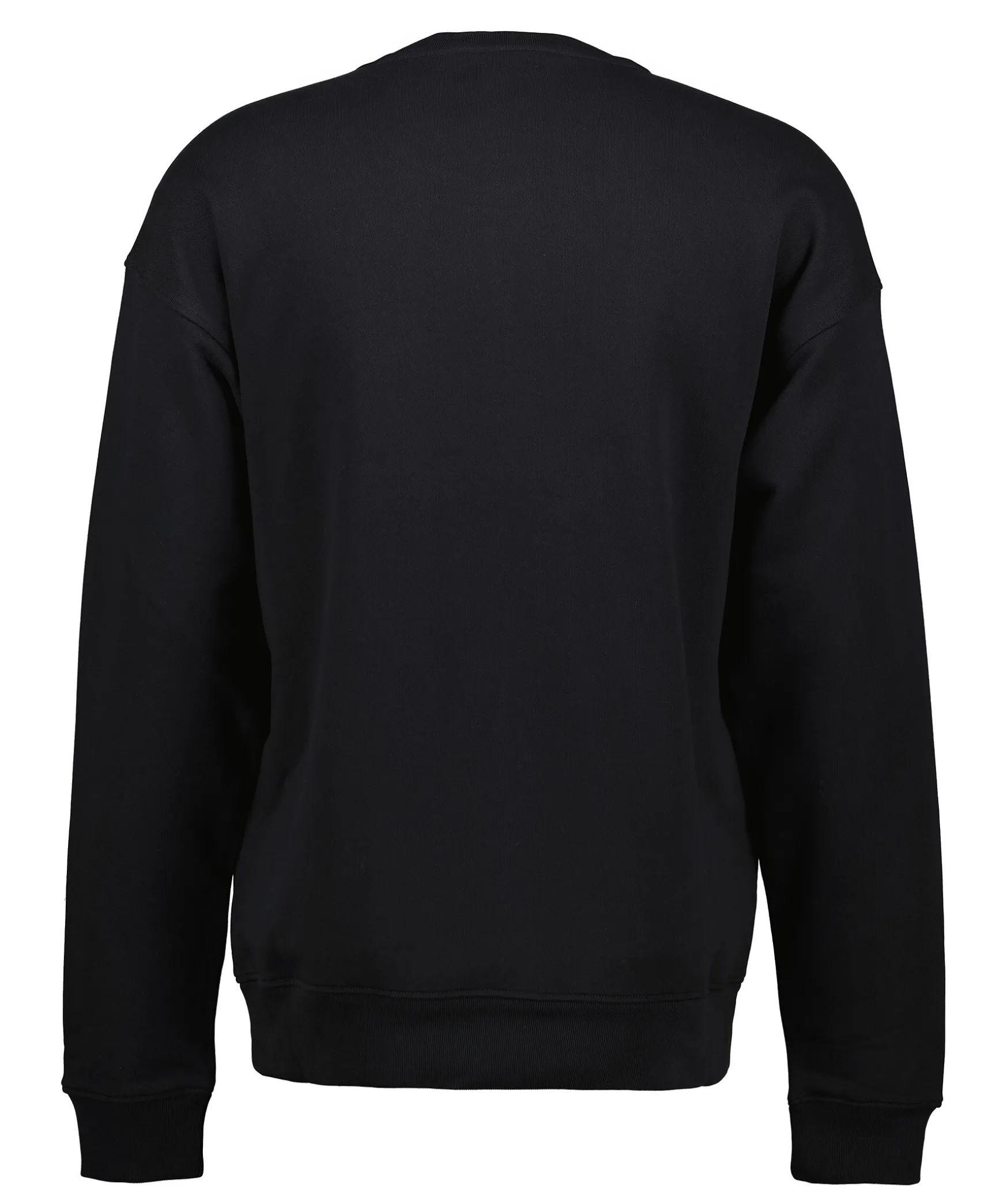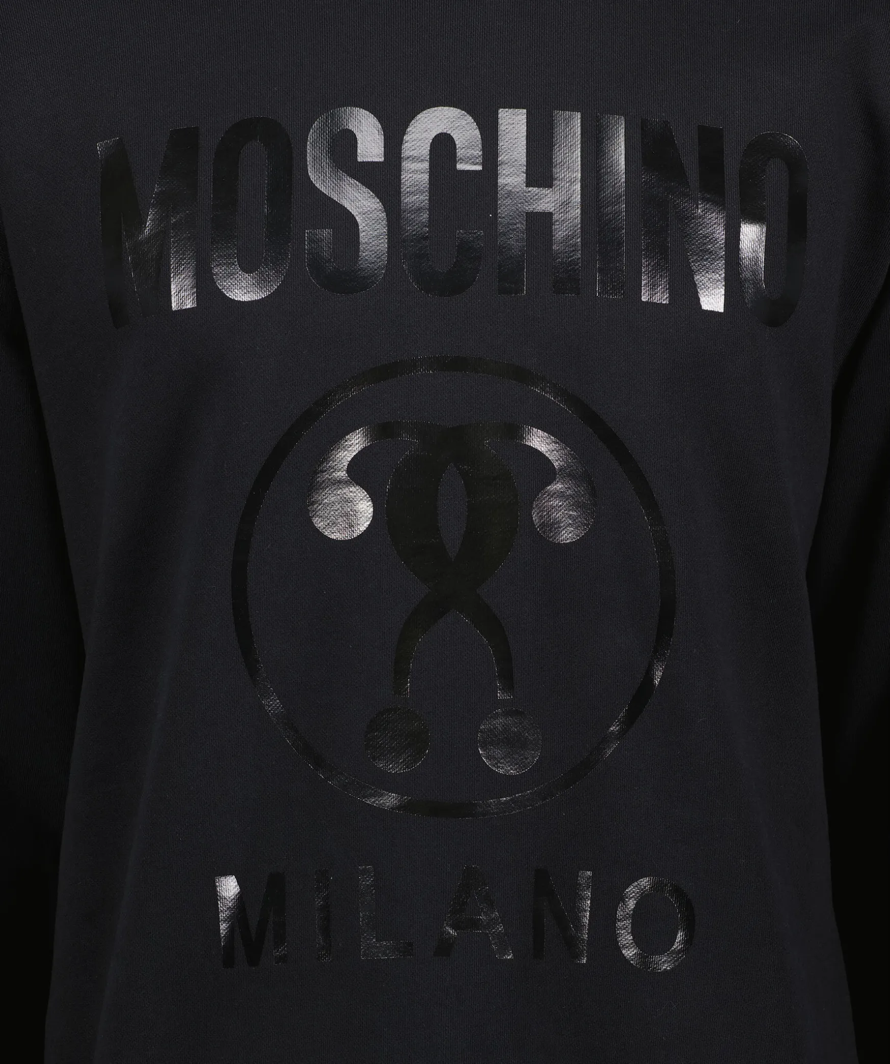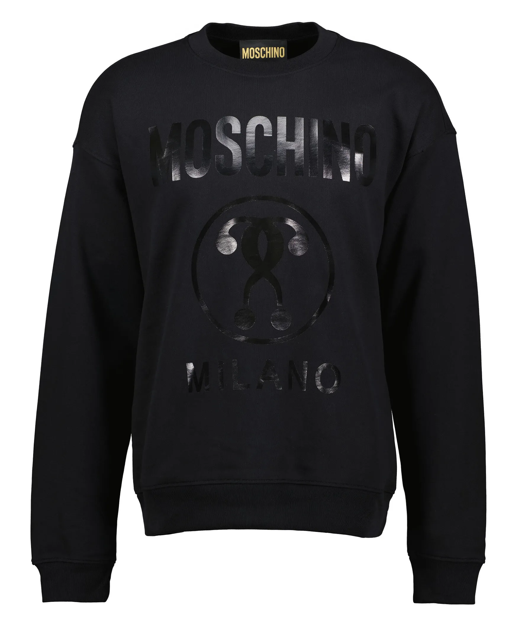 Svart Sweatshirt Fran Moschino Med Dubbelt Fragetecken-Logotyptryck Pa Framsidan I Glansigt Material. Ribbstickad Halsringning Samt Muddar Vid Arm- Och Plaggslut. Nagot Tappade Axlar. Tillverkad I 100% Bomull.
