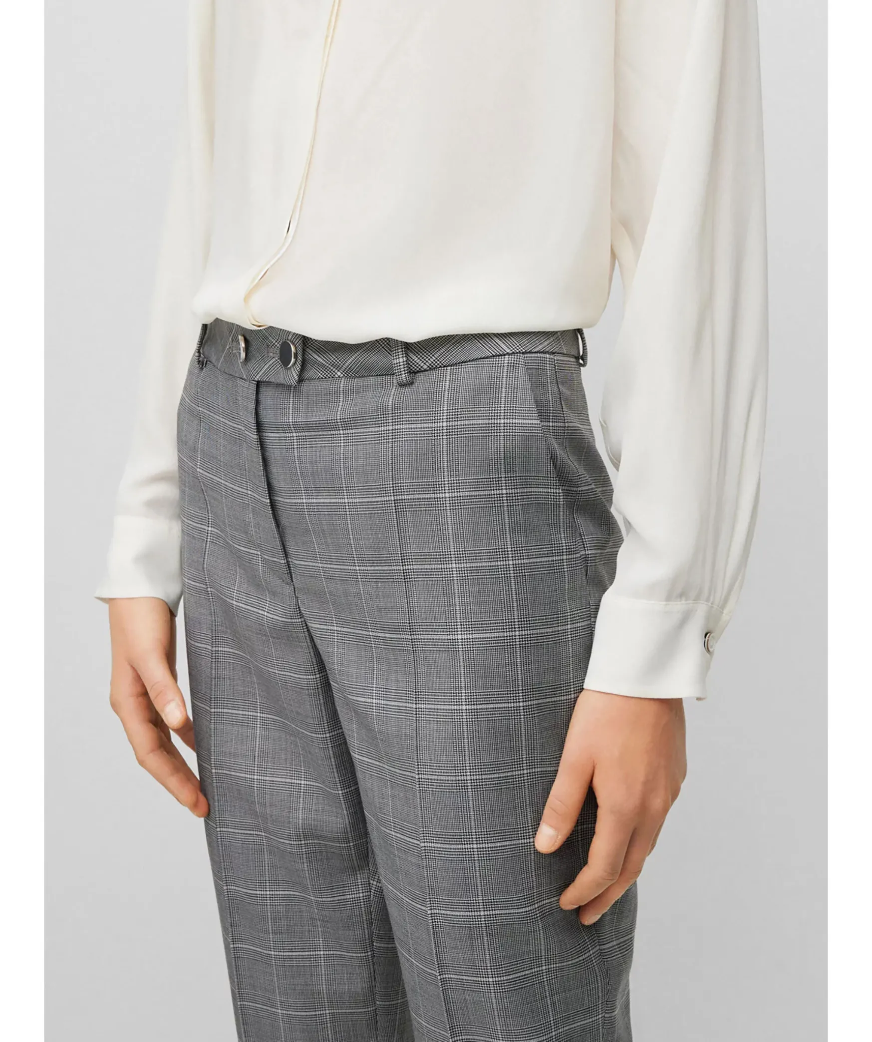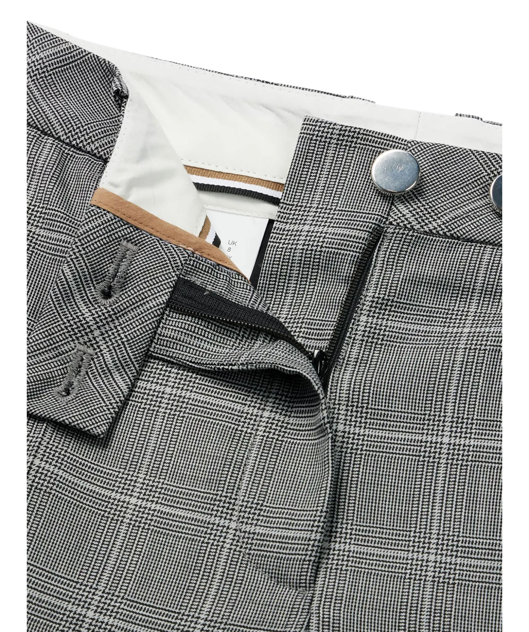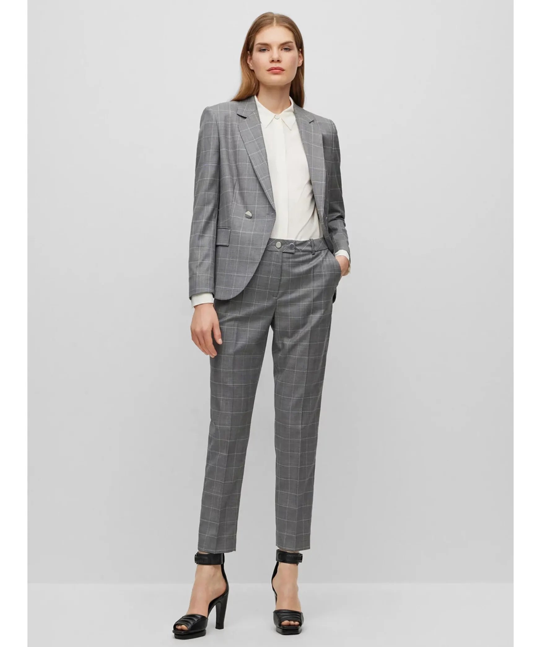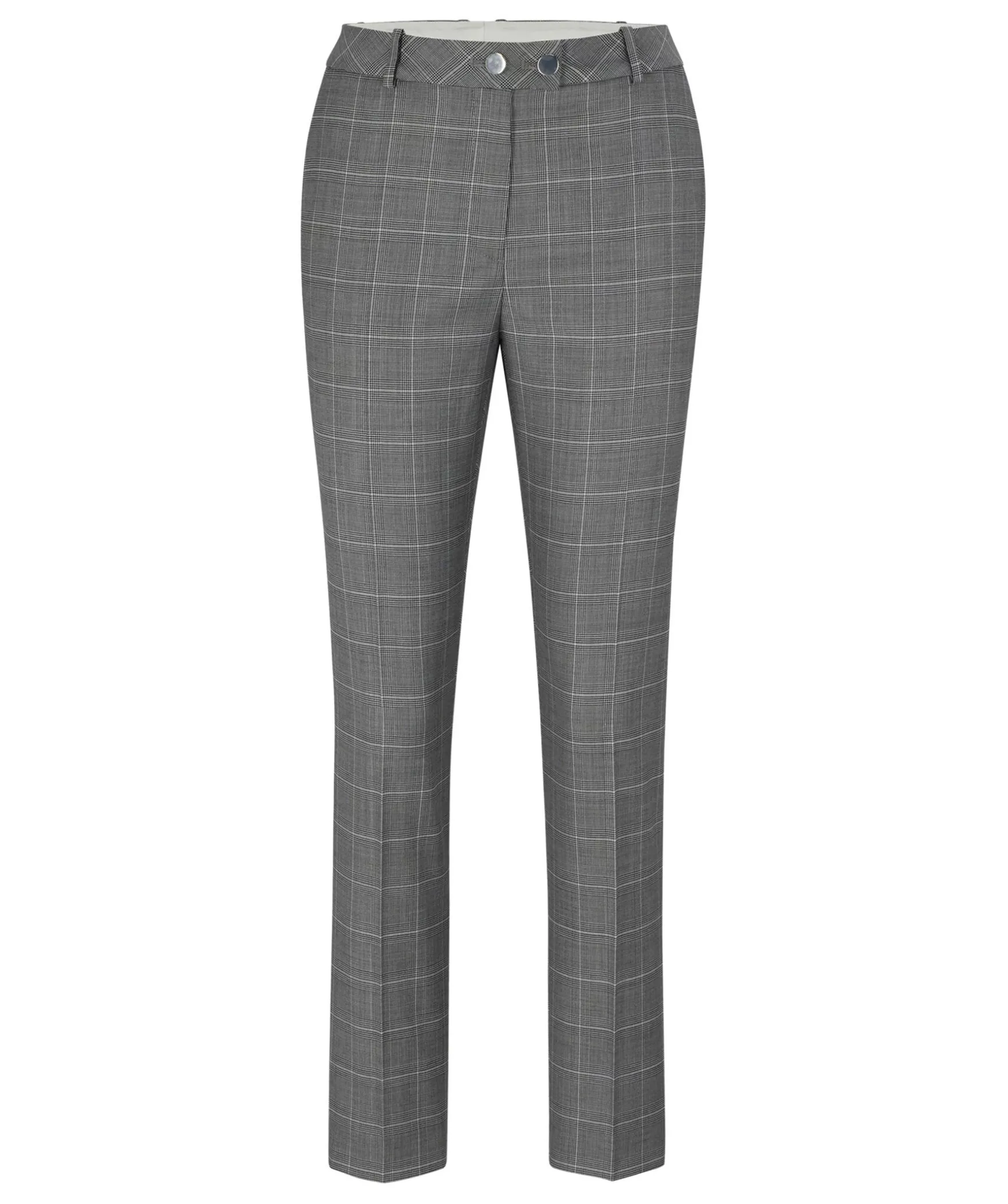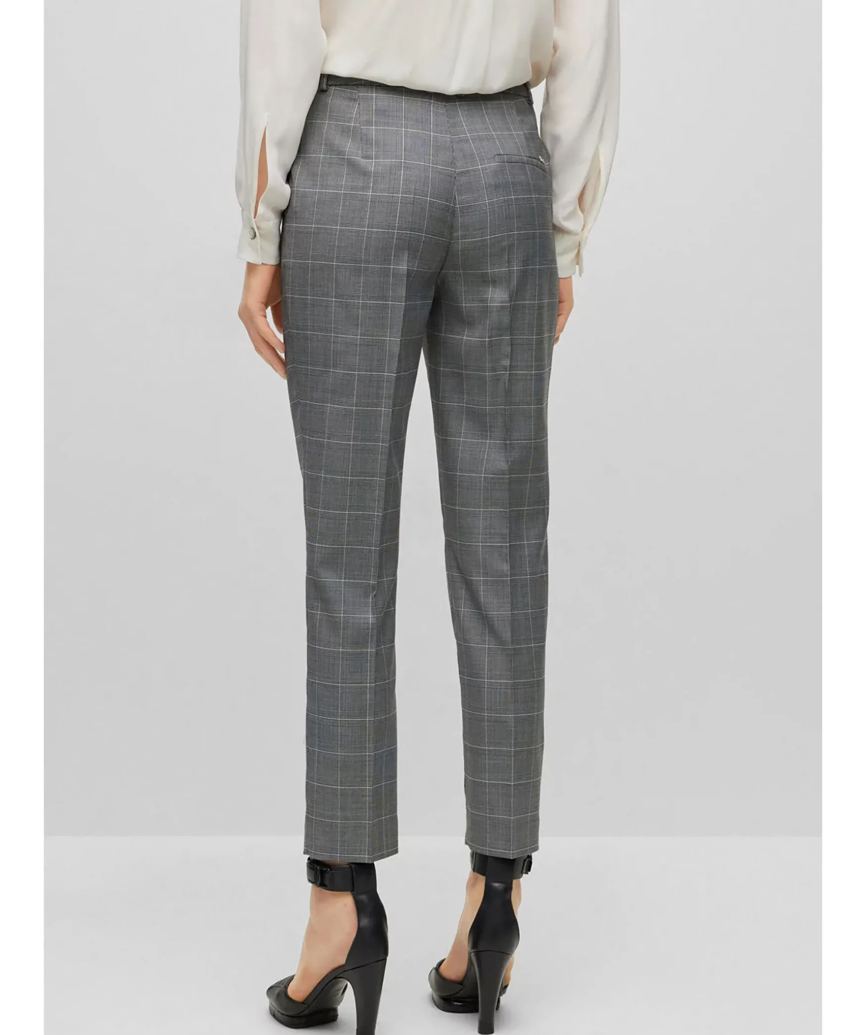 Graa Kostymbyxor Fran Boss Black. Byxor Med Hog Midja I Rutig Jungfrulig Ull, Skuren Till Rak Passform Med Smala, Avskurna Ben Fran Boss Womenswear. Tva Sidfickor Samt En Passpoal Bakficka. Balteshallor I Midjan.