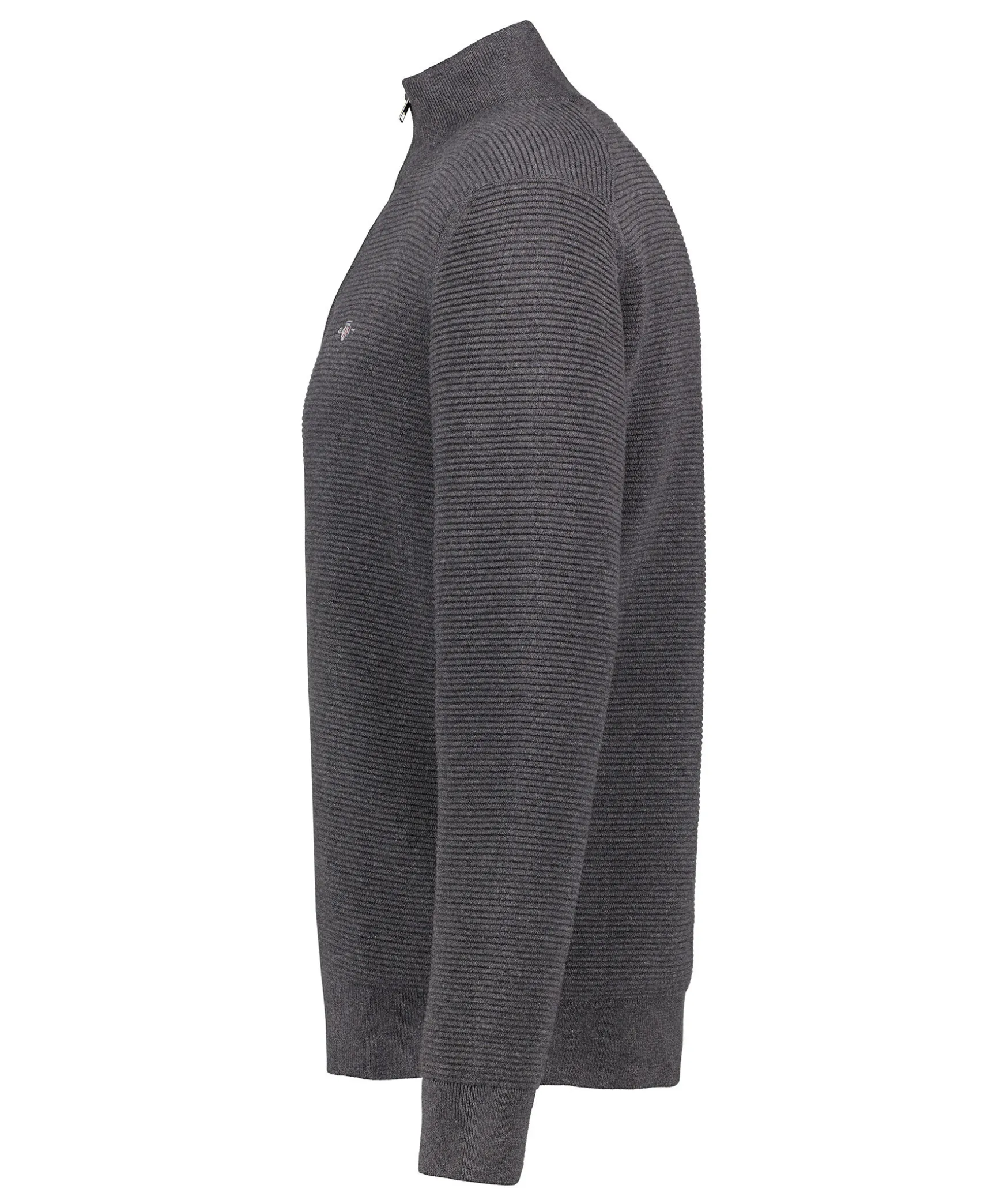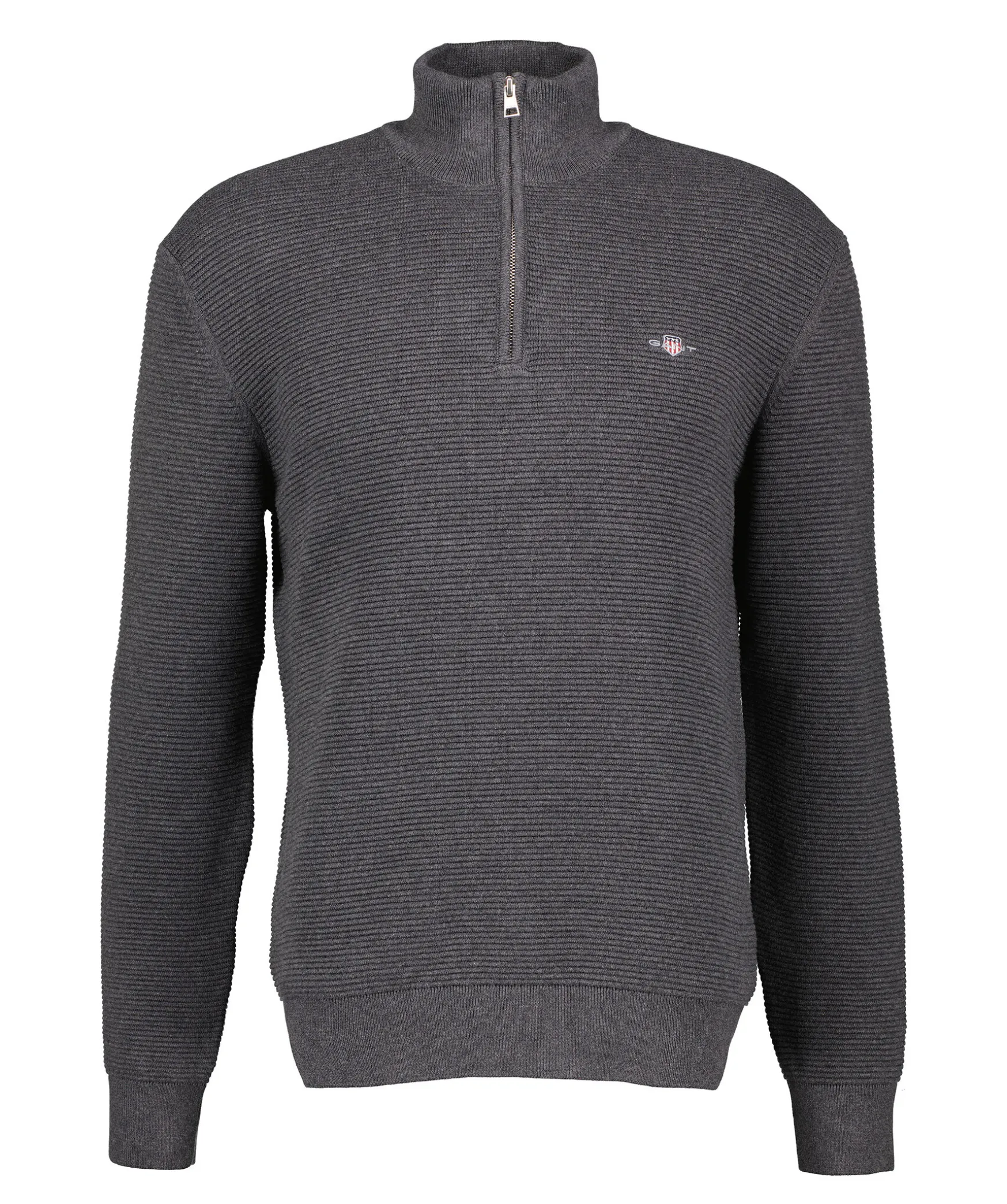Morkgra Texturerad Troja I Latt Bomull Med Halv Dragkedja Fran Gant. Normal Passform Samt Ribbstickade Muddar Och Krage. Den Har Formstickade Detaljer Och Deras Klassiska Gant-Skold Broderad Pa Brostet.