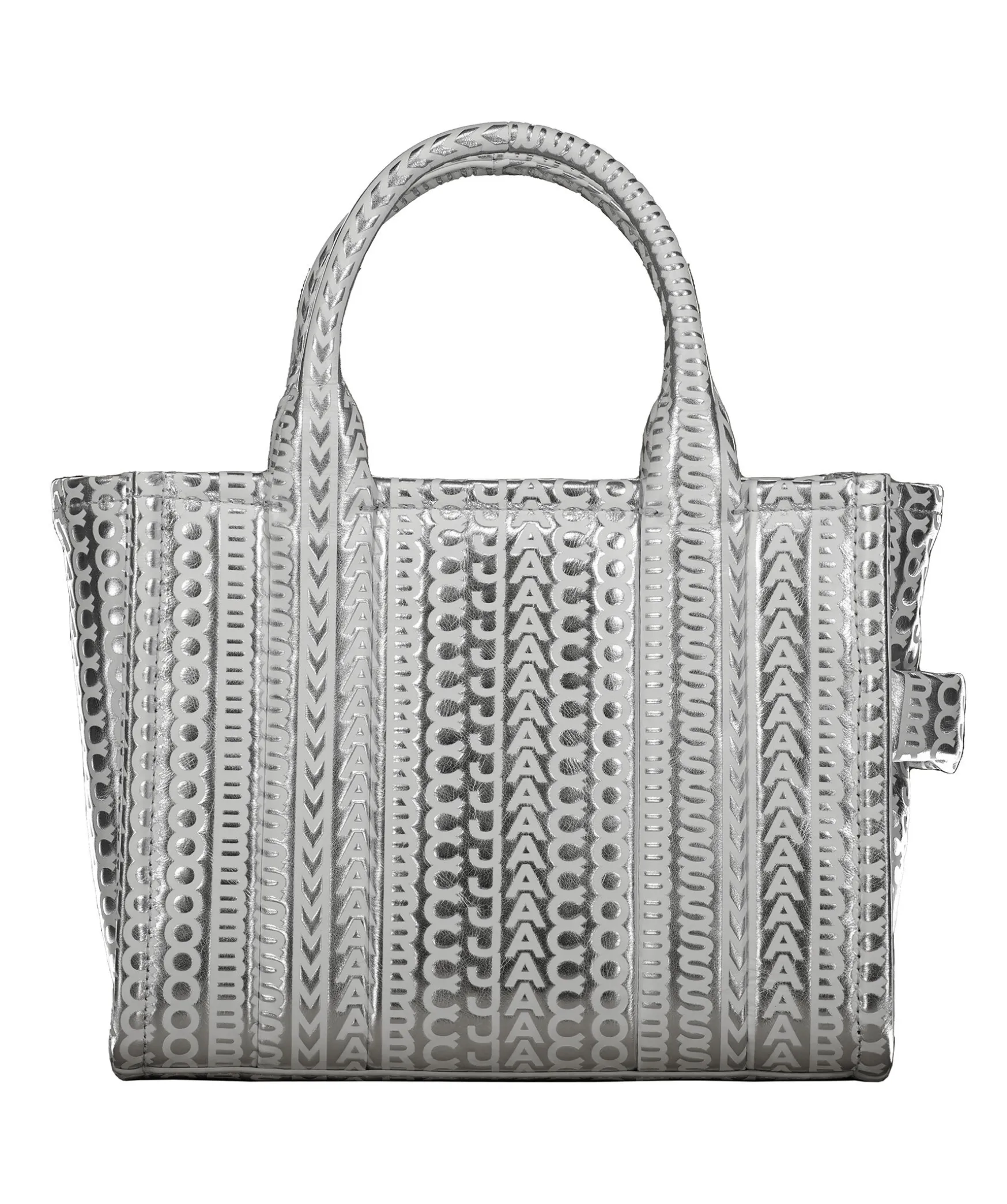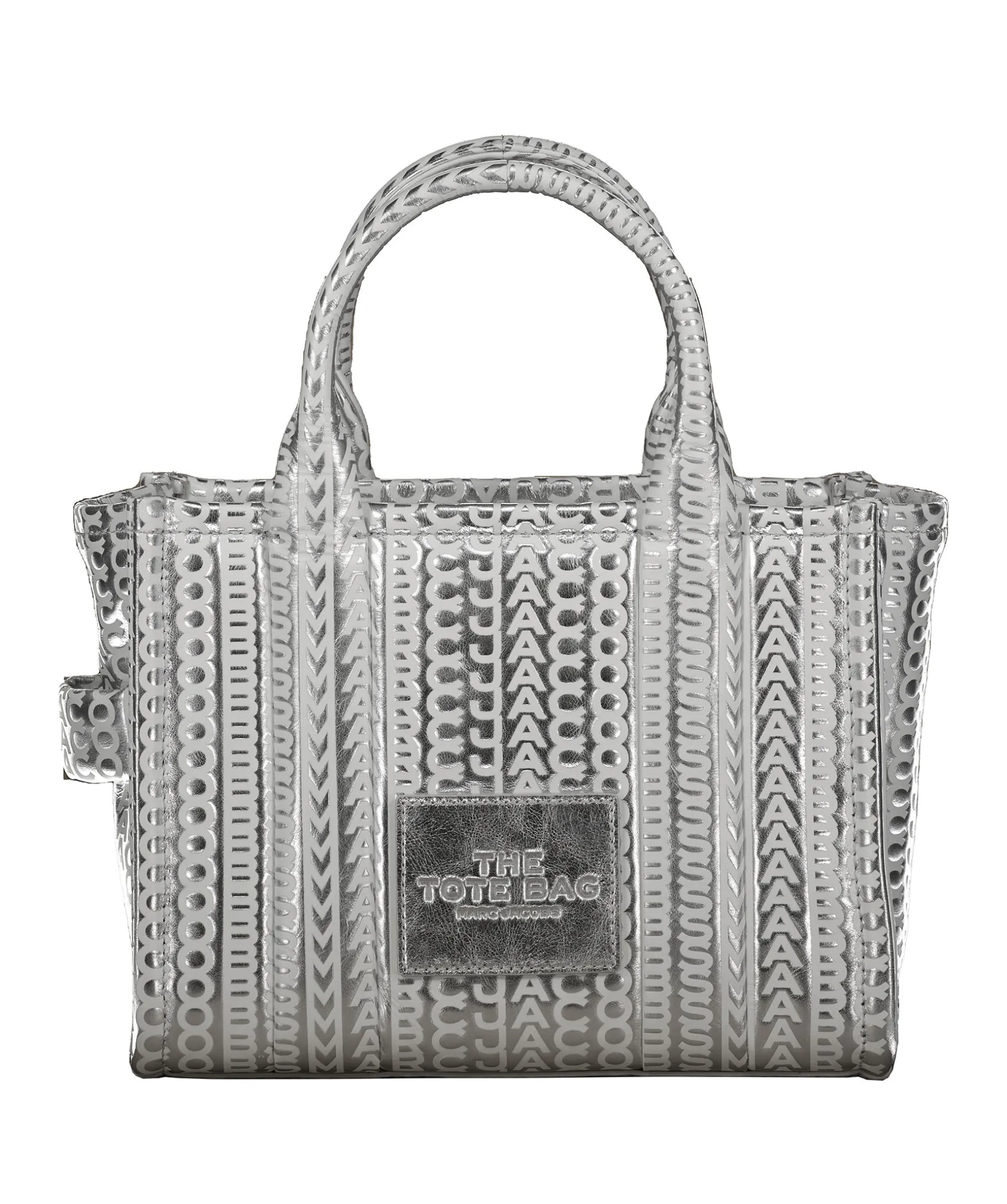 Silvrig Minivaska Fran Marc Jacobs Med En Slaende Vit Monogramdesign Praglad Pa Lader. Toppstangning Med Dragkedja. Topphandtag, Avtagbar Och Justerbar Laderrem. 1 Kortplats. Dustbag Ingar. 26Cm L X 13Cm D X 21Cm H.
