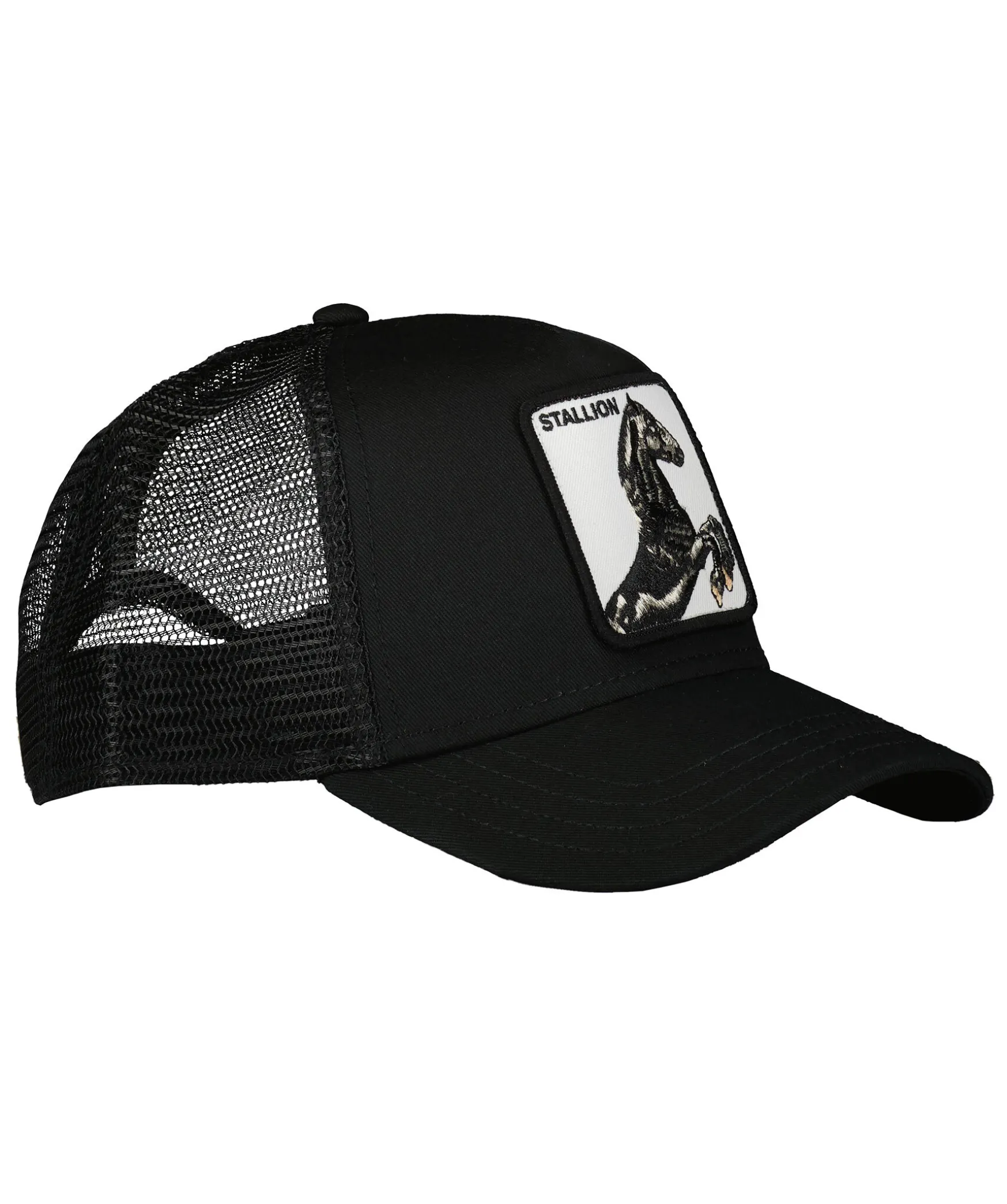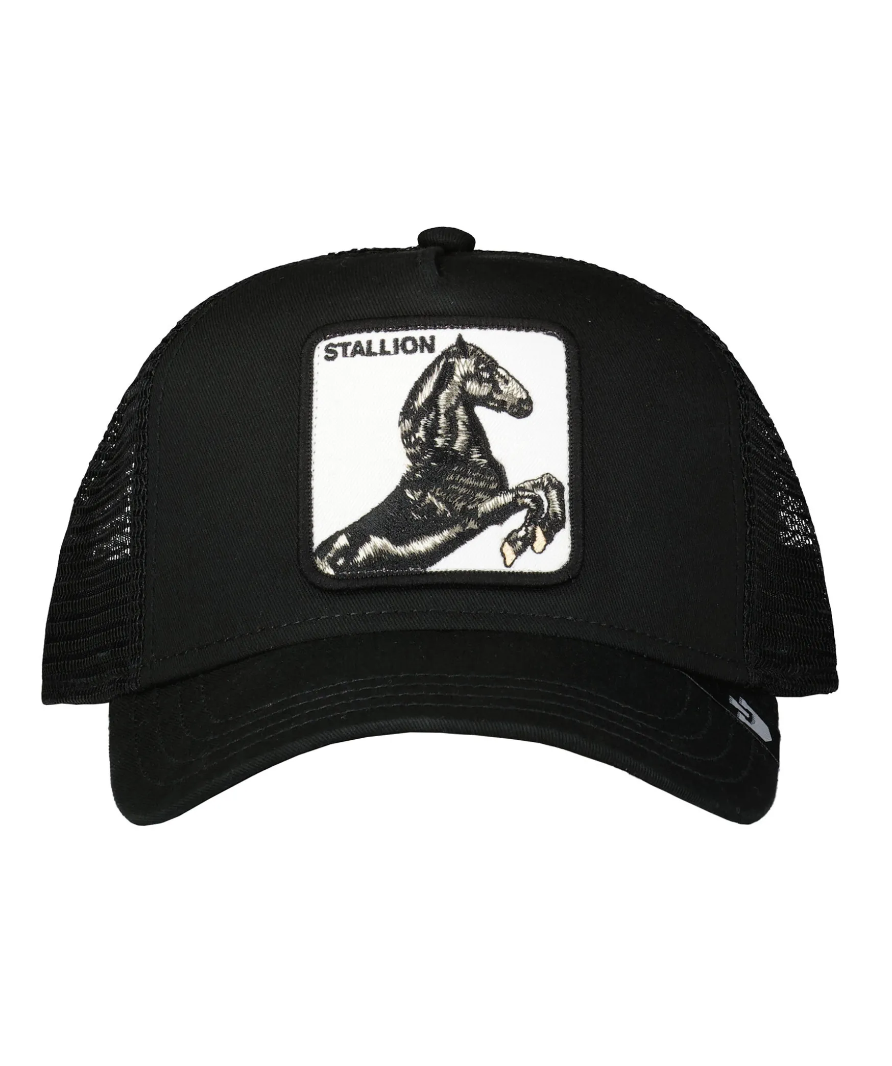 Svart Keps I Trucker-Basebollmodell Med Fyrkantig Patch Med Ett Hastmotiv Framtill Fran Goorin Bros. Onesize Storlek Med Ett Justerbart 4-Snap-In-Rem, Vilket Betyder Att Storleksintervallet Ar 55 Cm-61 Cm Med 58 Cm I Mitten. Ett Bomullssvettband Finns Fastsytt Pa Insidan. Tillverkad I En Polyesterblandning.