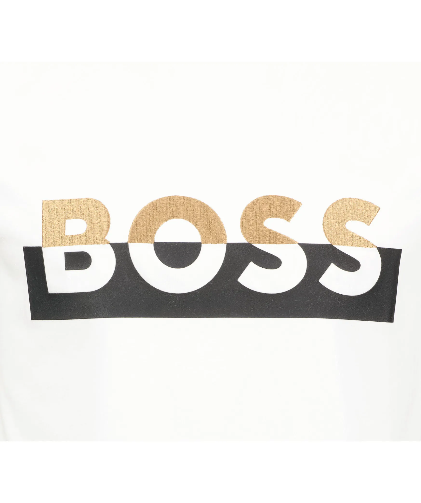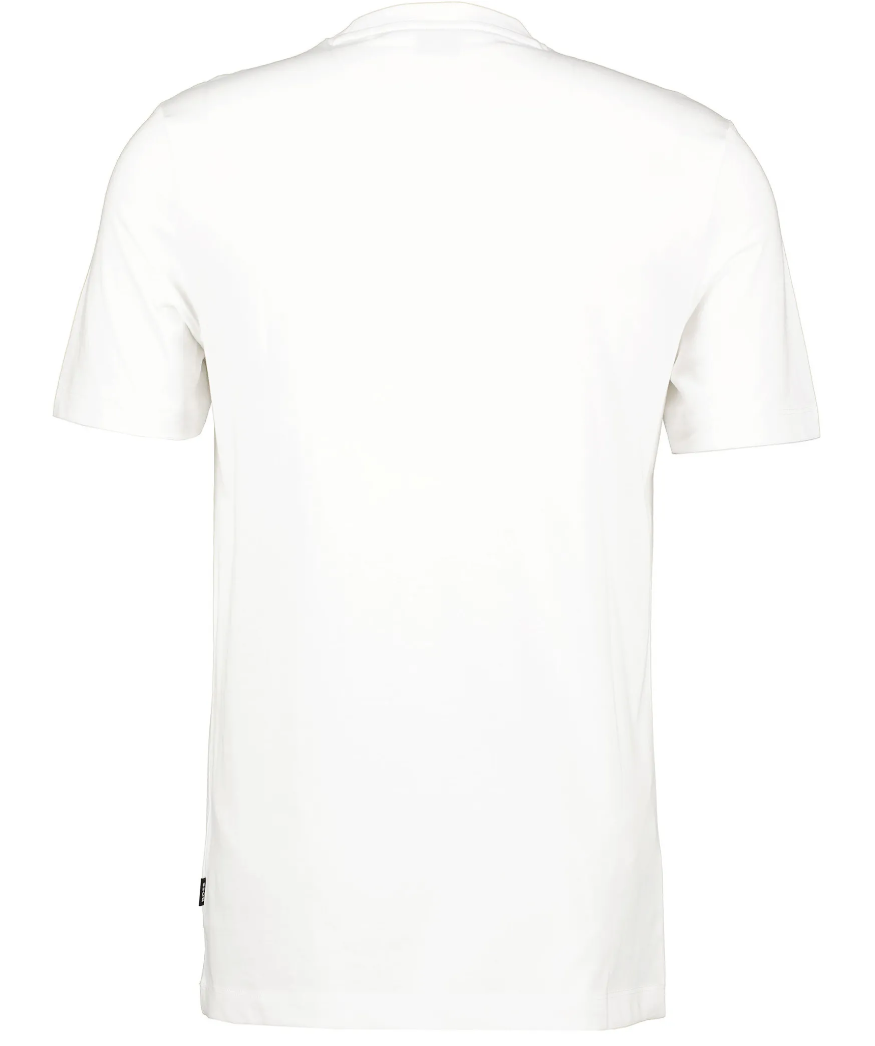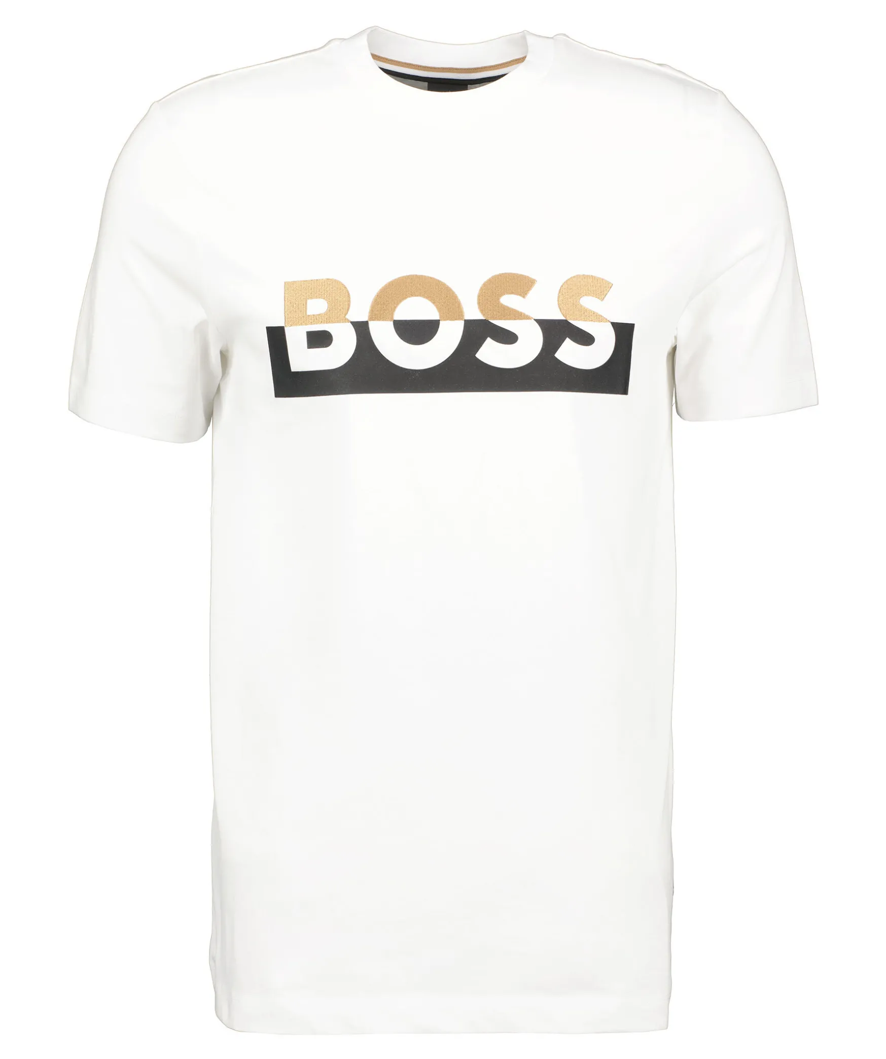 Vit T-Shirt Fran Boss Black. Tillverkad I 100% Bomull. Ribbstickad Halsring. Gummerad Och Broderad Logotyp I Beige, Svart Och Vitt Over Brostet.