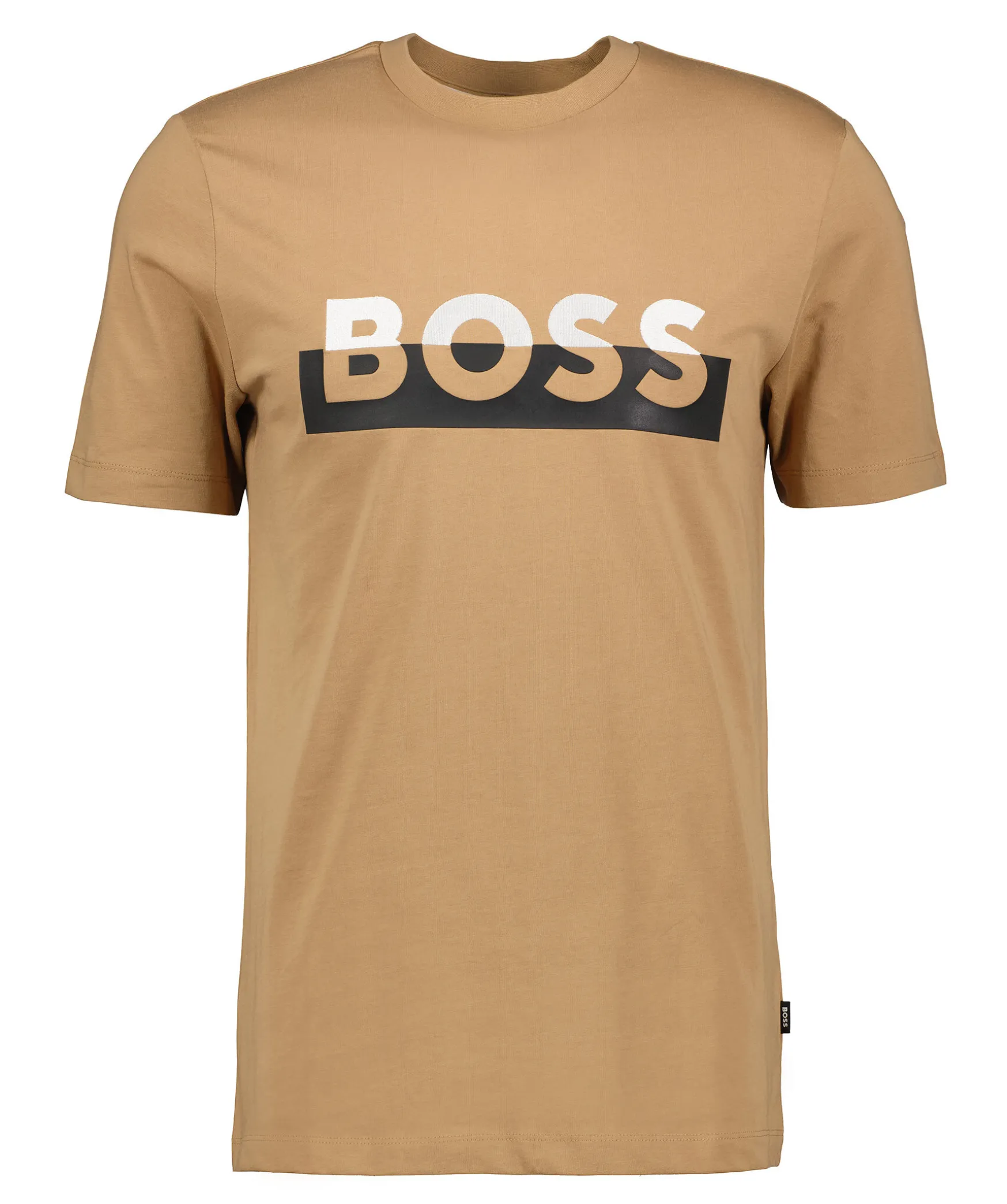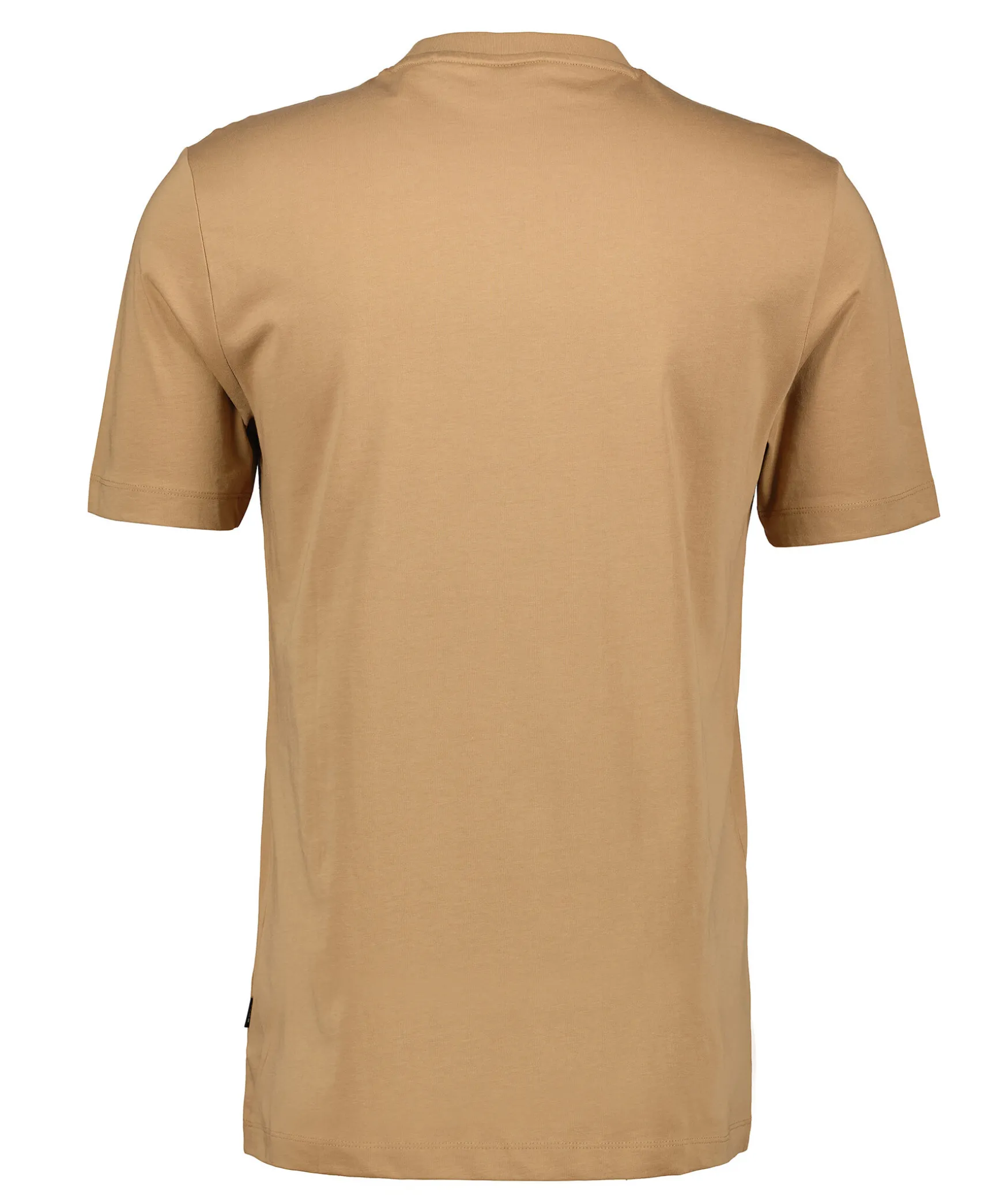 Kamelfargad T-Shirt Fran Boss Black. Tillverkad I 100% Bomull. Ribbstickad Halsring. Gummerade Logotyp I Matchande Farg Till Troja, Svart Och Vitt Over Brostet.