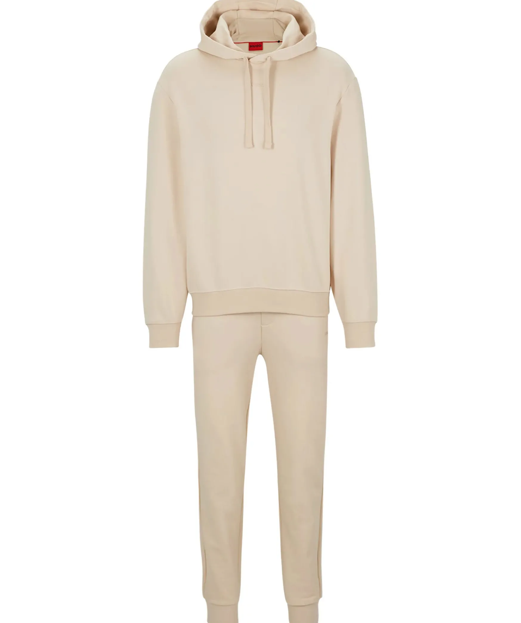 Beige Tracksuit Set I Relaxed-Fit Fran Hugo. Tillverkad Av Mjuk Terry-Bomull Och Med Loggor I Ton-I-Ton. Trojan Har Huva Med Snorning Och Extra Langa Armar Samt Ribbstickade Muddar Vid Arm Och Plaggslut. Byxorna Har Resar I Midjan Med Snorning Samt Ribbstickad Benslut Och Tva Sidfickor.