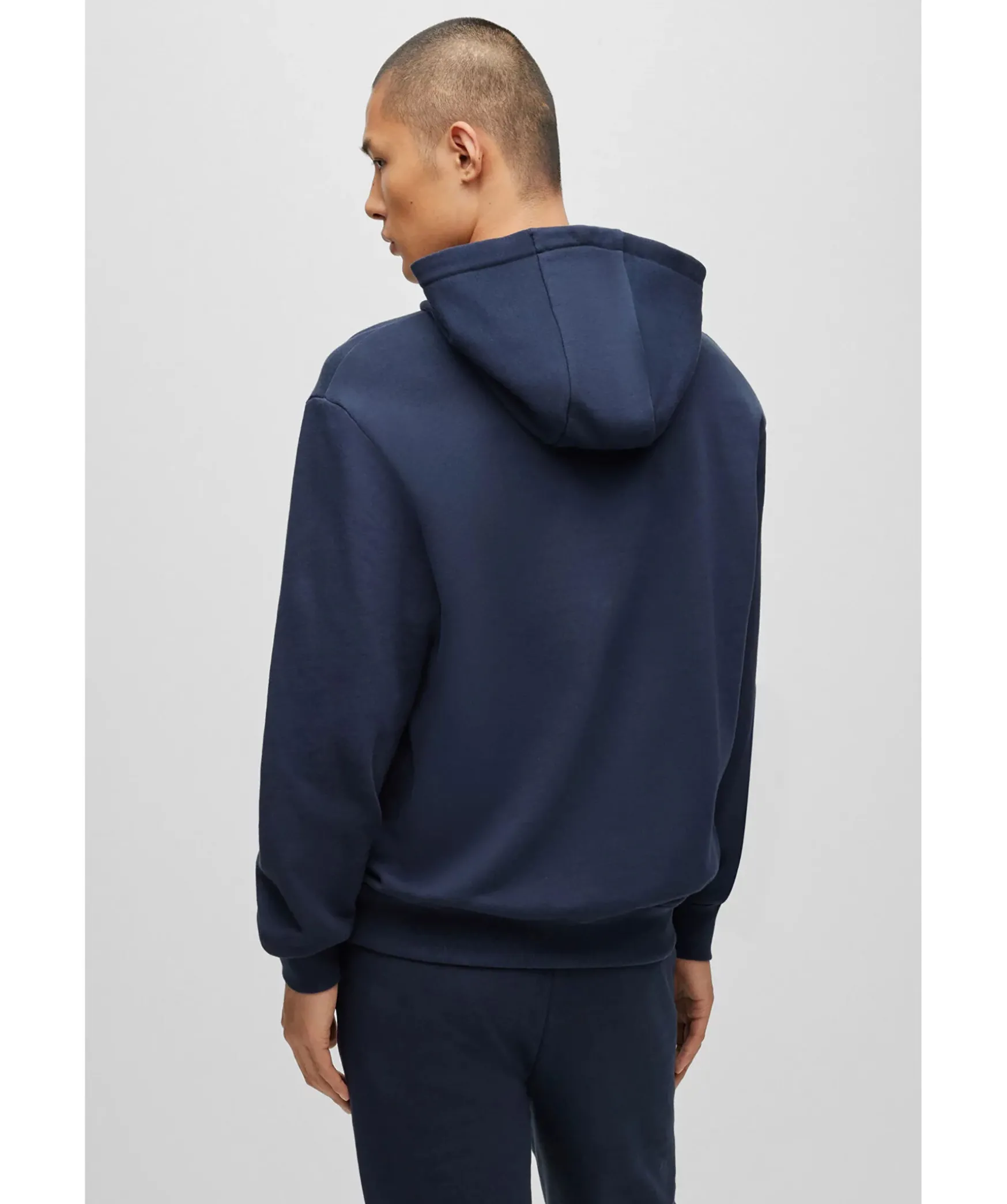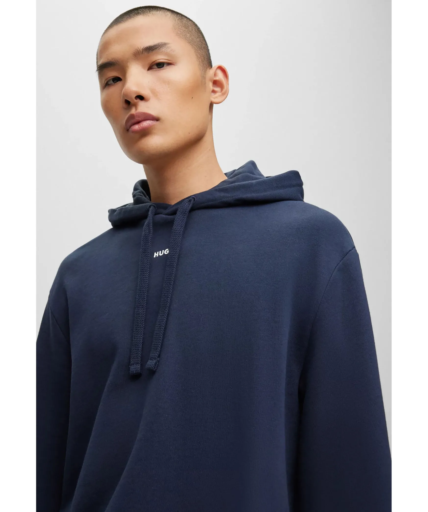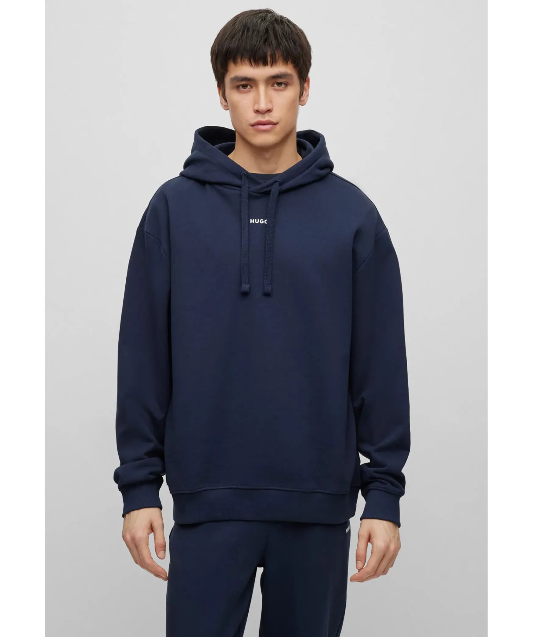 Marinblatt Tracksuit Set I Relaxed-Fit Fran Hugo. Tillverkad Av Mjuk Terry-Bomull Och Med Loggor I Vitt. Trojan Har Huva Med Snorning Och Extra Langa Armar Samt Ribbstickade Muddar Vid Arm Och Plaggslut. Byxorna Har Resar I Midjan Med Snorning Samt Ribbstickad Benslut Och Tva Sidfickor.