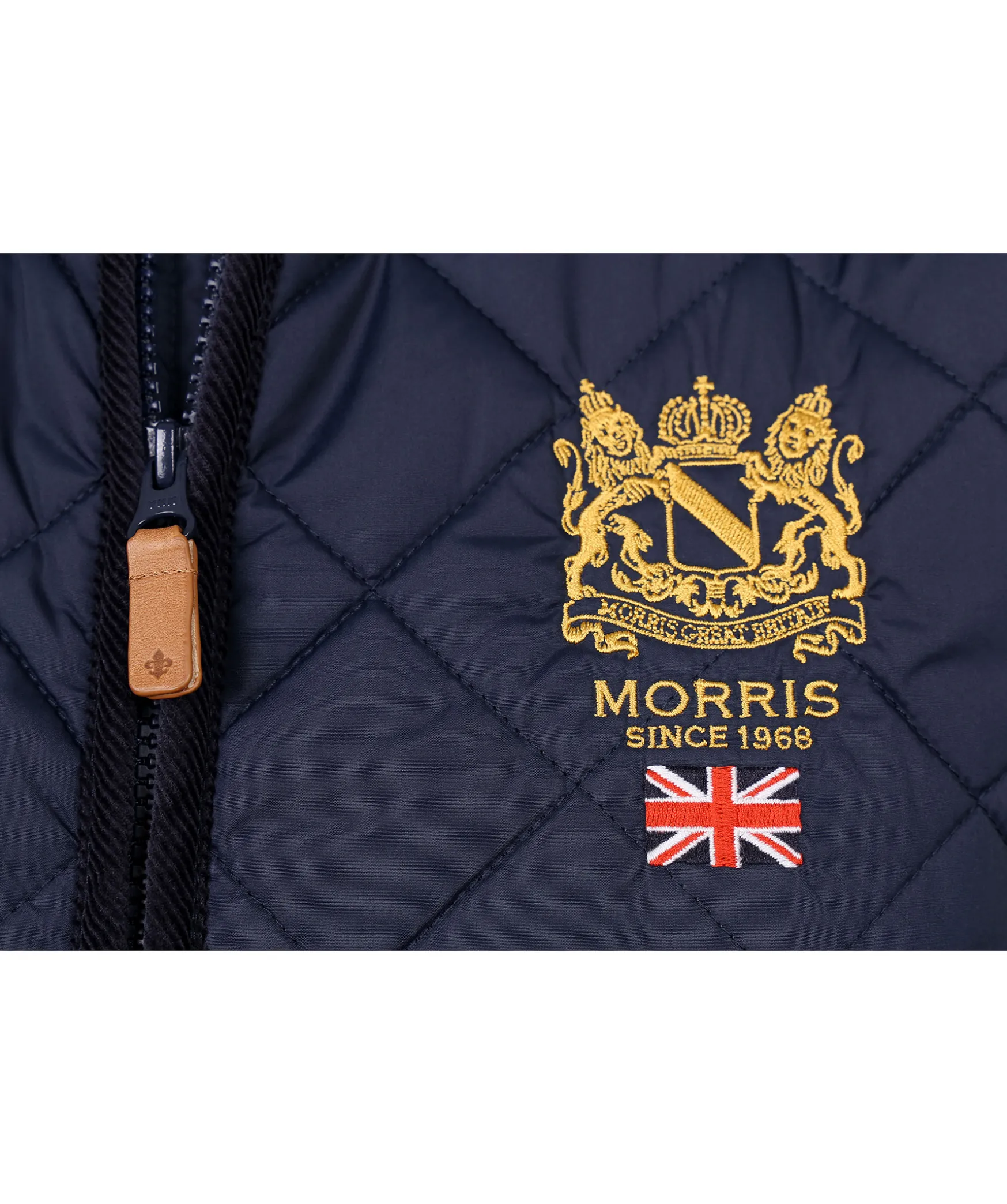 Marinbla, Quiltad Vast Fran Morris. Brodyr Pa Brostet Och Detaljer I Manchester. Bla Dragkedja Fram Med En Lopare I Ljusbrunt Lader Och Liten Morris-Lilja Pa. Tva Framfickor Med Tryckknapp Och Halla I Nacken Att Hanga Upp Vasten I.* Manchesterdetaljer* Framfickor* Quiltad