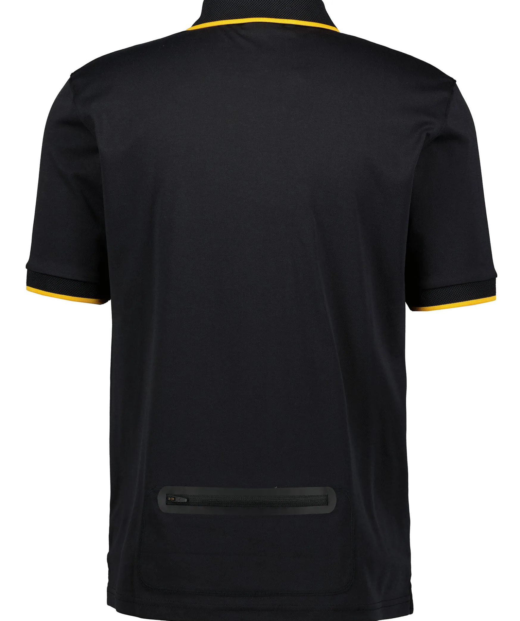 Svart Golfpike Med Orangea Detaljer Fran J.Lindeberg. Tillverkad I Bomull Och Polyesterblandning. Svart, Kort Dragkedja Fram, Korta Slitsar I Sidorna. Orange Logotyp Pa Sidan Av Brostet Och Orange Rand Langst Ut Pa Kragen Och Pa Mudden Pa Armarna.