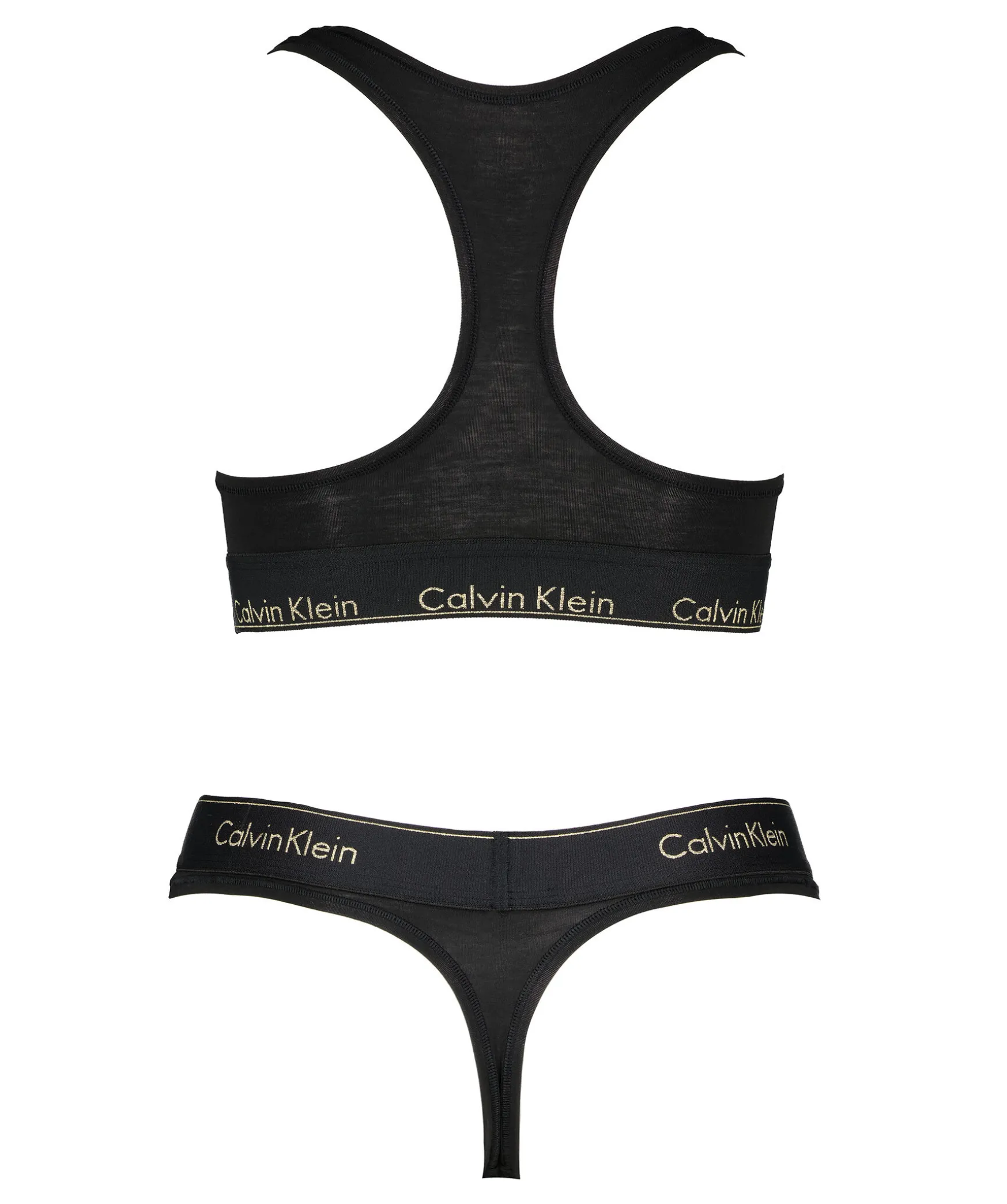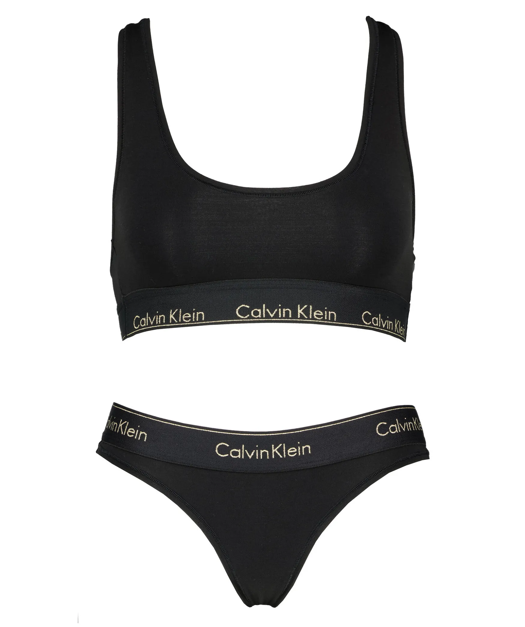 Svart Underkladesset Fran Calvin Klein Underwear. Perfekt Att Ge Bort Som Present Da Detta Bralett- Och Stringset Presenteras I En Presentforpackning. Bade Trosor Och Bralett Har En Calvin Klein Signatur Guldmetallic-Logotyp Samt Kanter Och Ar En Sportig Look. Tillverkade I En Stretchig Bomull Och Modalblandning.