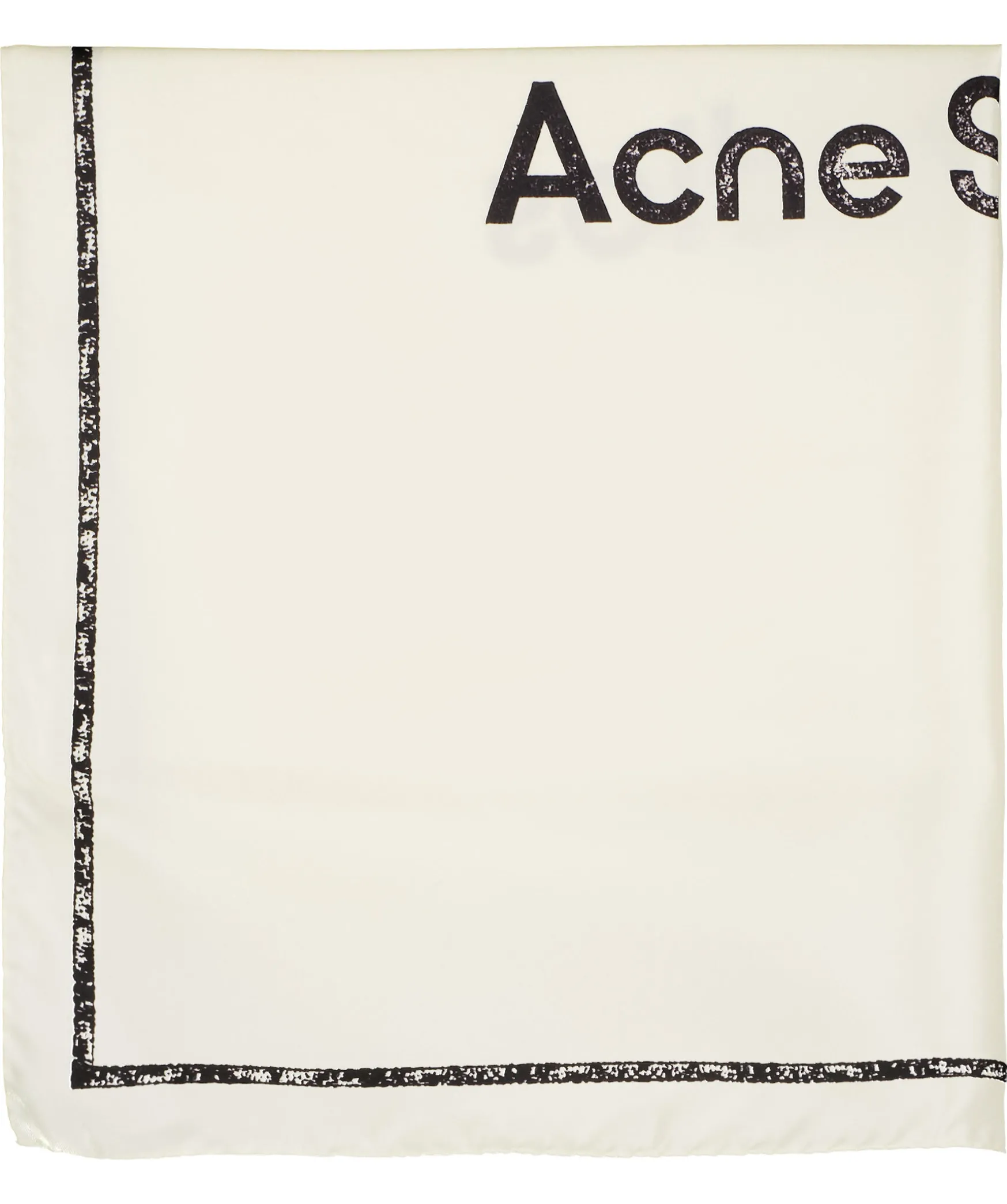 Elfenbens Vit Siden Sjal Fran Acne Studios. Har En Stor Acne Studios Logotyp Och En Svart Tryckt Kant Runt Om. Matt: 64 X 64 Cm.