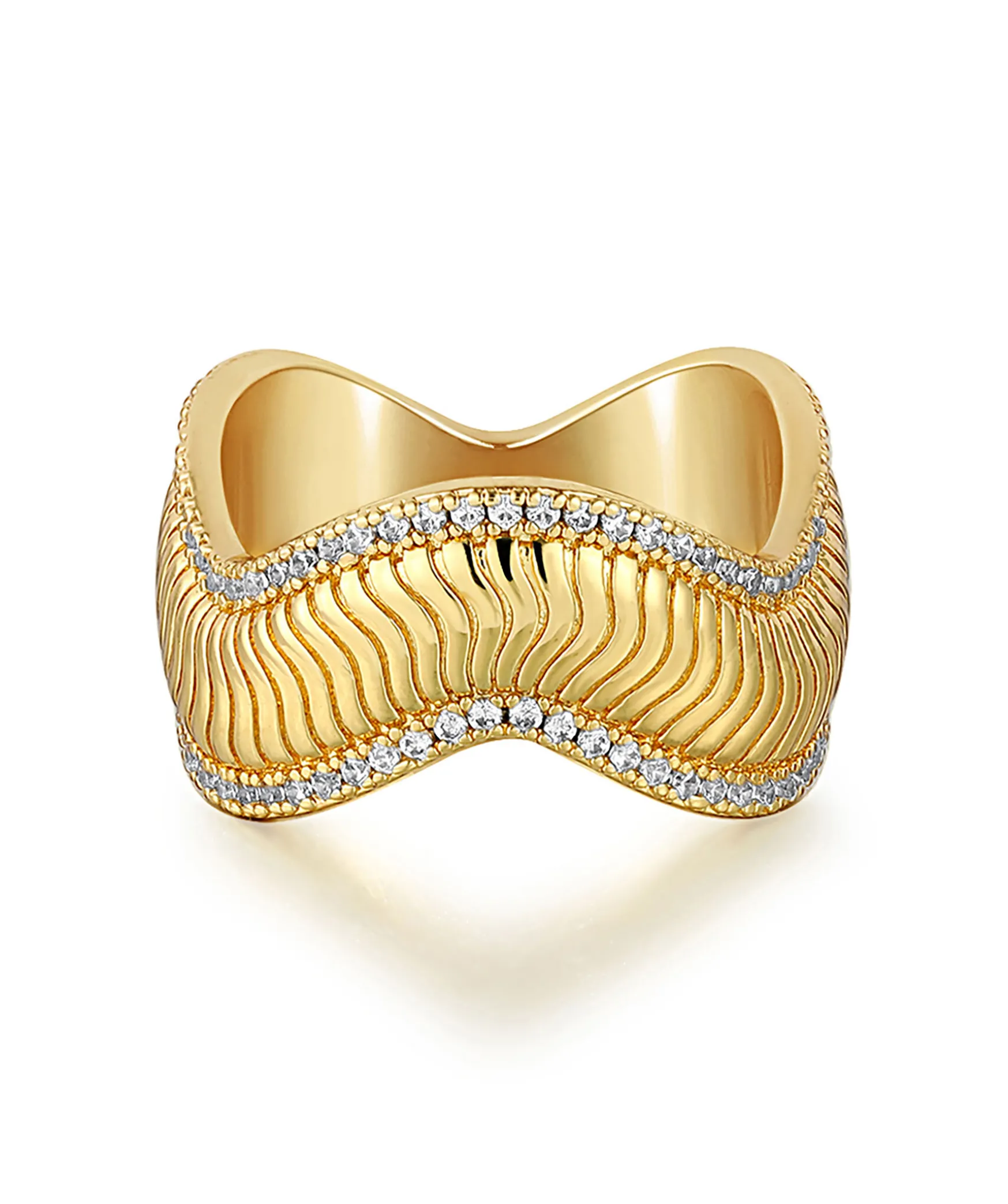 Guldplaterad Ring I Texturerad Metall Med Vagiga Kanter Och Cz-Stenar Fran Luv Aj. 7,5 Mm Hog Och Ar 100% Nickelfri Och Kadmiumfrialla Smycken Anses Vara Vattentata Och Motstandskraftiga Mot Smuts! Ip Plating Anvands Som Star For Ion Plating. Detta Ar En Fysisk Angavsattningsprocess (Pvd) Och Smyckena Ar Platerade Med Minst 0,1 Mikron 18K Guld Eller Silver, Plus E-Belaggning Som Kvalificerar Det Att Klara Vattentata Tester.Om Du Bar Dessa Smycken Varje Dag – I Duschen Och I Sangen, Kommer Du Att Upptacka Att Fargen Inte Bleknar Pa Minst Sex Manader. Vi Rekommenderar Att Du Tar Bort Dina Smycken Nar Du Duschar Och Sover, Och Att Du Haller Dem Borta Fran Vatten Och Lotion Bara For Att Sakerstalla Att Fargen Pa Plateringen Inte Bleknar Med Tiden.