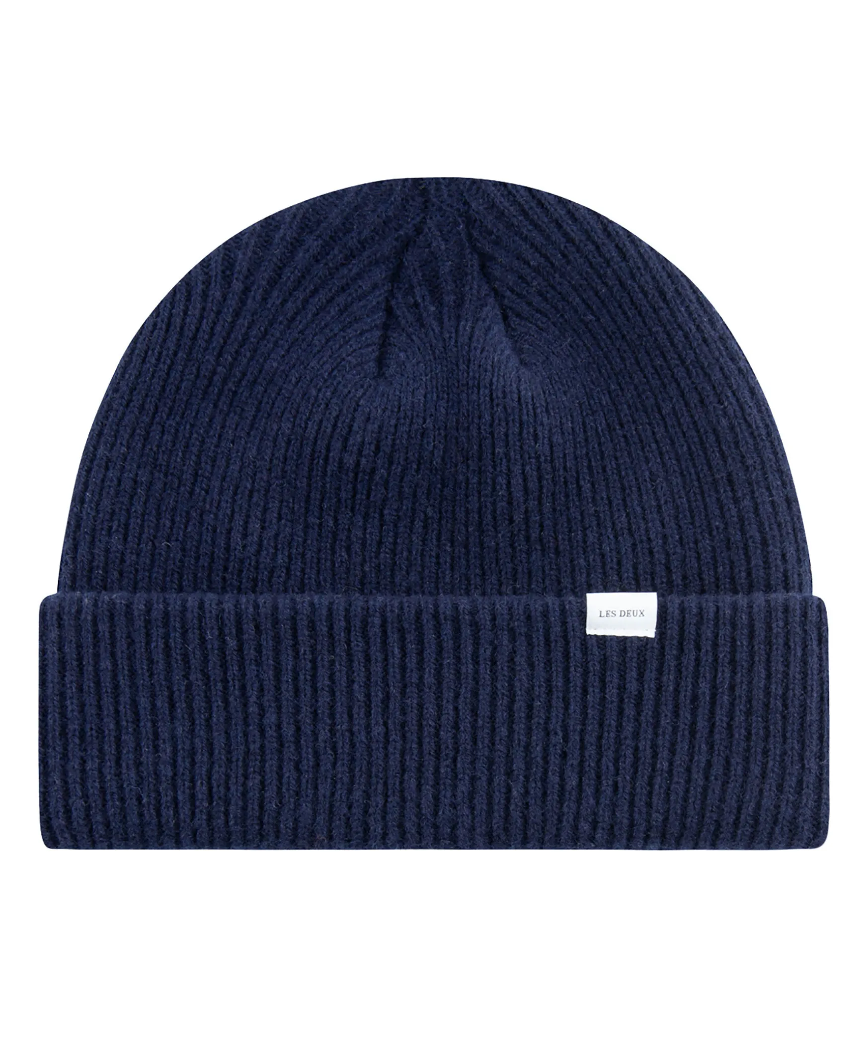 Marinbla Ribbstickad Mossa I Ull Fran Les Deux. Uppvikt Kant Med Liten Logotyp.