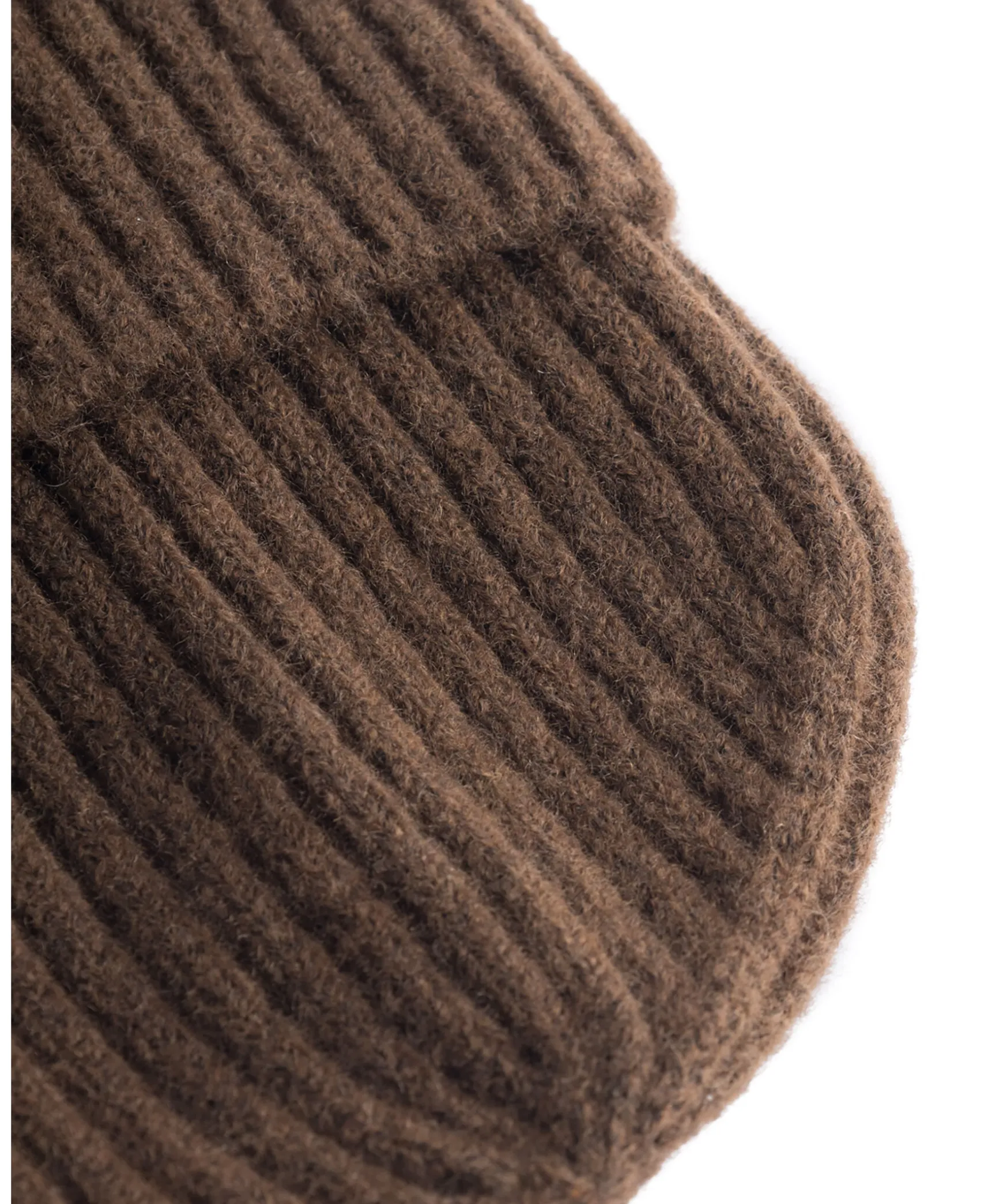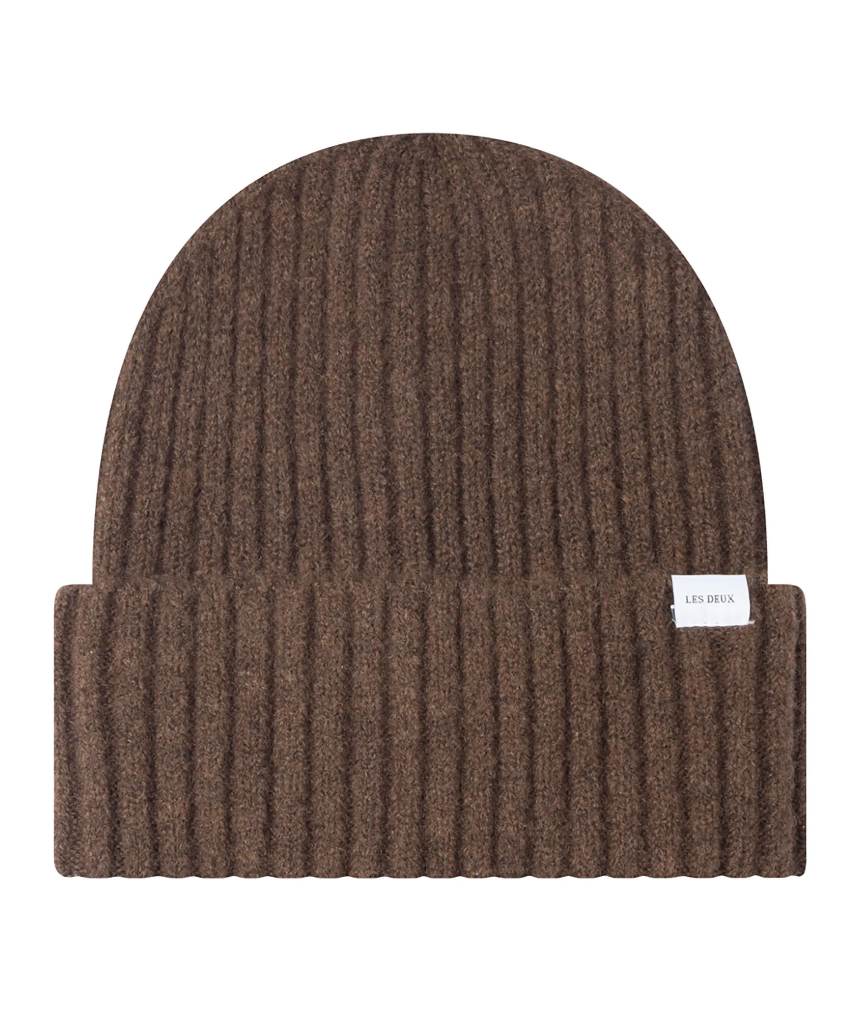 Brun Ribbstickad Mossa Fran Les Deux. Liten Tyglapp Med Logotyp Pa Mossans Uppvikta Kant.