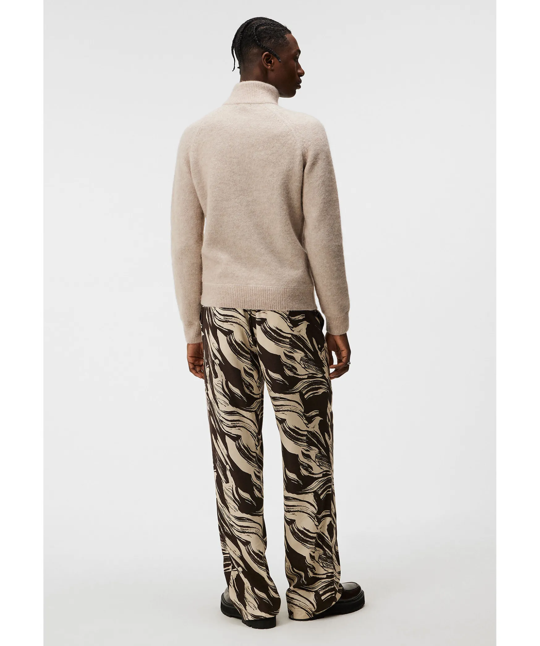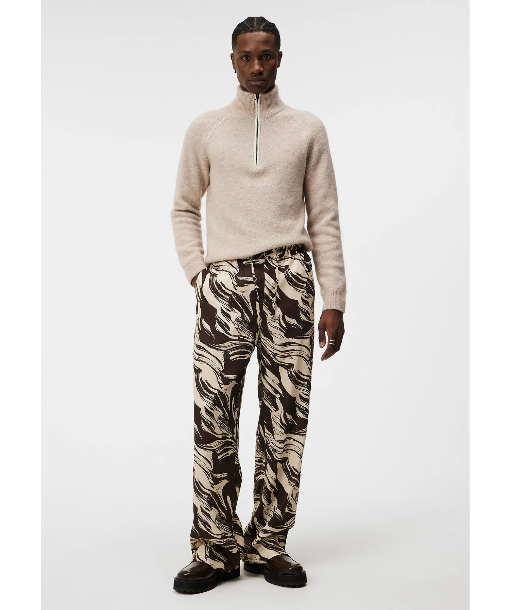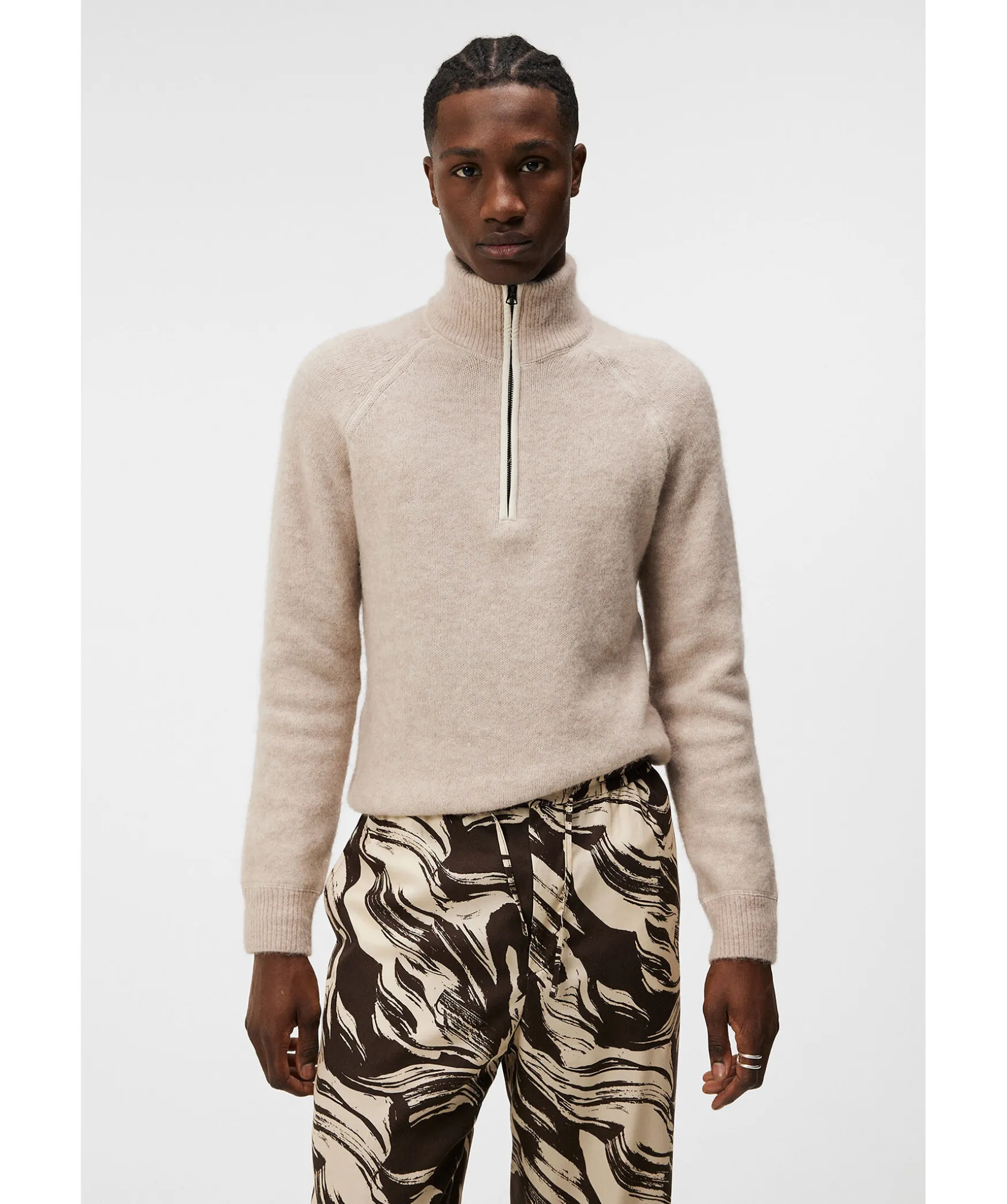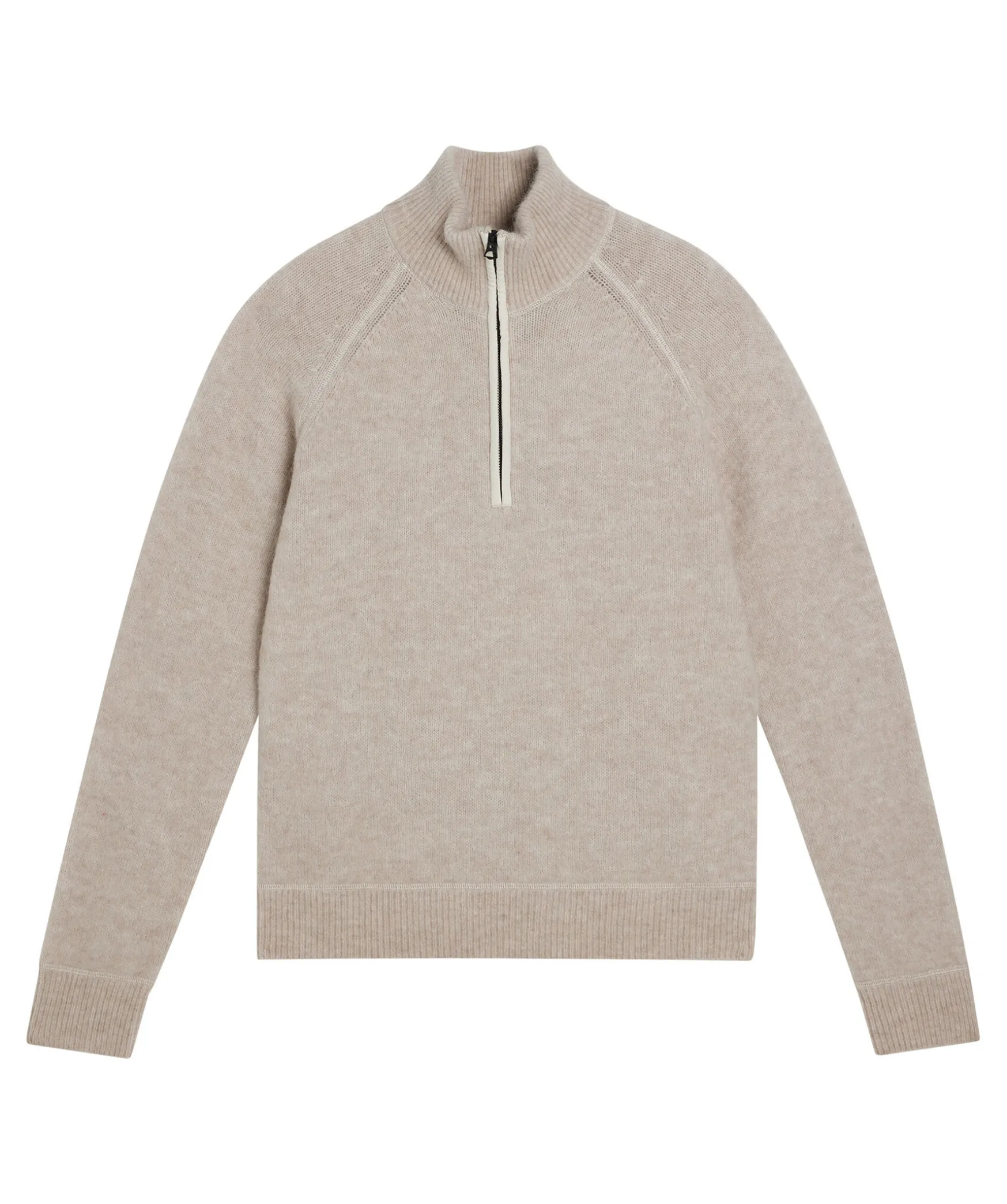 Beige Stickad Half-Zip Fran J Lindeberg. Synliga Och Dekorativa Overlocksommar. Ribbstickad Krage, Mudd Vid Arm- Och Plaggslut. Tillverkad I Ull Blandning. Dragkedja Med Konstrasttyg I Vitt.
