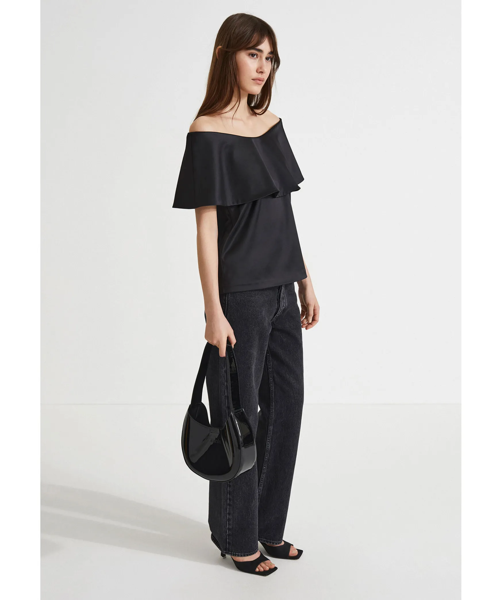 Svart Liten Vaska Med Glansig Finish Fran Stylein. Huvudfacket Stangs Med Tryckknapp. Embossad Logotyp. Vaskan Ar Forstarkt I Botten For Mer Stabilitet. Hojd: 23Cm, Bredd: 26Cm, Djup: 8Cm Axelrem: 50Cm